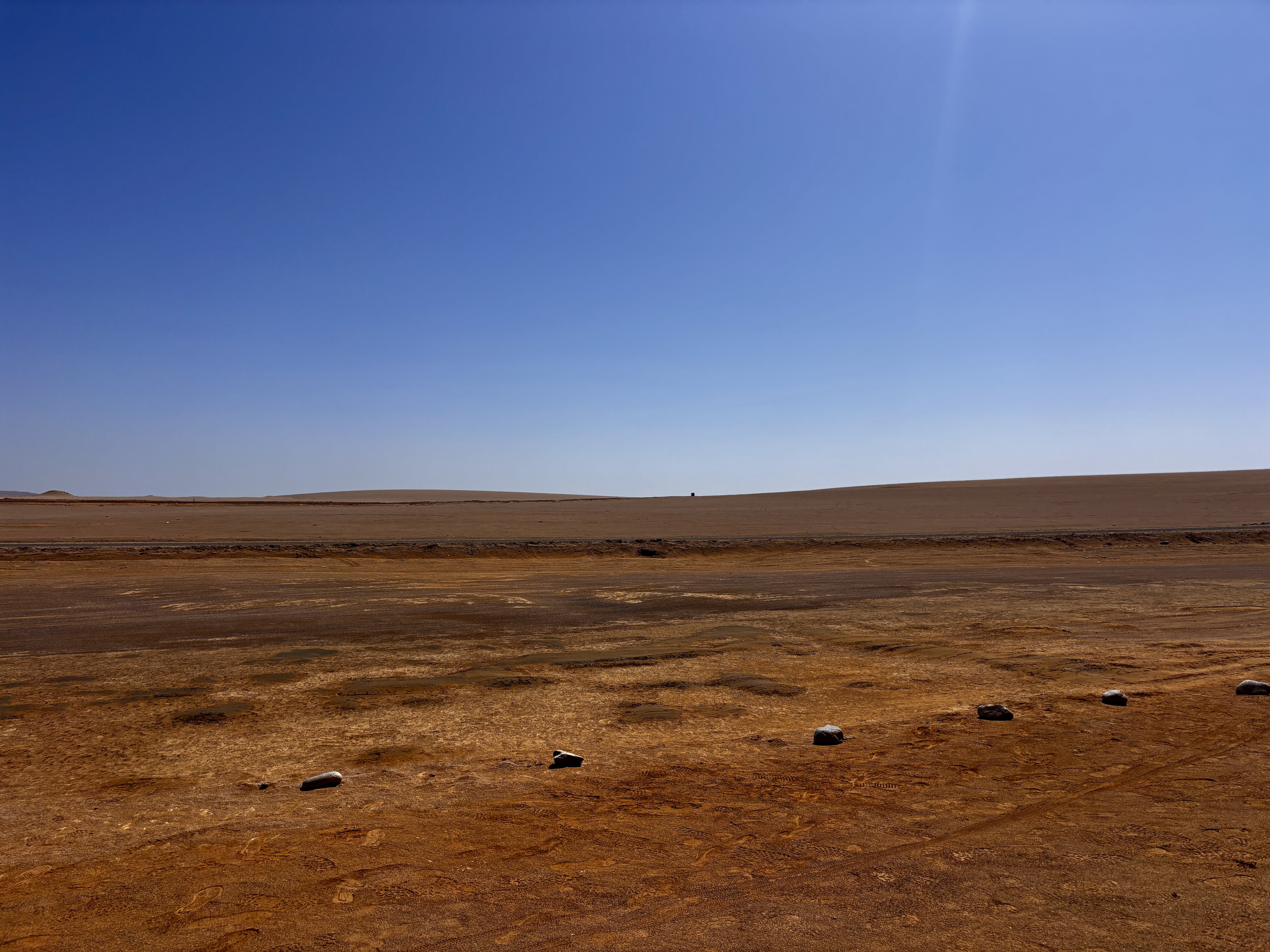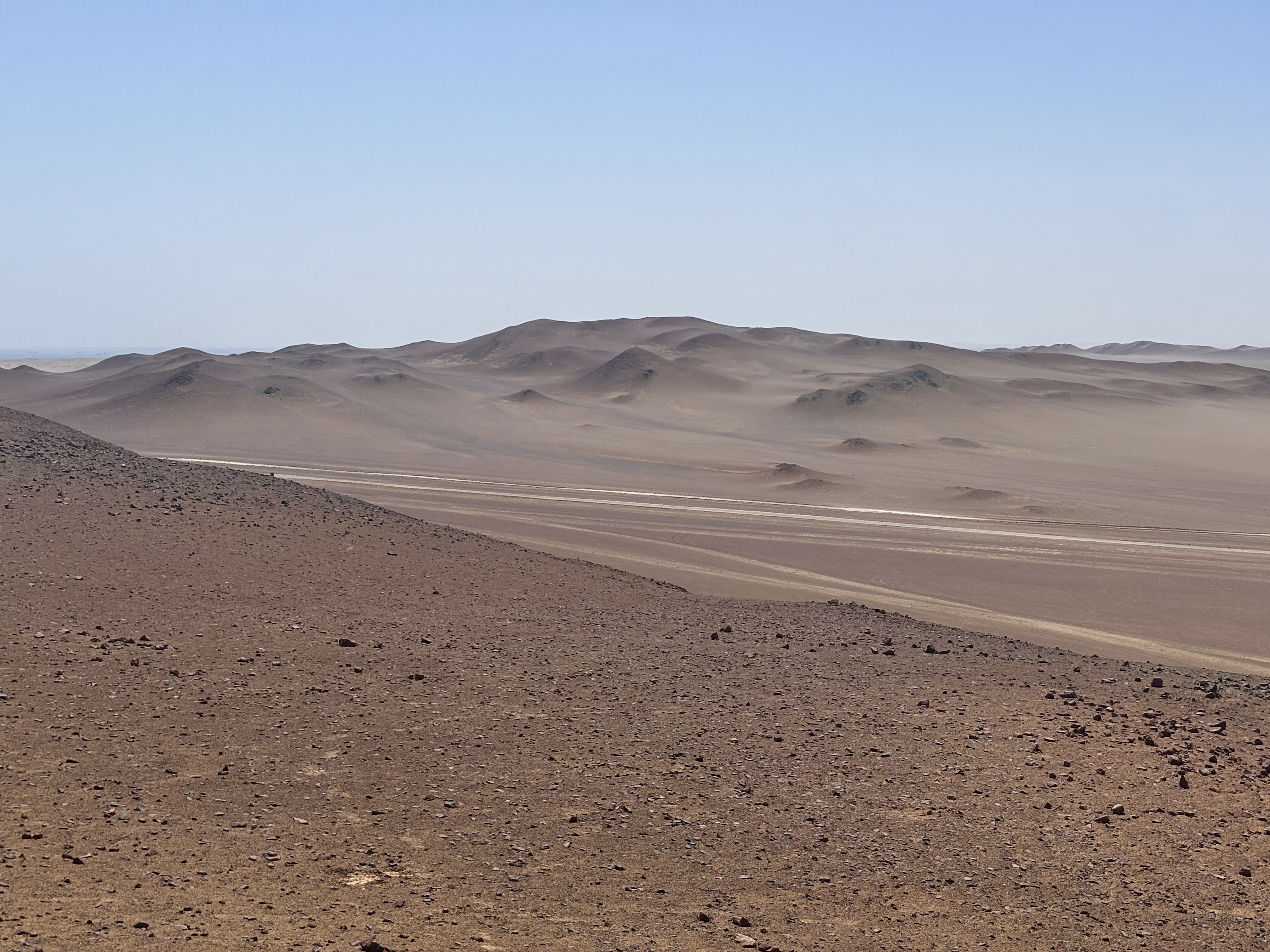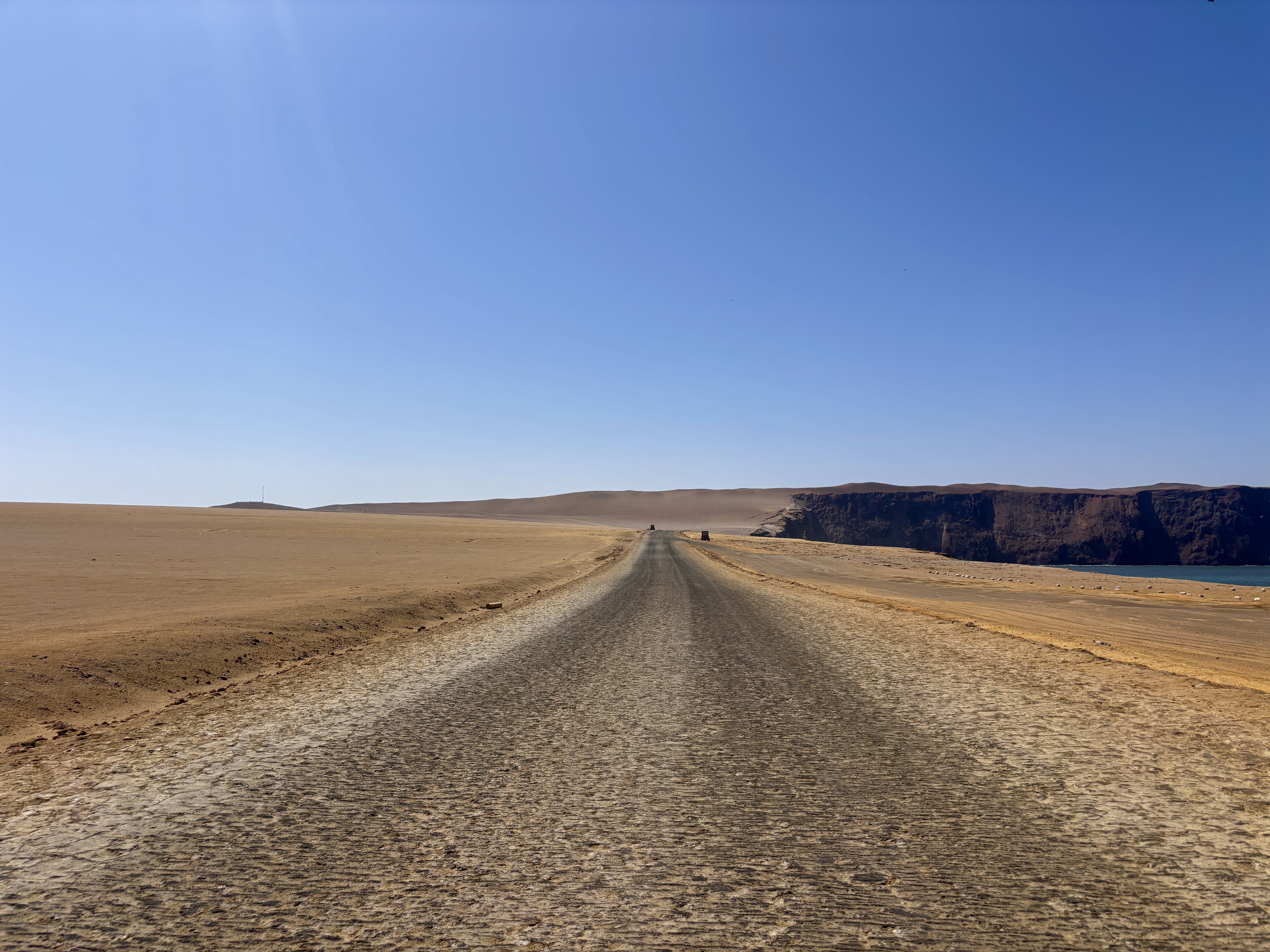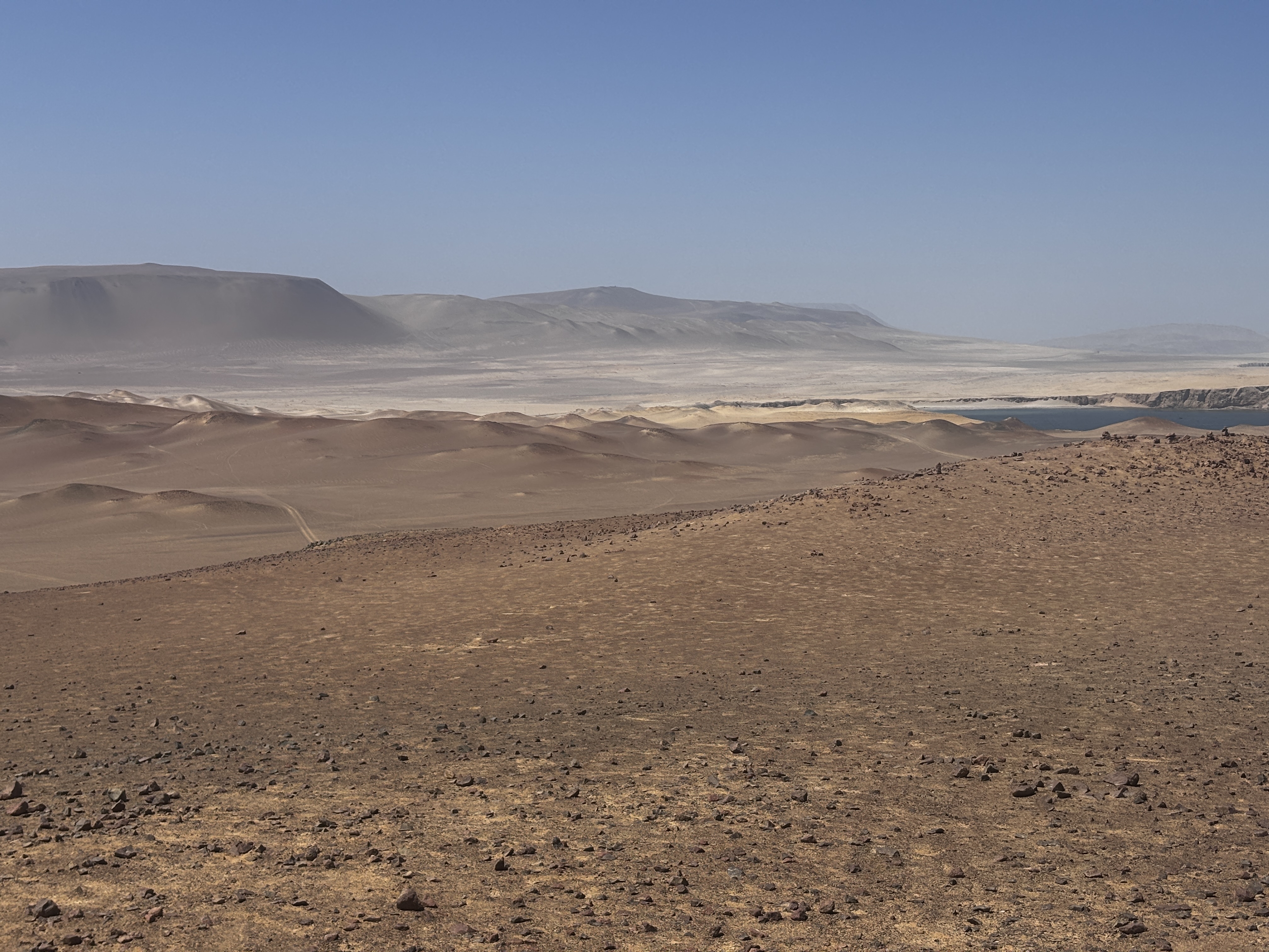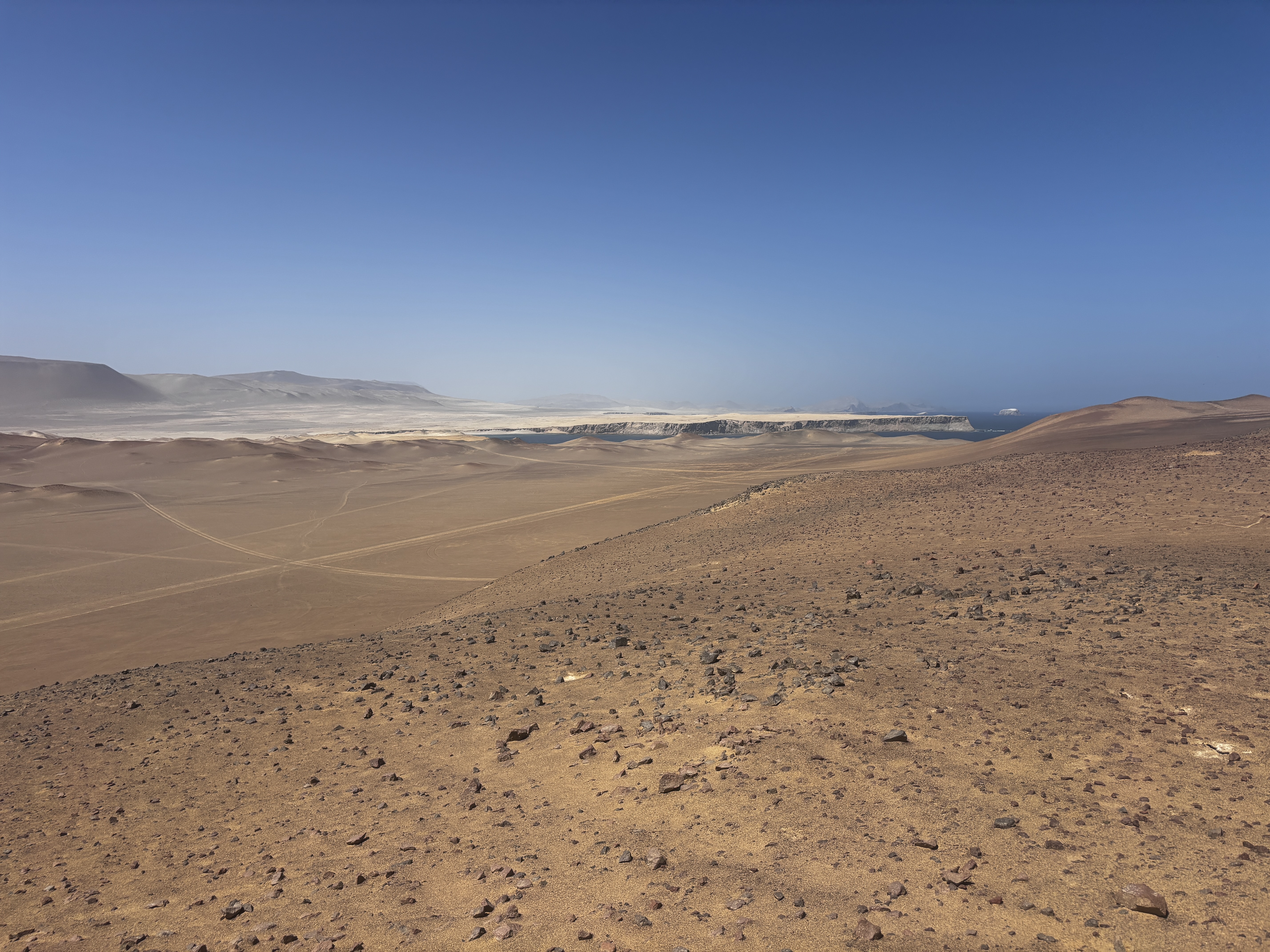 De Lima à Paracas, la route s’étire, longue et grise, entre le Pacifique sans éclat et des Andes qui s’effacent dans sa brume. On suit les traces des conquistadors sur les pistes où s’est enlisé leur soif avant qu’ils ne tournent main gauche vers les montagnes où se cachait l’Inca. Le désert avale l’horizon à grande bouchée. Des villages surgissent, s’effacent, éparpillés en mirages. À El Chaco battu par le vent, les étals débordent de souvenirs pressés : chapeaux de paille, cartes postales, céramiques bon marché — éclats figés du passé à peine glorieux. Au crépuscule, la lumière incendie les collines ; les ombres dessinent, sur les roches, les motifs funéraires des Paracas disparus qui dansait autrefois pour le soleil qui devaient sous leurs cris tomber, et il le faisait.