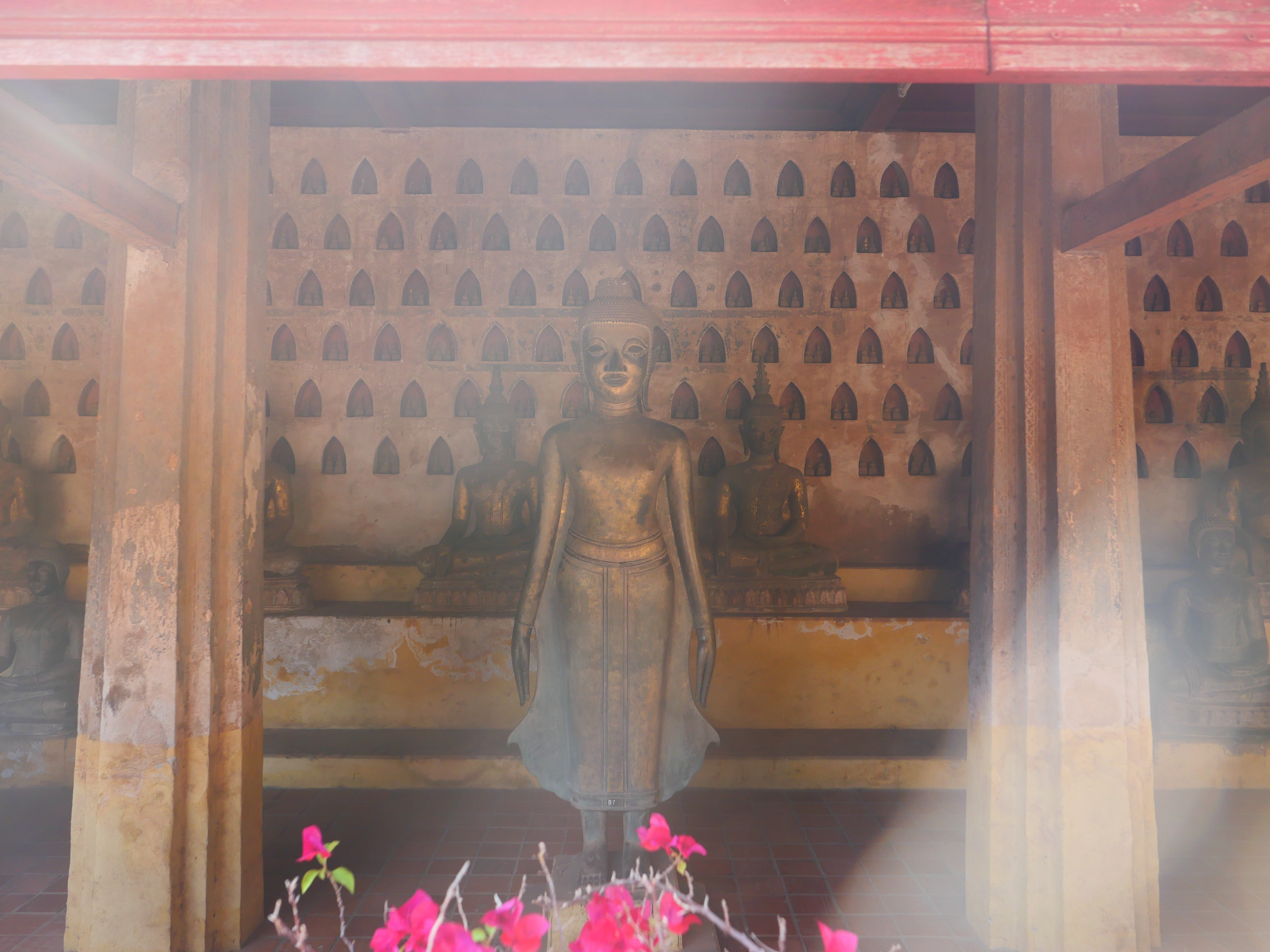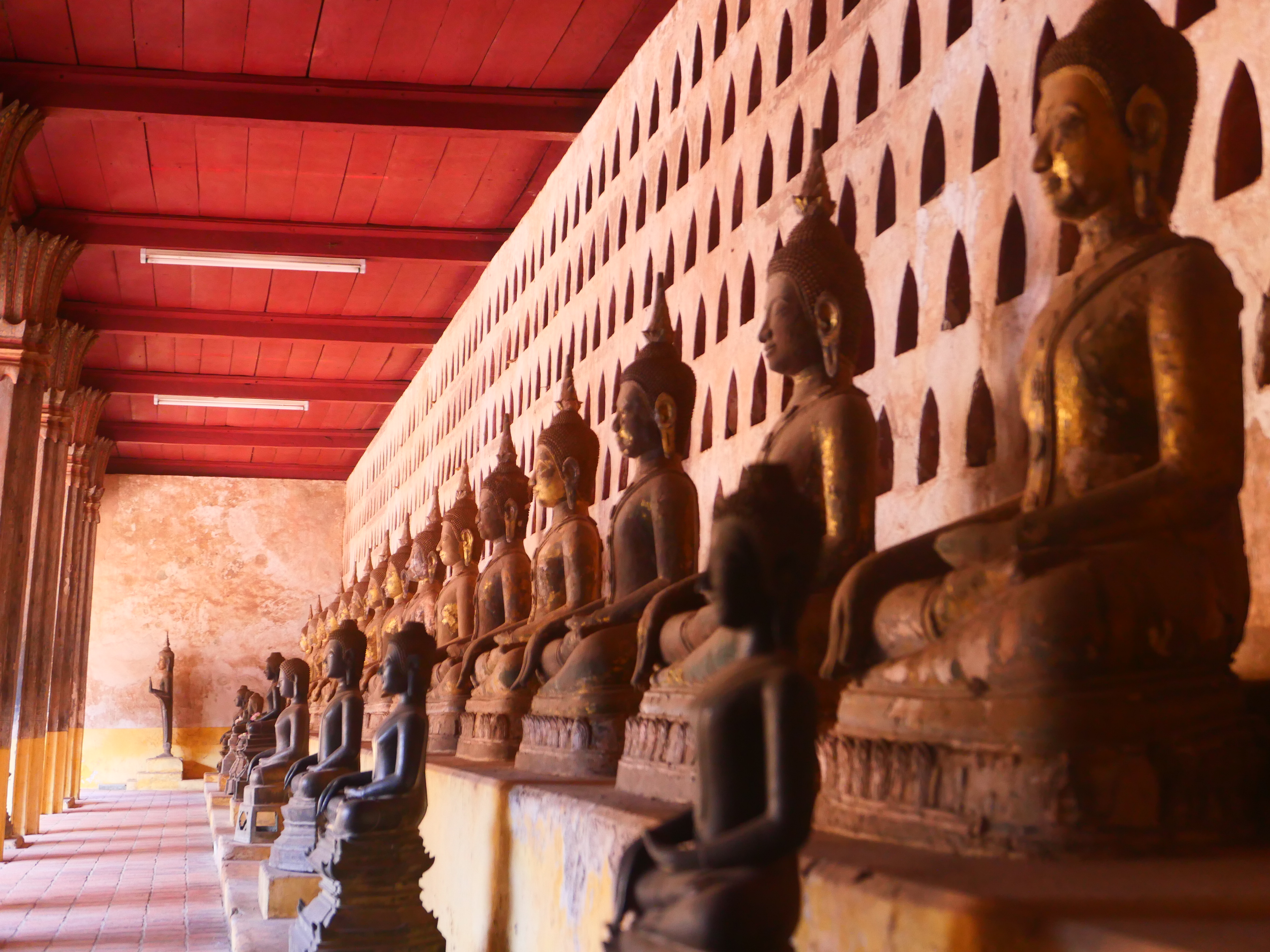 Le Wat Sisaket ouvre ses portes sur un autre monde. Derrière les murs de latérite, le silence est partout sous les galeries. Des milliers de Bouddhas veillent dans l’ombre, serrés dans leurs niches, regards ouverts sur un temps plus vaste que celui des hommes, souriant terriblement. Les murs soutiennent à peine les siècles – effritements, écaillements, stigmates d’invasions et de restaurations successives. Sous les piliers de bois sculpté, la lumière tamisée passe à peine. À l’intérieur, le temple semble une respiration retenue ; l’encens brûle plus lentement qu’ailleurs. Des fleurs de frangipanier jonchent les dalles.