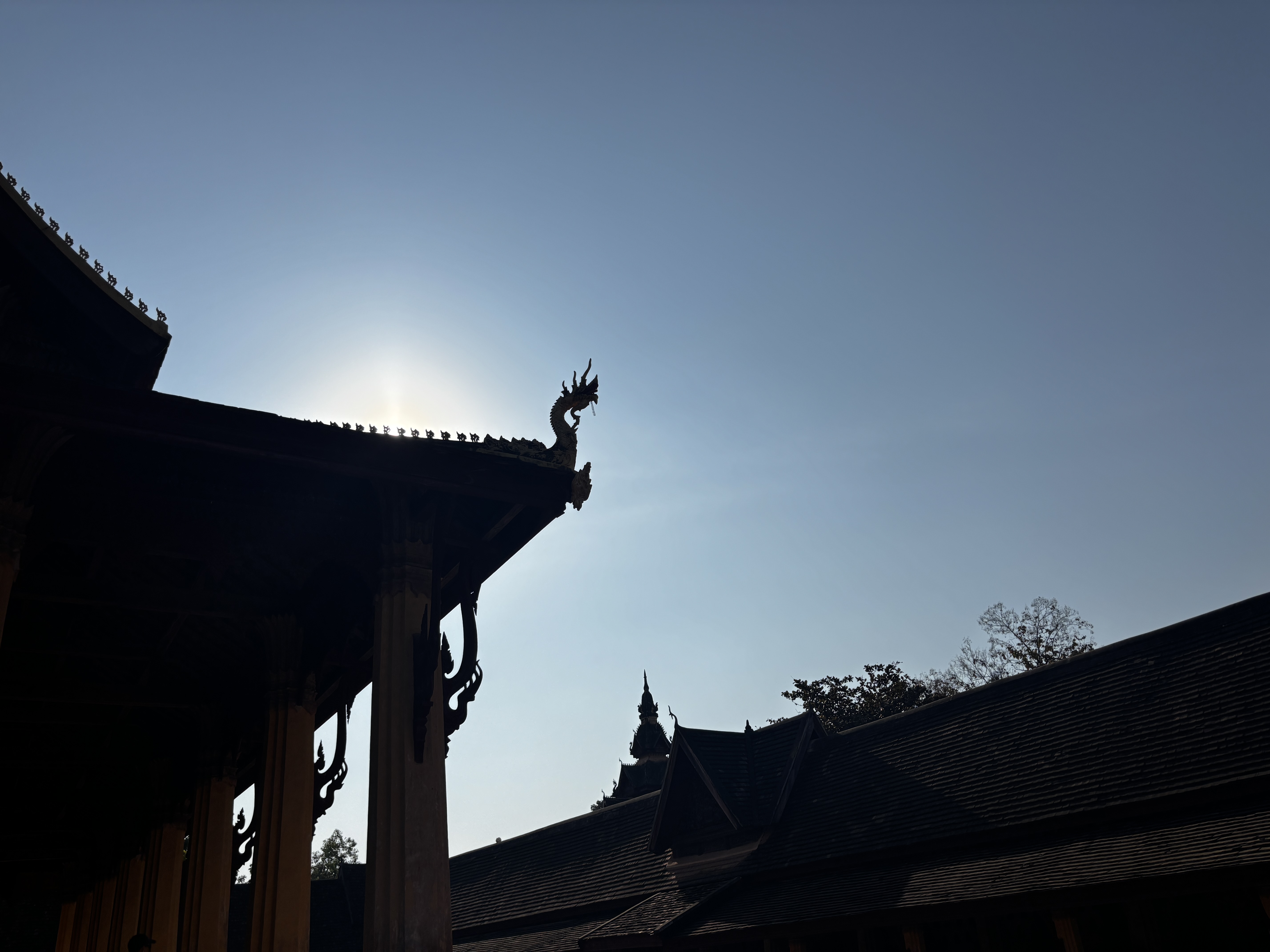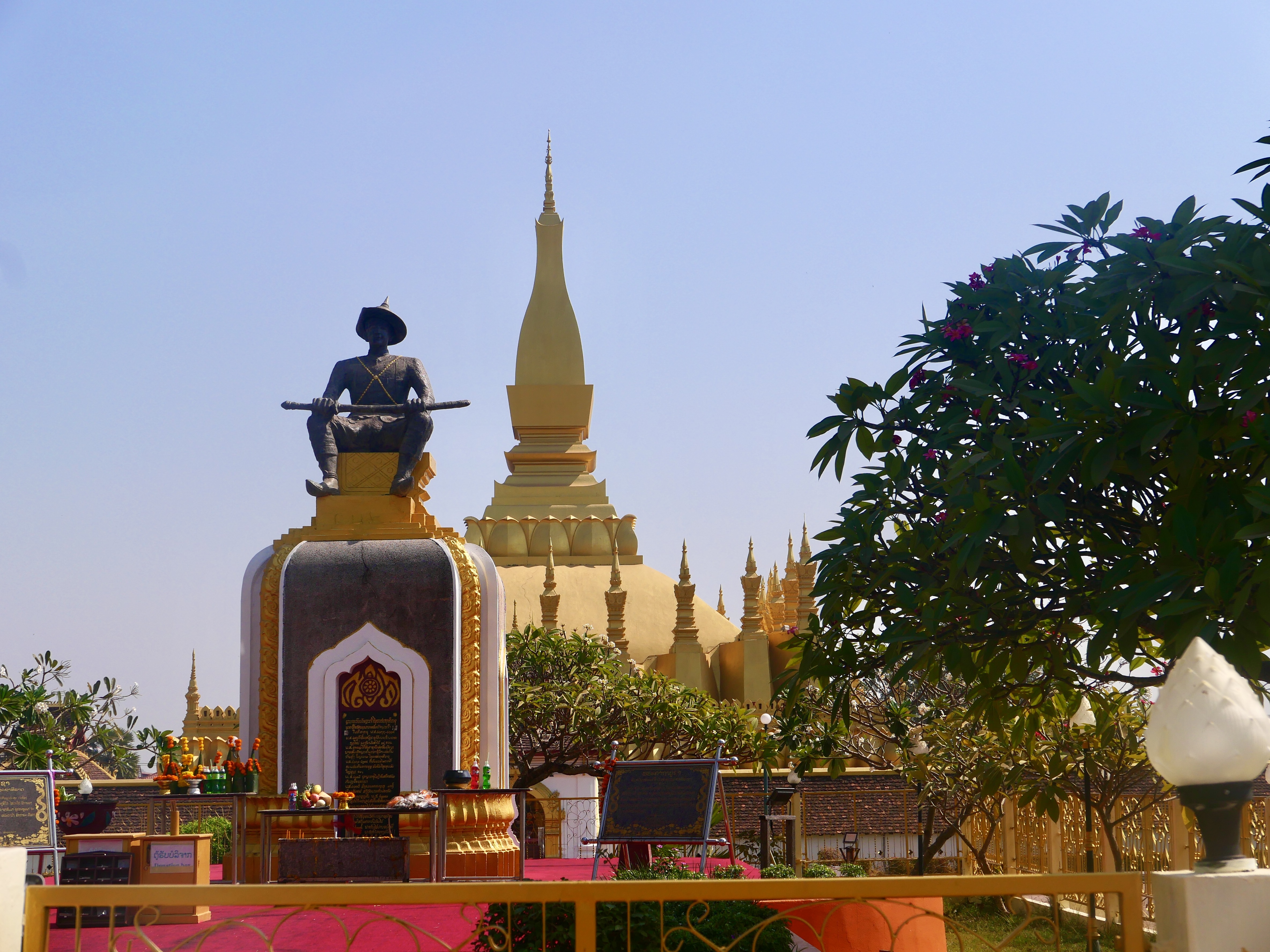 Le lendemain, le Pha That Luang flambe sous le ciel impitoyablement tranché et sans ombre. L’or s’enflamme dans la lumière, brûle plus qu’il ne resplendit. L’enceinte est fermée. On ne fera que tourner autour du sanctuaire. Ce qu’on voit aujourd’hui, on le sait bien, n’est qu’une tentative de retenir un passé qui s’était déjà effondré, un reflet reconstruit. Autour du stupa, des statues brisées s’effacent. Un enfant pleure. Son sanglot se mêle aux appels à la prière. Tout ce confond dans l’air épais.