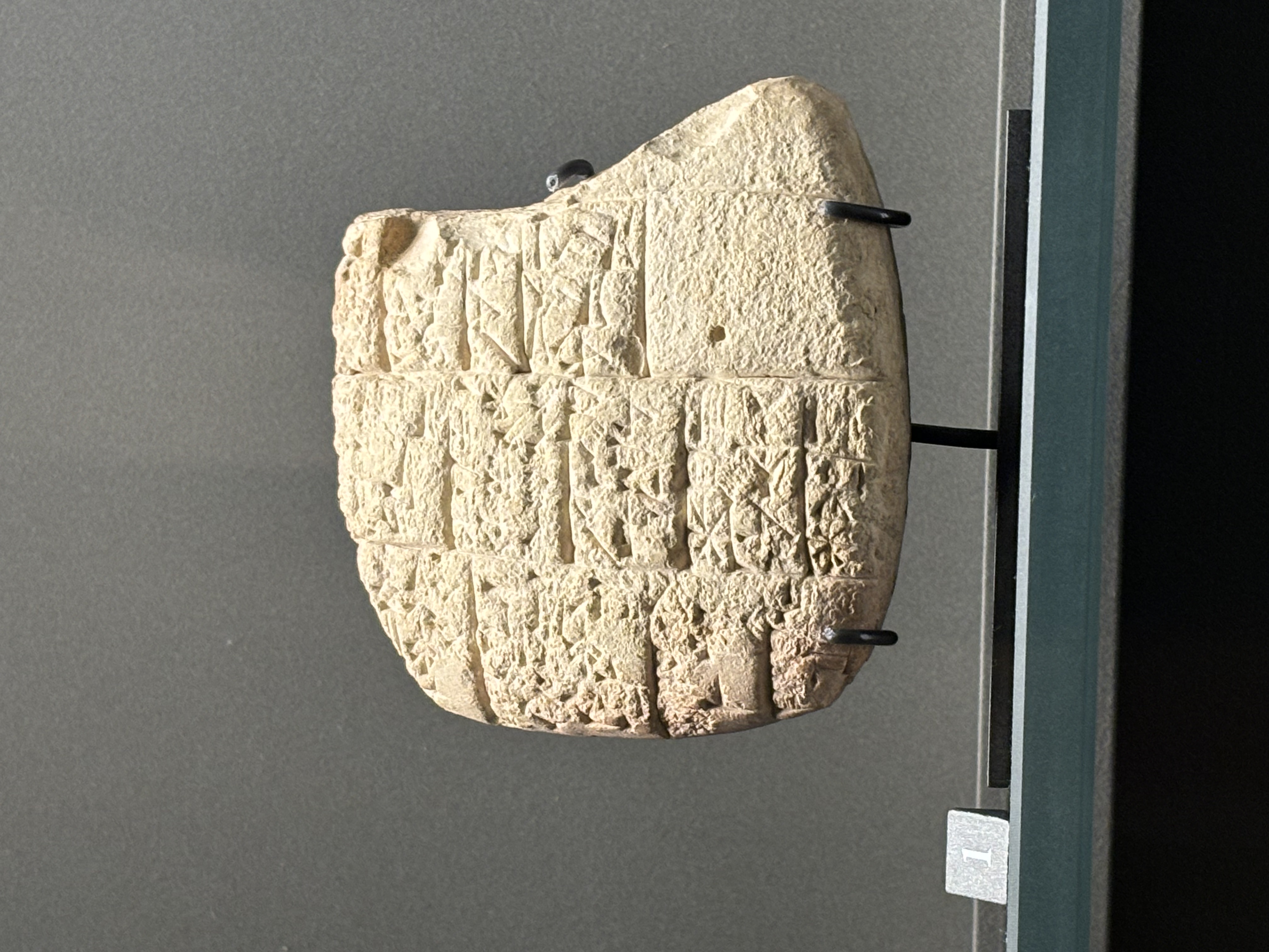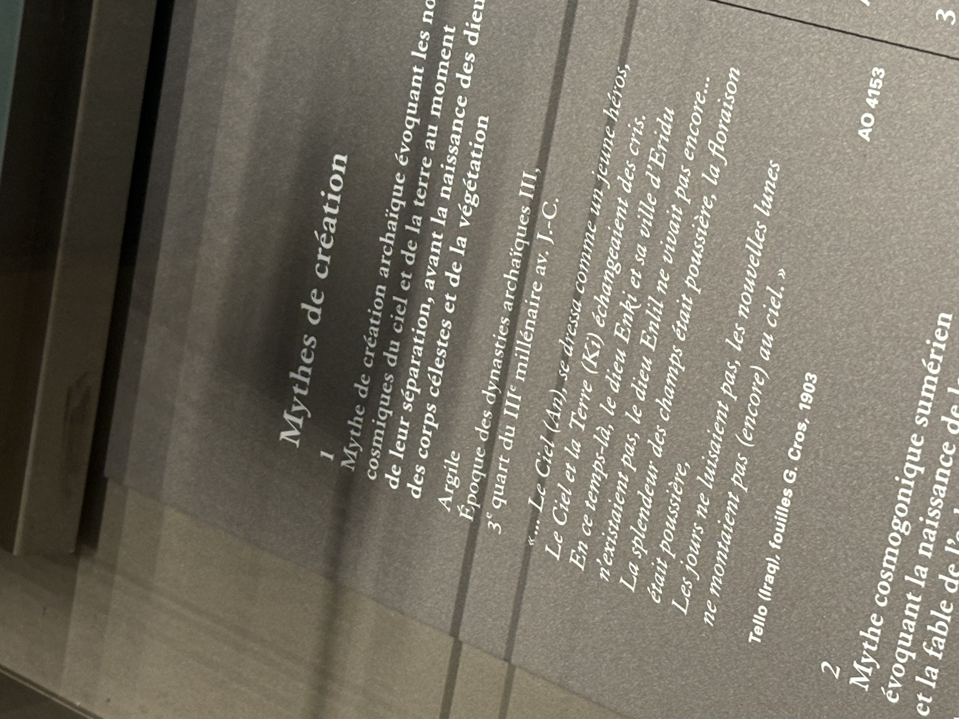 La salle des tablettes. Briques de terre minuscules et fendues qui portent l’immense – tiennent dans la paume d’une main cependant. Annales des règnes, listes sèches, qui bouleversent plus que les colosses. La fragilité du monde inscrite dans la terre. Signes qui disent : année où Hammurabi creusa un canal, année où il prit une ville. Des millénaires réduits à quelques gestes qui résonnent là comme s’ils venaient de s’écrire. Et c’est le cas. Et dans la vitrine d’à côté, d’autres gestes encore, plus anciens et foudroyants : tablettes qui rapportent l’Enūma eliš, récit babylonien des premiers temps – quand le ciel n’était pas encore séparé de la terre, quand l’eau douce et l’eau salée s’entremêlaient dans le chaos premier. Sur des fragments d’argile tachés, le combat de Marduk contre Tiamat s’inscrit, la fin des temps aux premiers mots, la naissance des dieux, et l’arrachement du monde à la nuit — et la nuit qui se dit dans les mots du jour. Premier récit des commencements du récit. Dans ce silence de verre, le frottement du roseau sur l’argile humide. Le monde qui s’invente chaque seconde à nouveau devant soi.