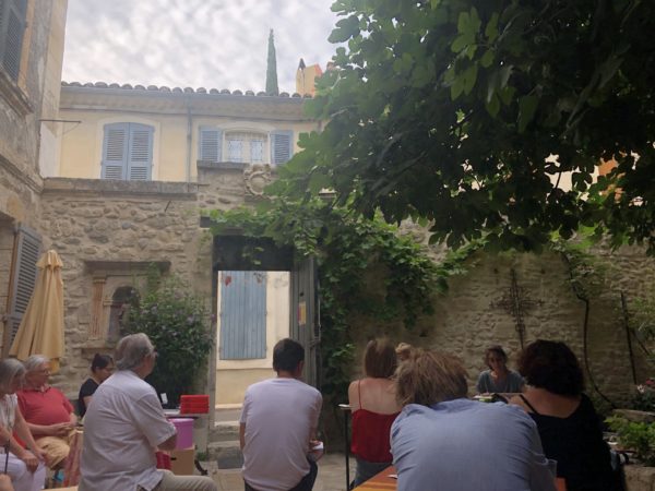 Au milieu, un figuier. On voit l’absence de nuages à travers ses branches. La cour intérieure est à ciel ouvert. Quelques chaises. La rumeur d’Avignon ? Elle est loin. Nous aussi. Mais on est tout près aussi : à quelques mètres de nous, ceux qui disent les textes nous regardent dans les yeux. C’est le If : ni off ni in. Simplement l’hypothèse d’emprunter une voie plus libre. Se suivent et ne se ressemblent pas des lectures, des paroles : oui, on prend la parole où elle est, et elle est là, au milieu de la cour au pied du figuier. Retour sur un premier jour, regards sur une autre manière de penser un théâtre sans le théâtre. Le if, ni hors-lieu, ni tiers-lieu : comme un autre lieu.