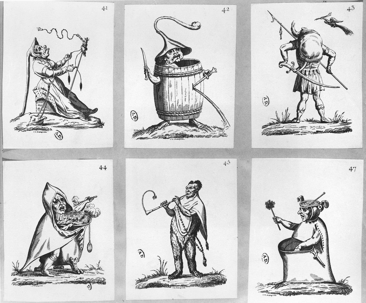 Depuys ie veidz qu’elle deschaussa un de ses esclos, (nous les nommons Sabotz) mist son davantau sus sa teste, comme les prebstres mettent leur amict quand ilz voulent messe chanter : puys avecques un antique tissu riolé, piolé, le lia soubs la guorge. Ainsi affeublée tira un grand traict du bourrabaquin, print de la couille belinière trois carolus, les mist en trois coques de noix, & les posa sus le cul d’un pot à plume, feist trois tours de balay par la cheminée, iecta on feu demy fagot de bruière, & un rameau de laurier sec. Le consydera brusler en silence, & veid que bruslant ne faisoit grislement ne bruyt aulcun. Adoncques s’escria espovantablement, sonnant entre les dens quelques motz barbares & d’estrange termination.