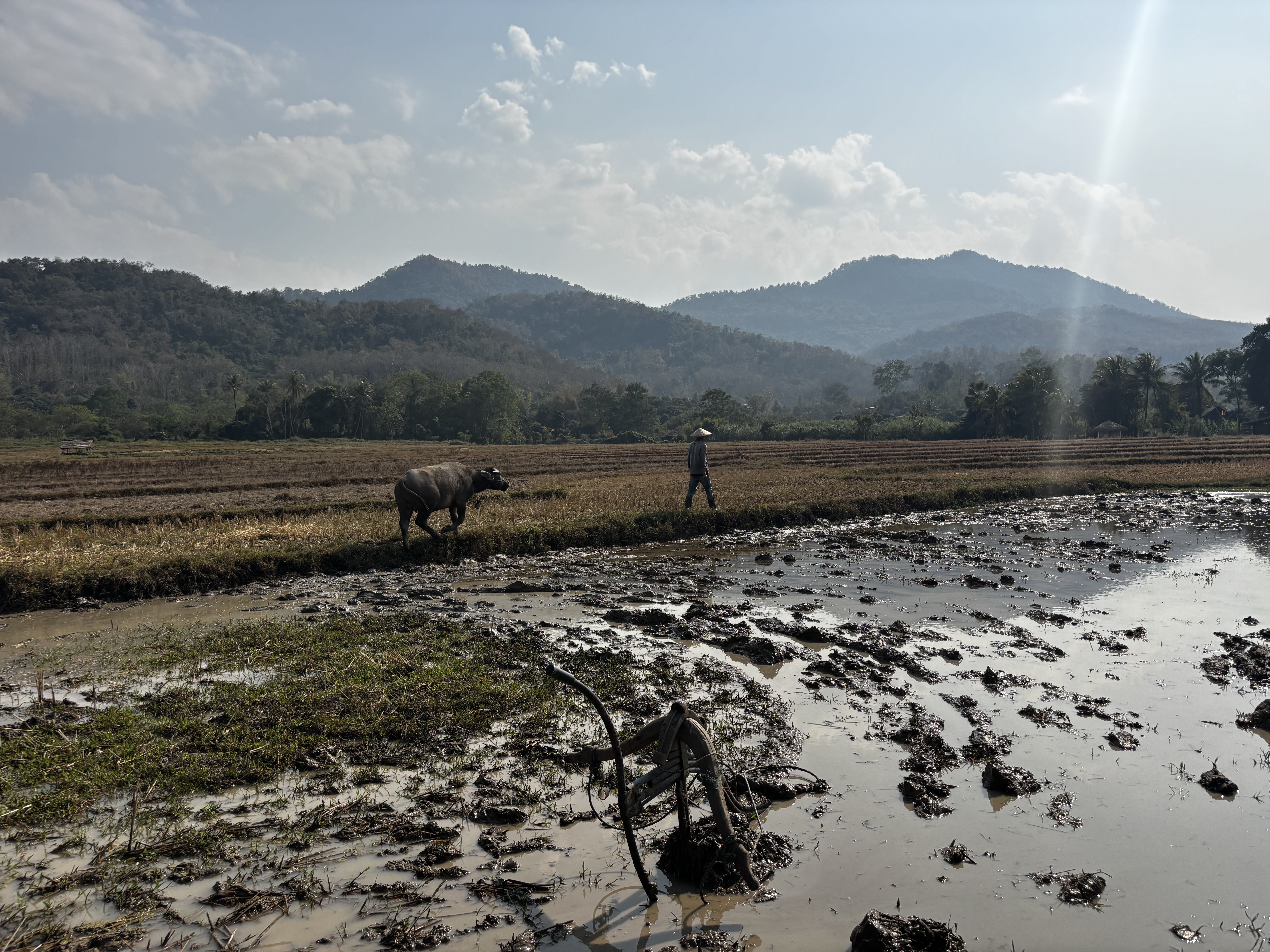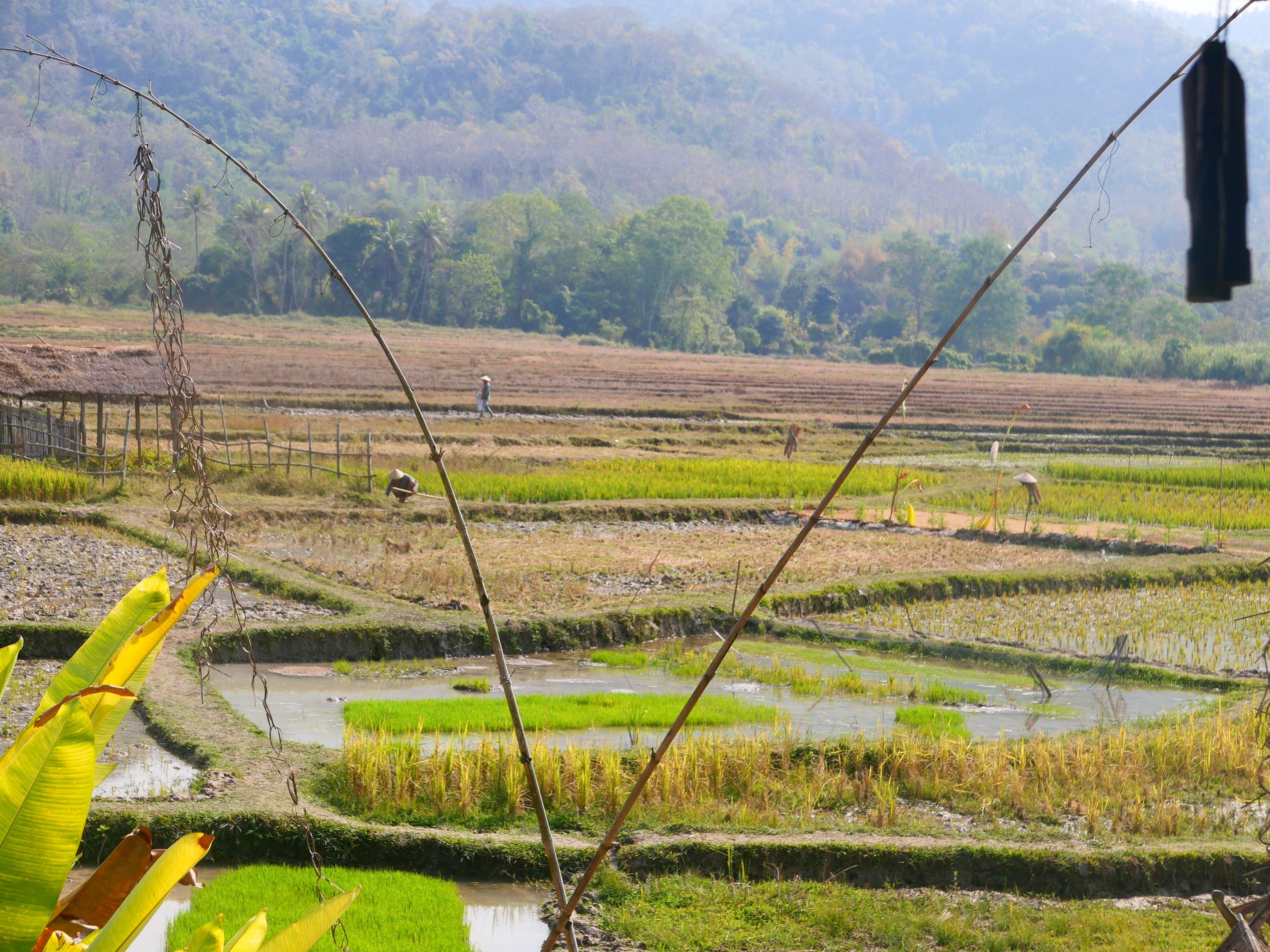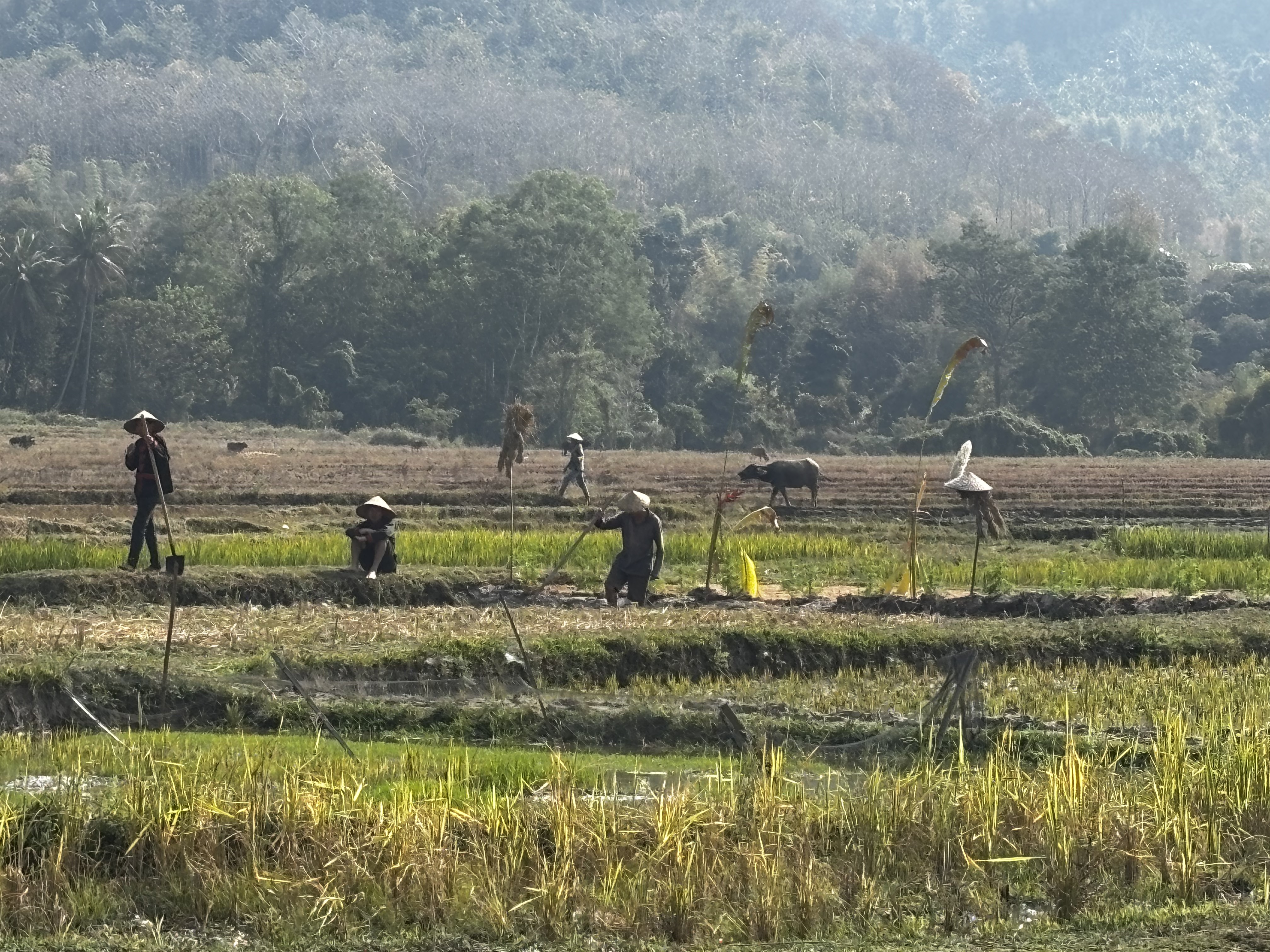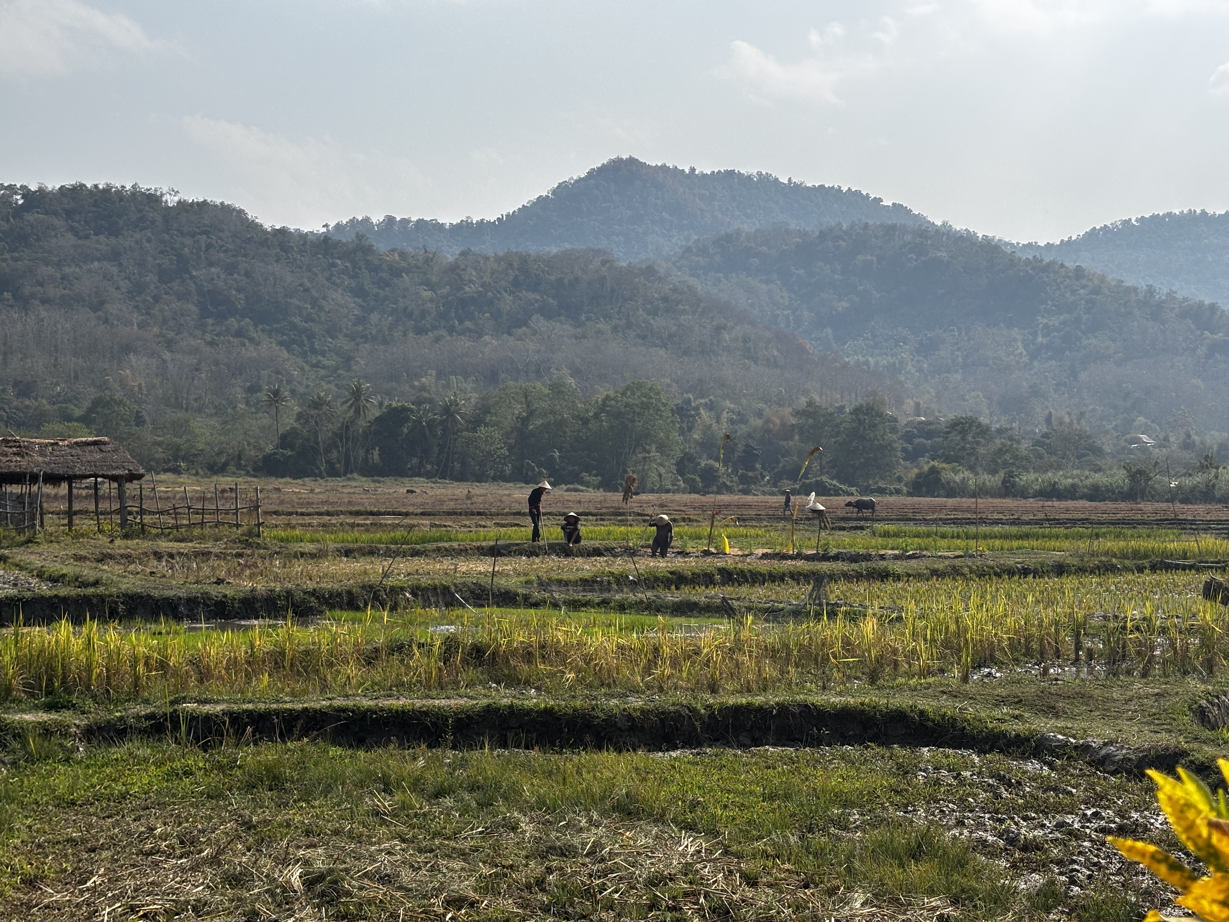 Rizières à perte de vue, courbes vertes sous le ciel lourd. Ban Phong Van, banlieue nord de Luang Prabang sous les montagnes parmi les peuples entremêlés dans la brume ce matin-là. Sentiers de terre cendrée entre les terrasses. Pieds nus dans la boue, dos courbés sur l’horizon : quelques gestes répétés depuis mille ans au moins. L’or blanc des montagnes noue ensemble, fragile, plaines et sommets, villes et terres débordées par le fleuve, les corps, les ventres et les pensées. Quelques voix, la ville si proche nourrie par la sueur des montagnards. Patience d’arracher la terre à la terre de ceux qui savent que c’est davantage que leur vie qui en dépend. Le khao nièo prend racine dans la terre gorgée d’eau, on l’arrache avec dévotion. Dans les villages, les femmes justement préparent les offrandes. Des boulettes de riz sur les autels des pagodes. Les buffles d’eau labourent la terre si lentement, mêlent leur souffle à la brume des rizières pour lever tout ce brouillard où tout se confond.