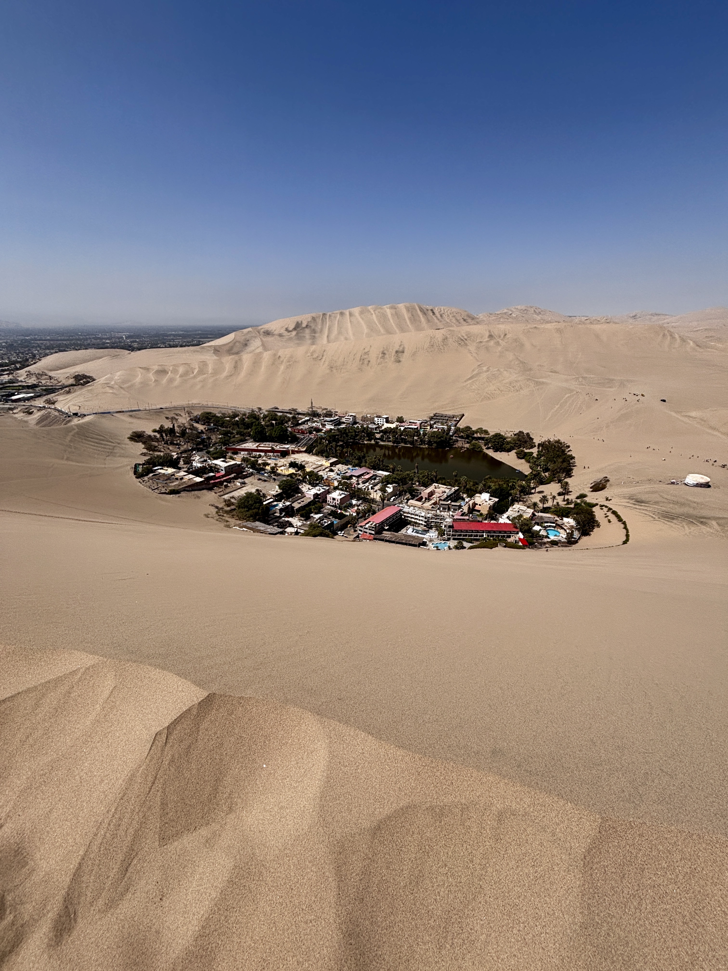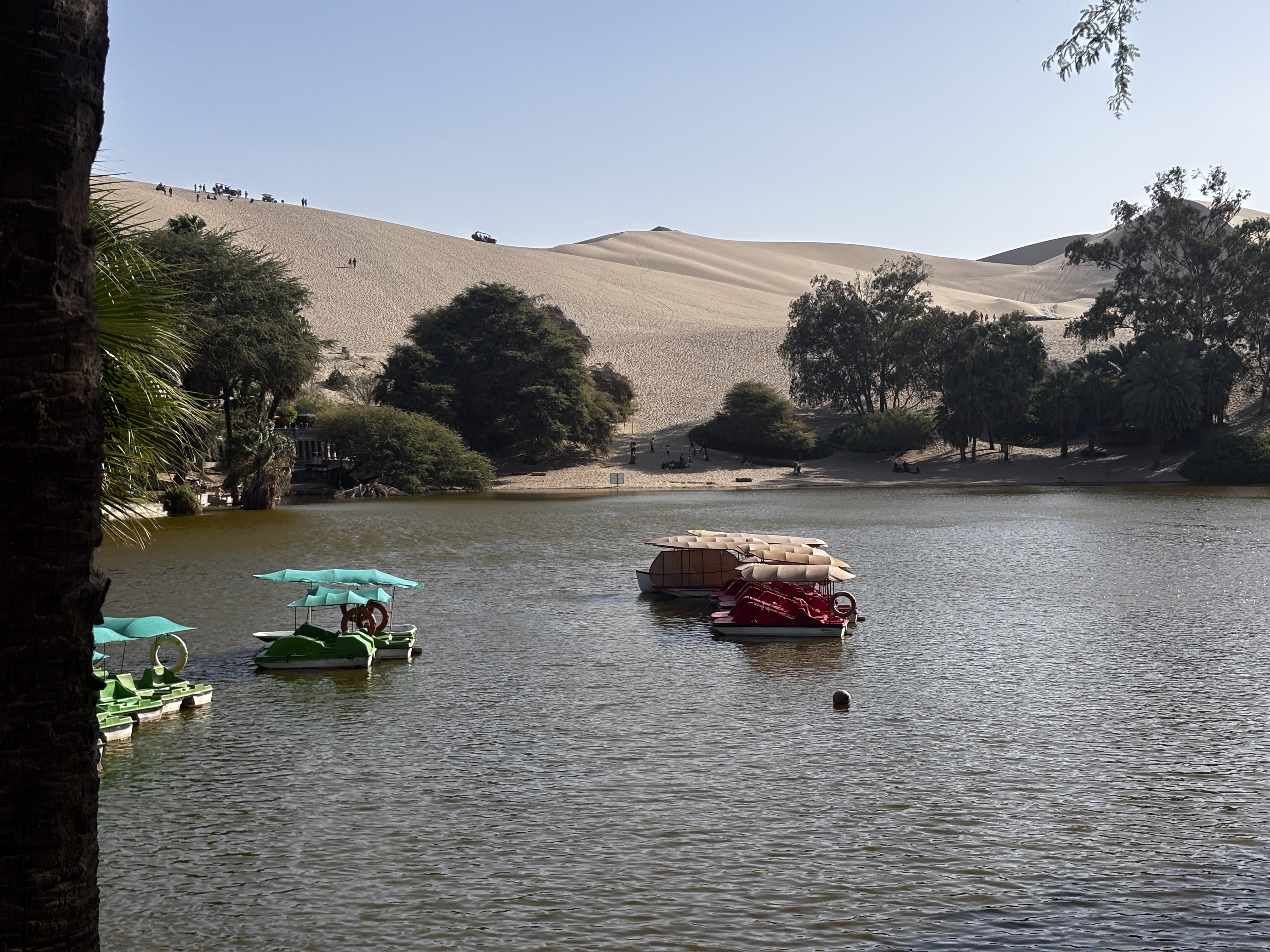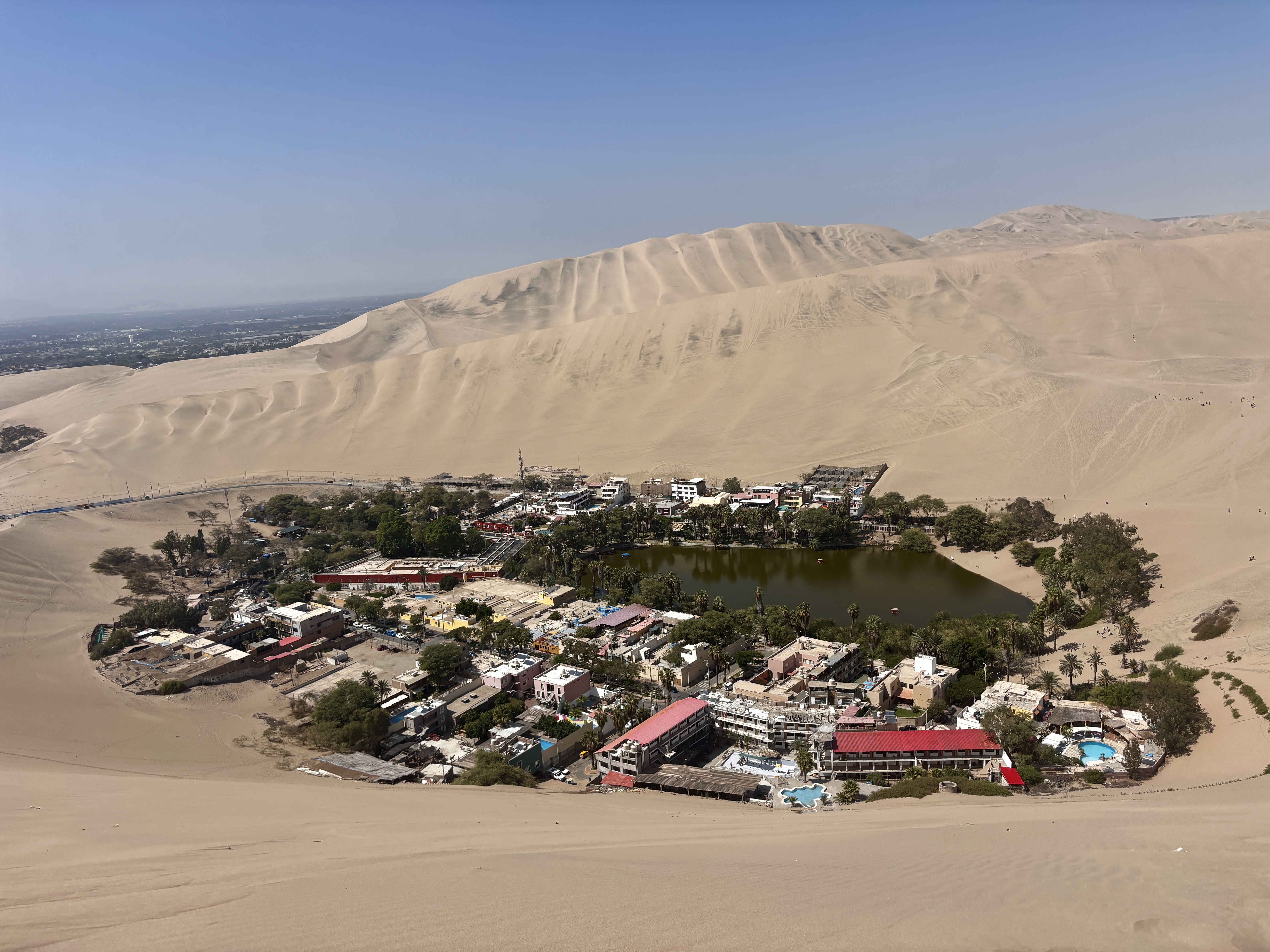 Huacachina. Semblant de ville en boucle autour d’un étang vert comme un mirage persistant, cernée de bars vides et d’hôtels absurdes, plantée là entre désert et béton : s’étonner chaque seconde que l’oasis existe vraiment, et plus encore qu’on ait voulu y croire assez pour construire son rêve humain.