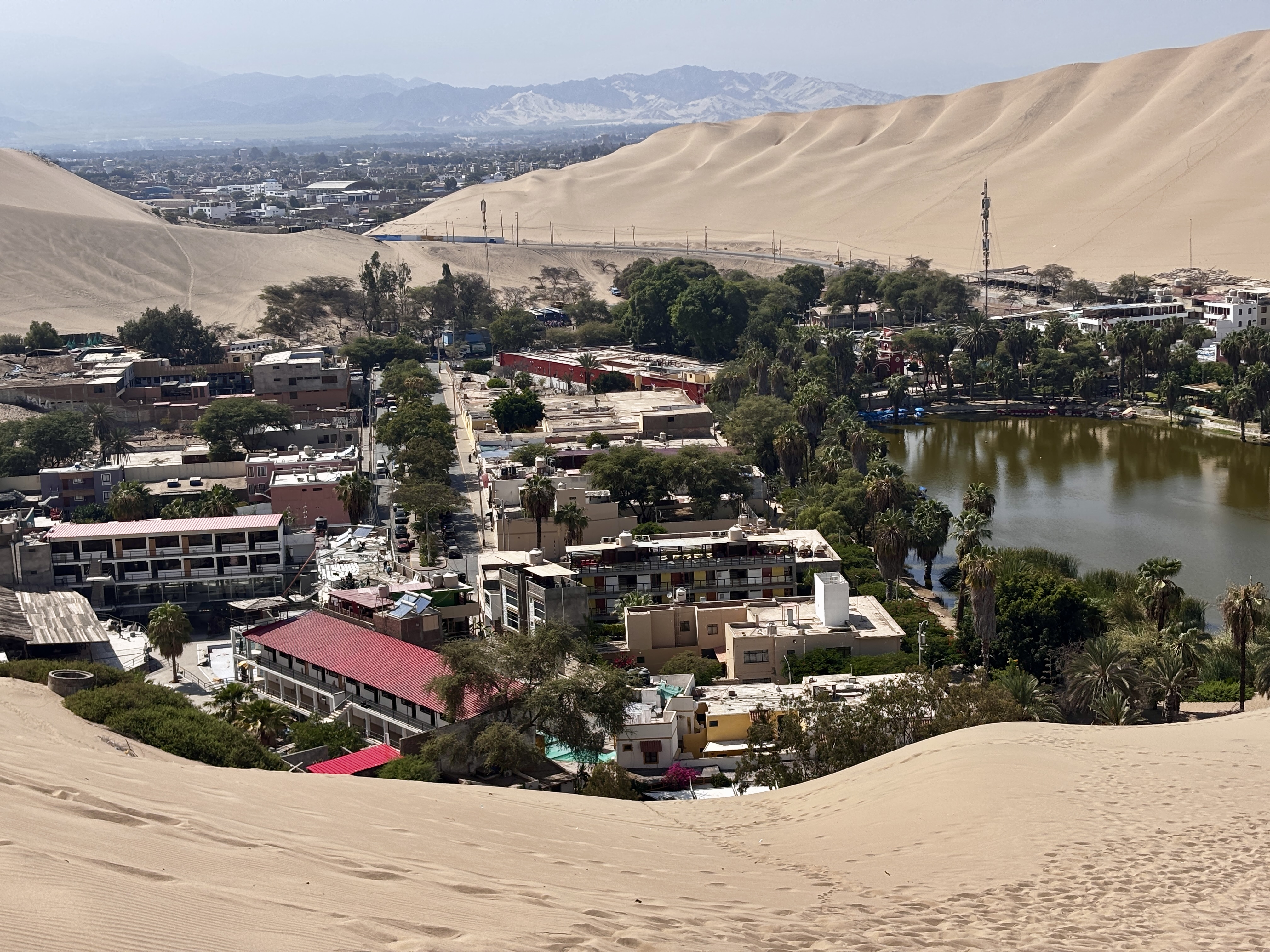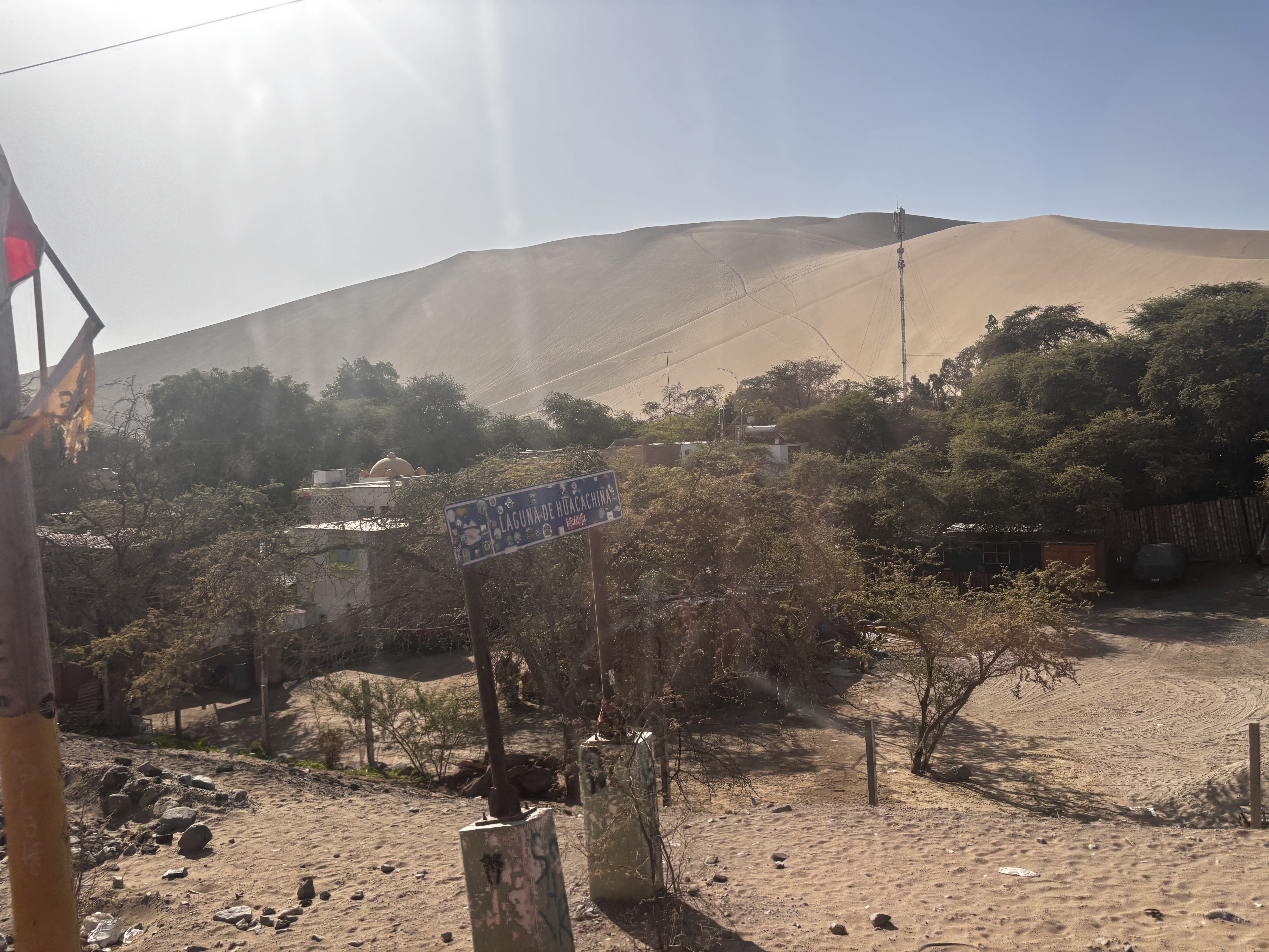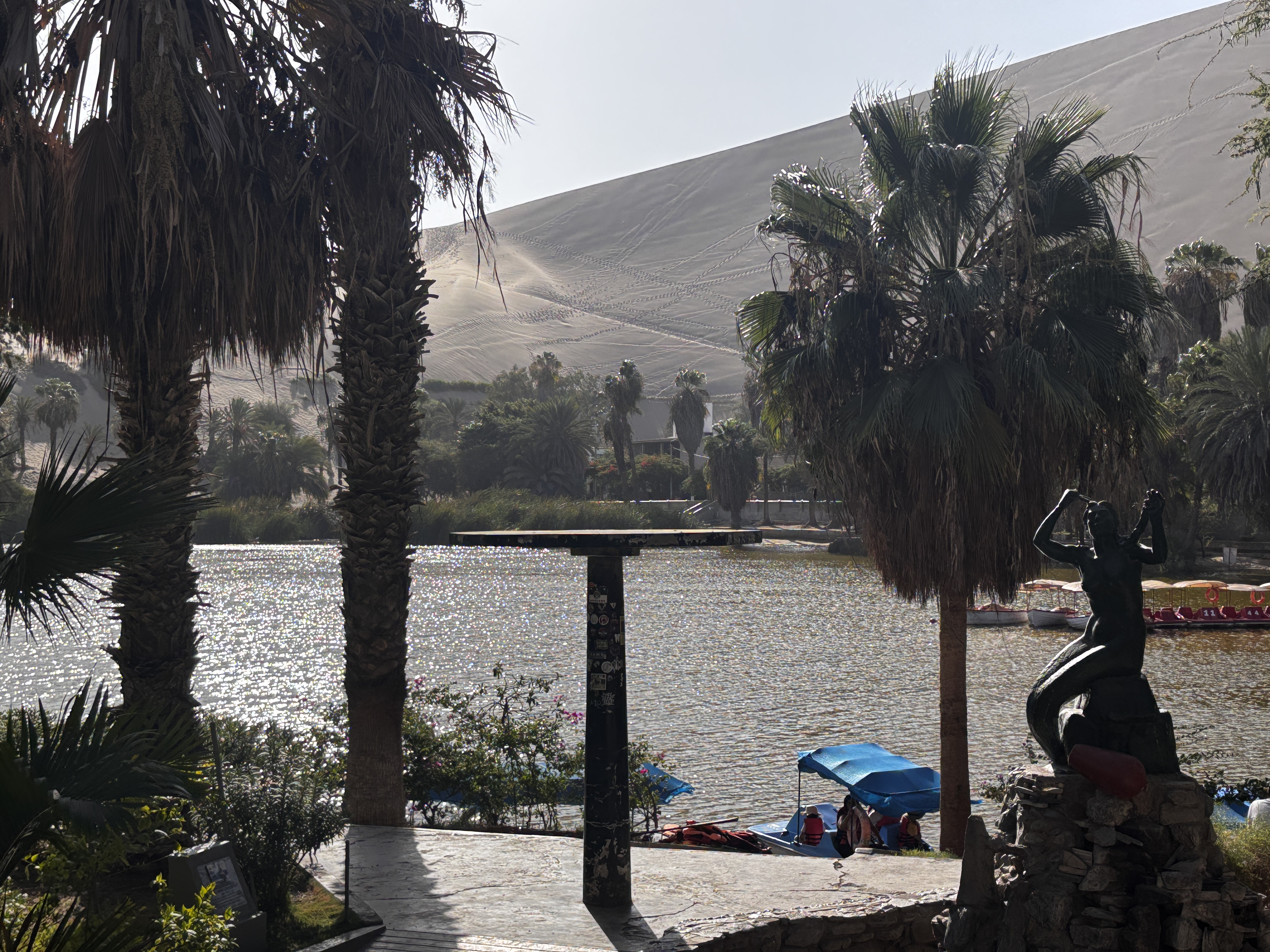 Huacachina. Semblant de ville en boucle autour d’un étang vert comme un mirage persistant, cernée de bars vides et d’hôtels absurdes, plantée là entre désert et béton : s’étonner chaque seconde que l’oasis existe vraiment, et plus encore qu’on ait voulu y croire assez pour construire son rêve humain.
