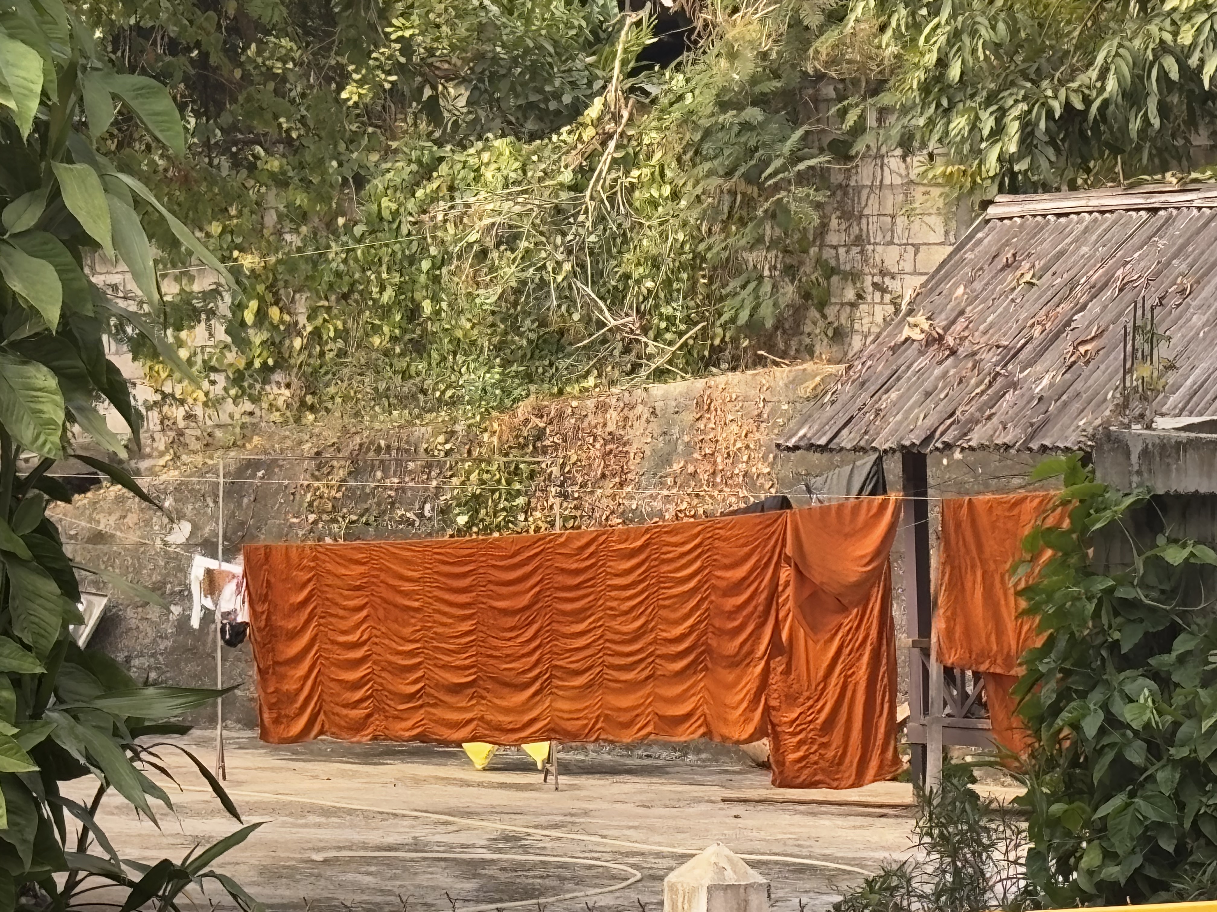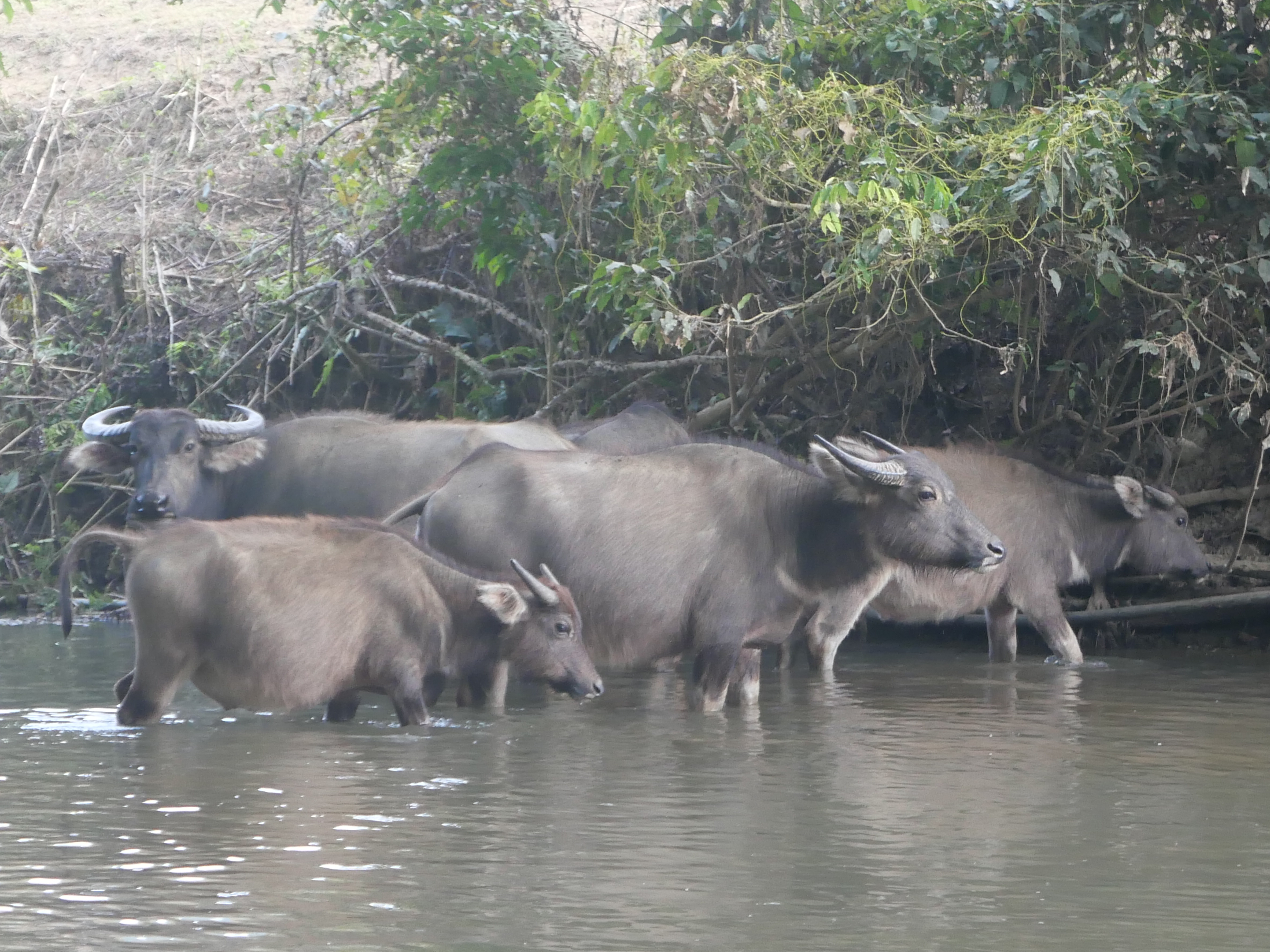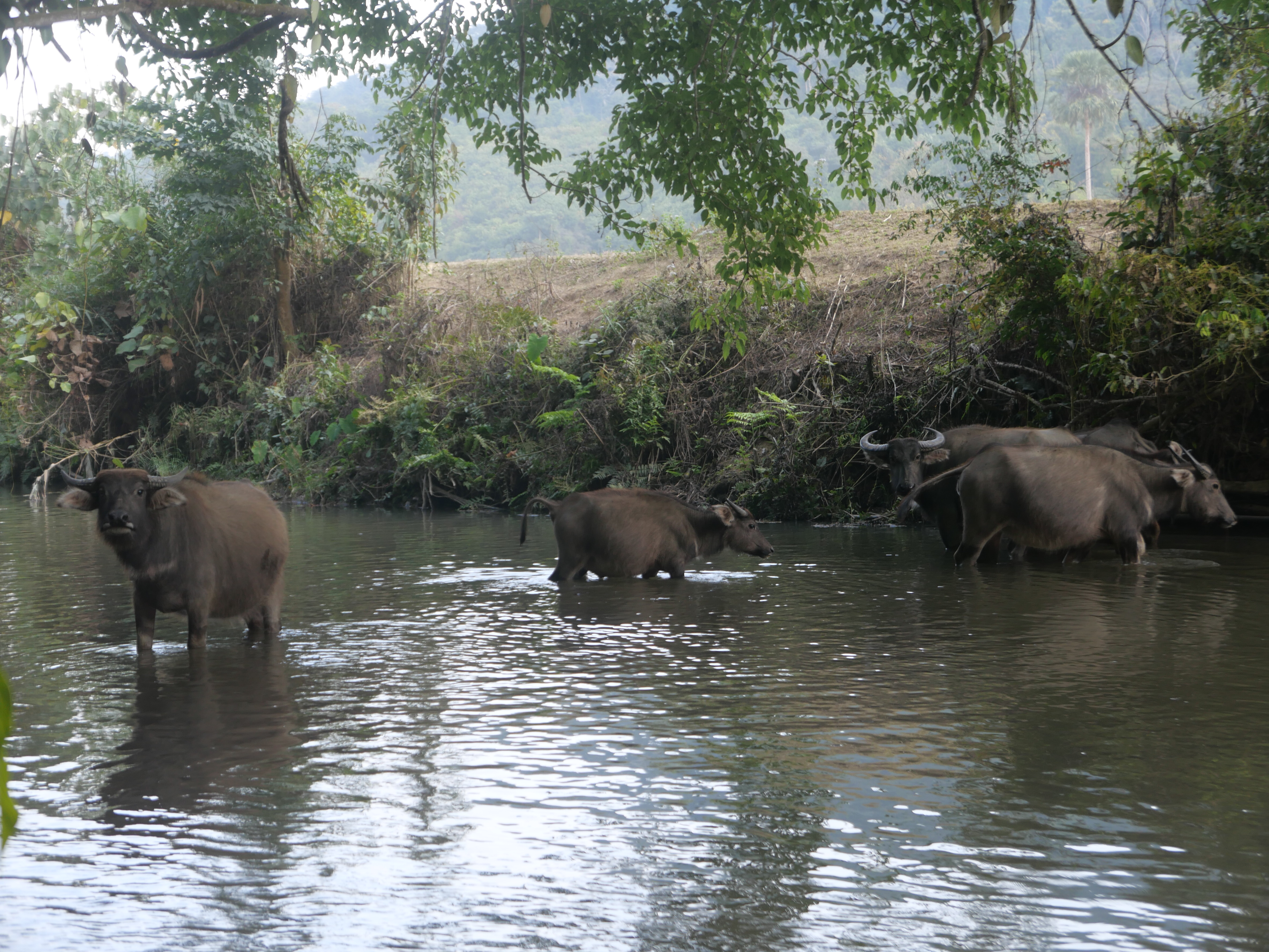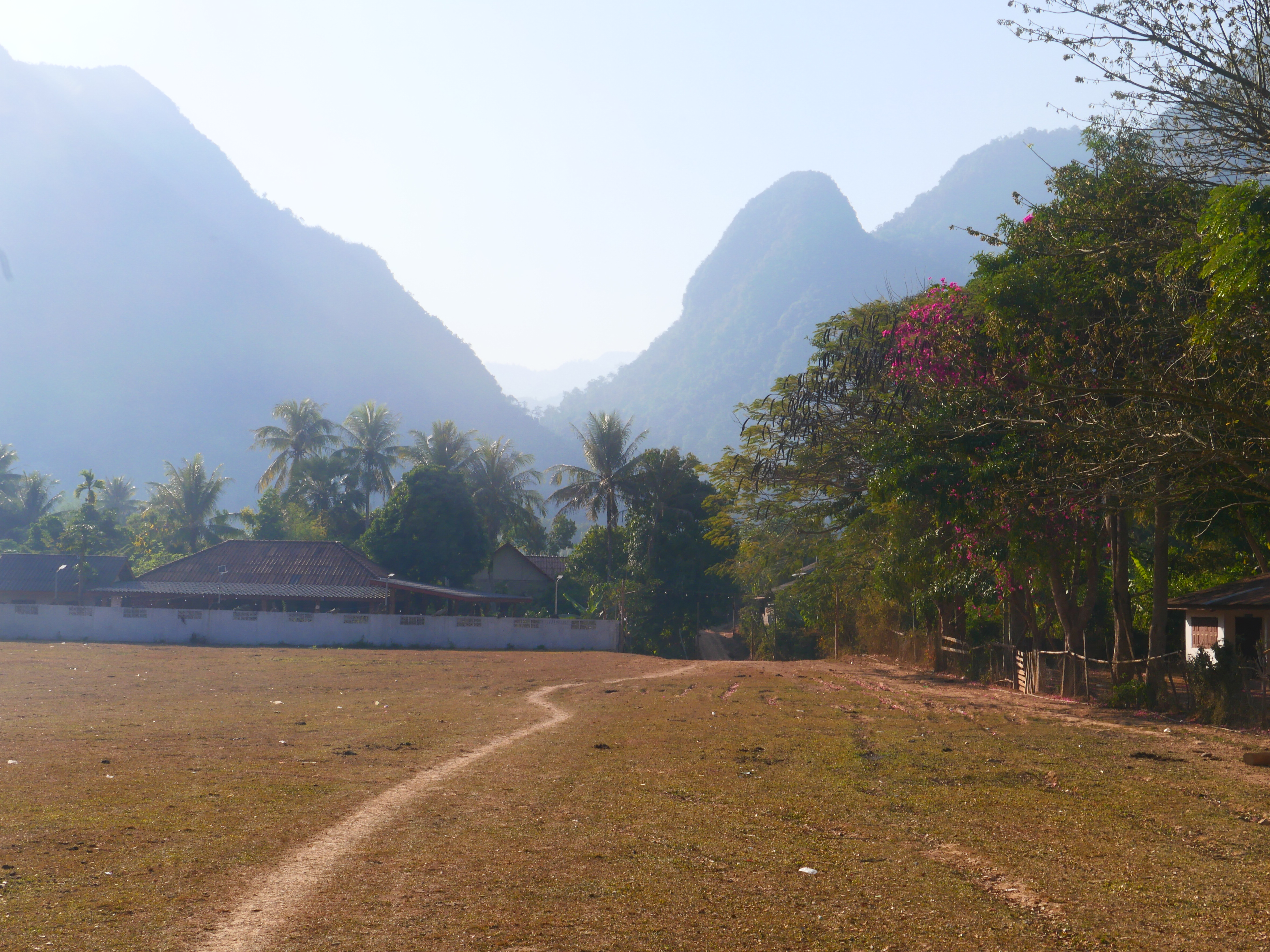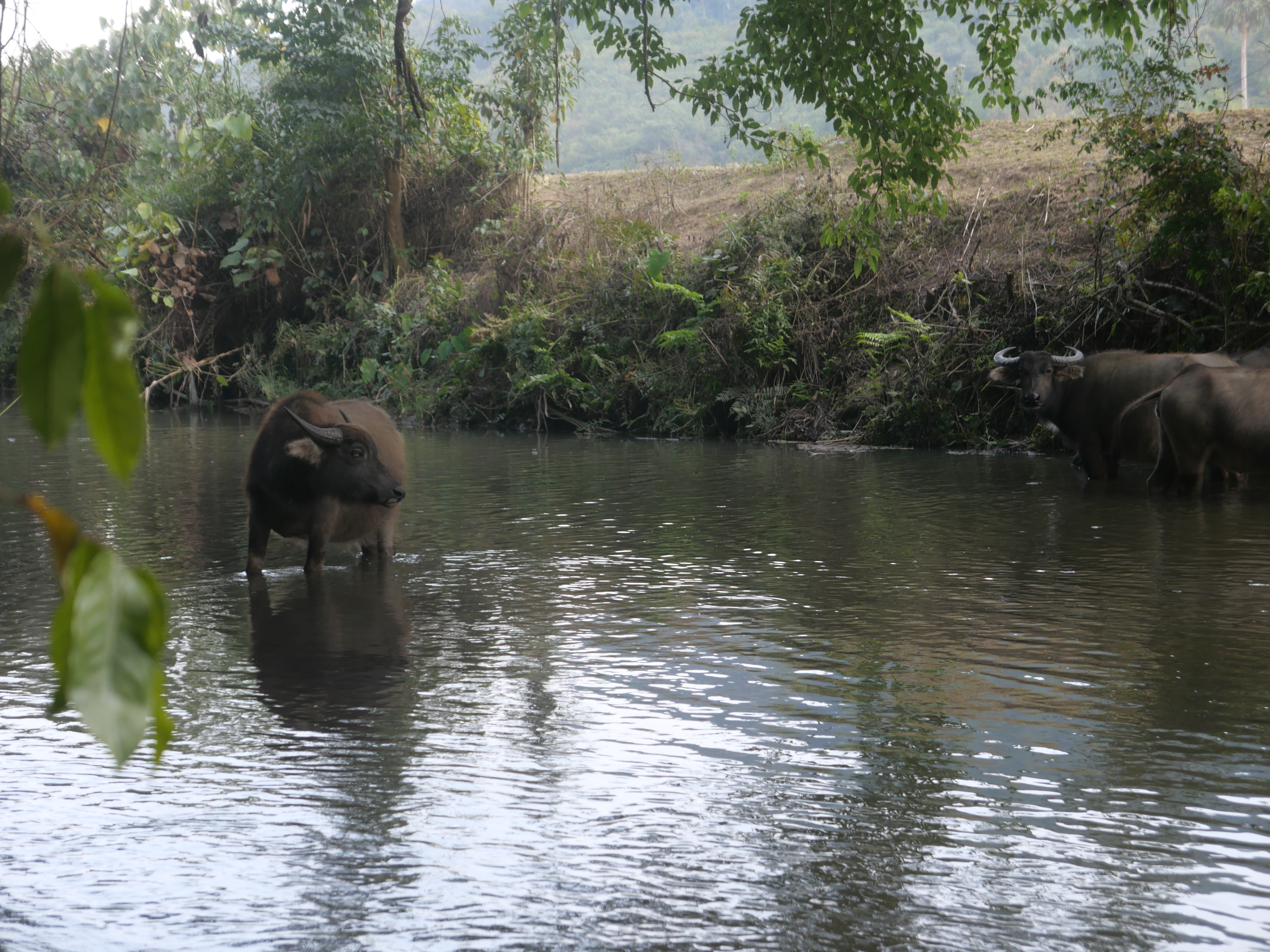Le village est une route qui ne semble jamais finir : elle conduit au-delà des dernières maisons vers les rizières asséchées qui se prolongent en terrain vague allant se fondre dans la jungle. Un mince filet d’eau coule en contrebas. On y surprendra des buffles, et quand ils ont levé leur museau ahuri vers moi, j’étais un spectacle bien plus étrange pour eux qu’ils ne l’étaient pour moi.
