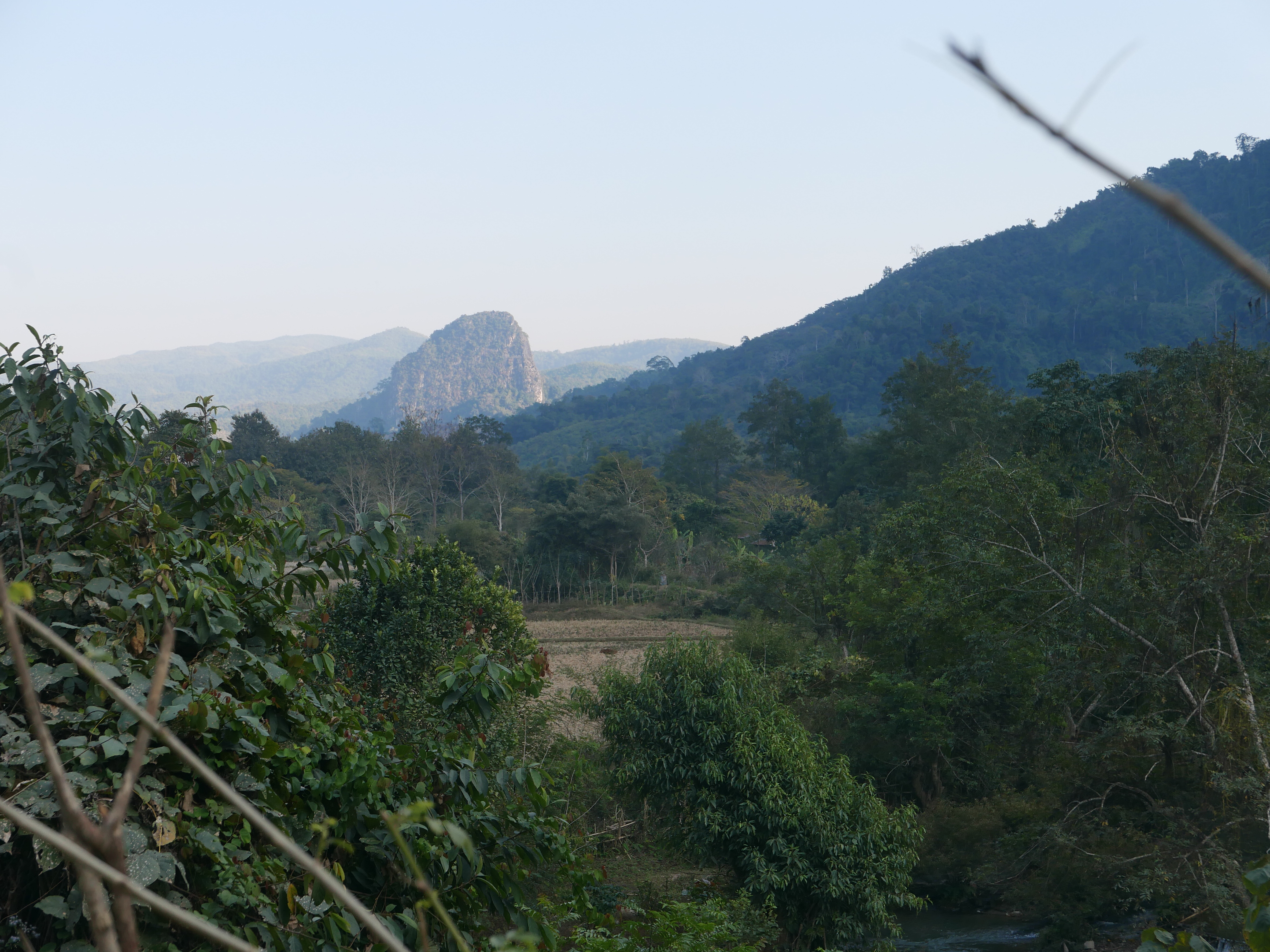 Le lendemain, retour à Nong Khiaw dans la même brume des fins du monde quand elle se confond avec son origine, gravir le Pho Daeng, tâcher de voir le monde entier après quatre-cent dix mètres d’ascension parmi les cris d’animaux cachés, d’oiseaux inconnus — là-haut, les massifs, la rivière qui s’échappe, le village déposé au hasard dans un nœud de la rivière, la vallée qui s’étend.