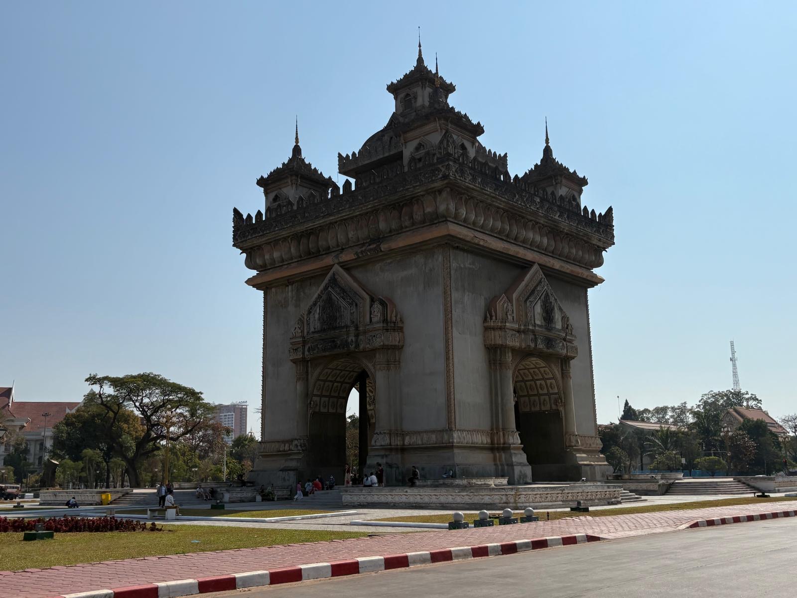 La gare de Vientiane se découvre dans une moiteur collante. Les tuk-tuks patientent sous l’auvent des kiosque et dans la brume d’essence et de voix mêlées. Sur la route, l’horizon s’ouvre sur des avenues d’autant plus vastes qu’elles sont presque vides – disproportionnées, peut-être ; plus sûrement creusées suivant des logiques contre-insurrectionnelles : impossibles d’y établir des barricades –, suspendues dans l’entre-deux jour où rien ne presse. Au détour d’un carrefour s’impose le Patuxai, bloc de béton levé vers le ciel. Construit avec du ciment fourni par les Américains pour un aéroport jamais réalisé, il reste inachevé. Aujourd’hui, il se dresse, massif, rongé par le vent.