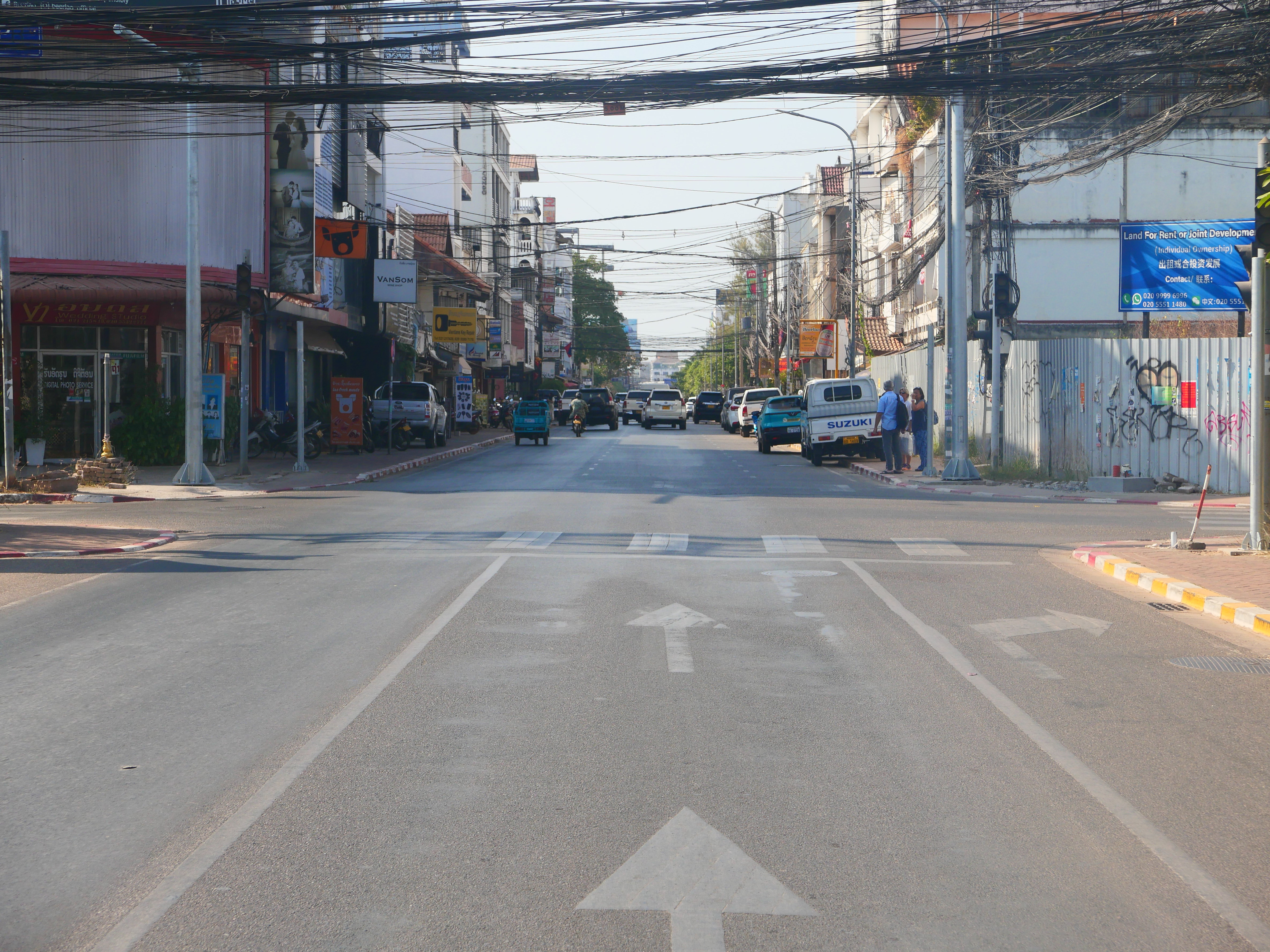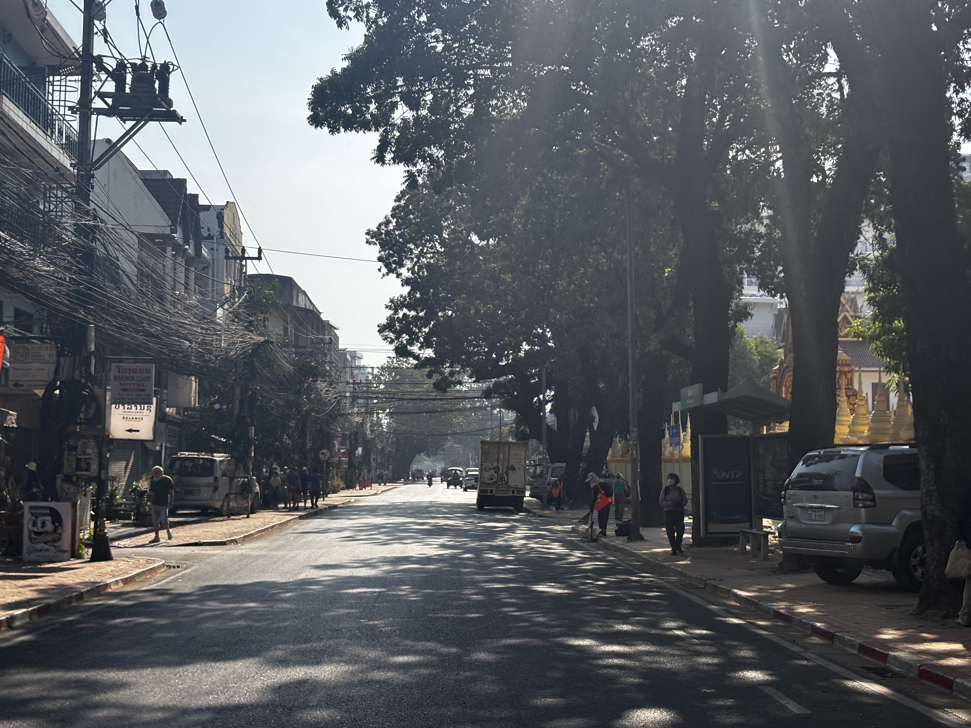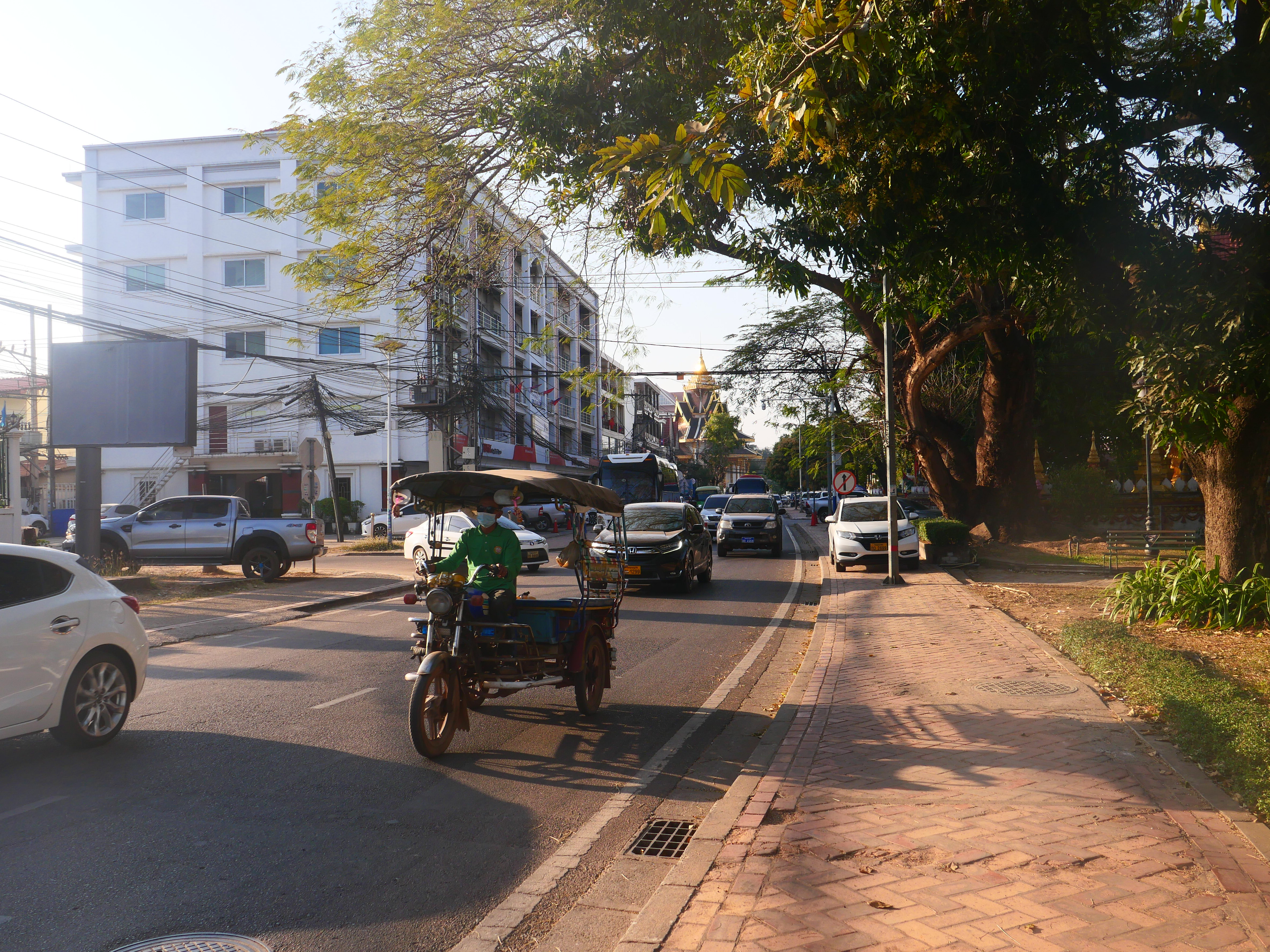 La lumière s’écrase sur les rues. Vientiane paraît posée sur elle-même, immobilisée dans sa torpeur. On y glisse plus qu’on ne marche, entre bâtiments bas et panneaux effacés. Le temps n’a pas d’accroche ici, mais dérive.