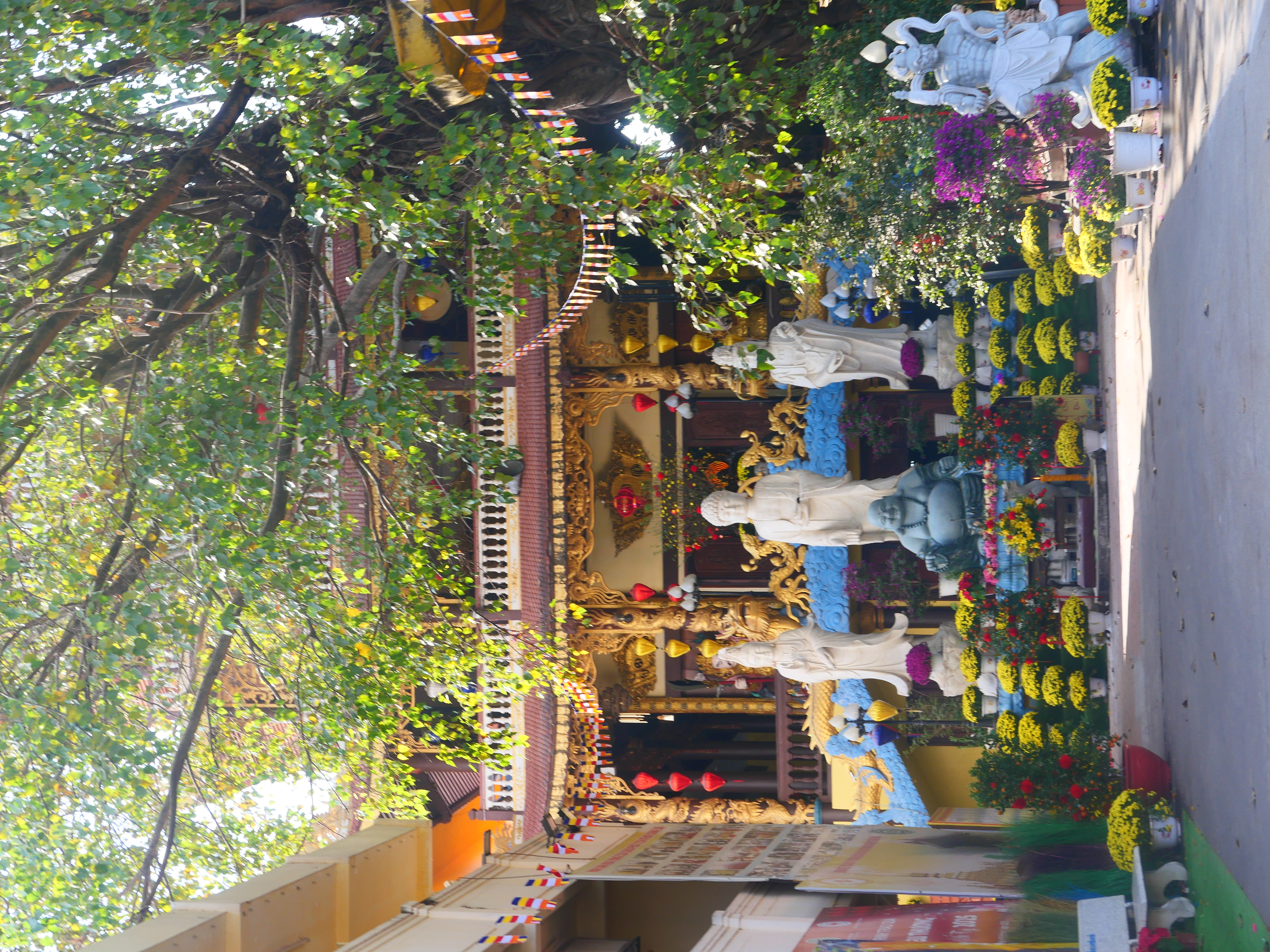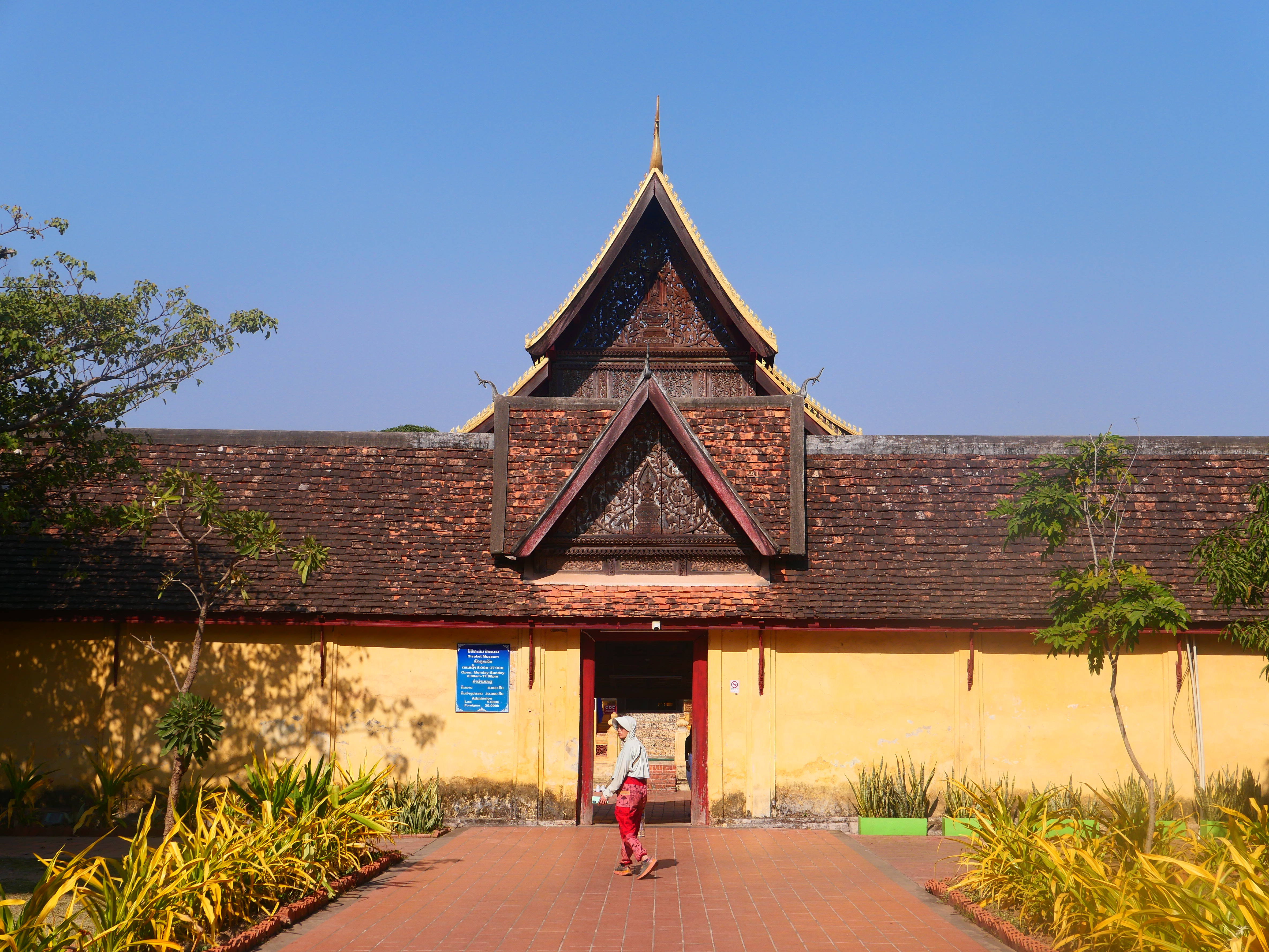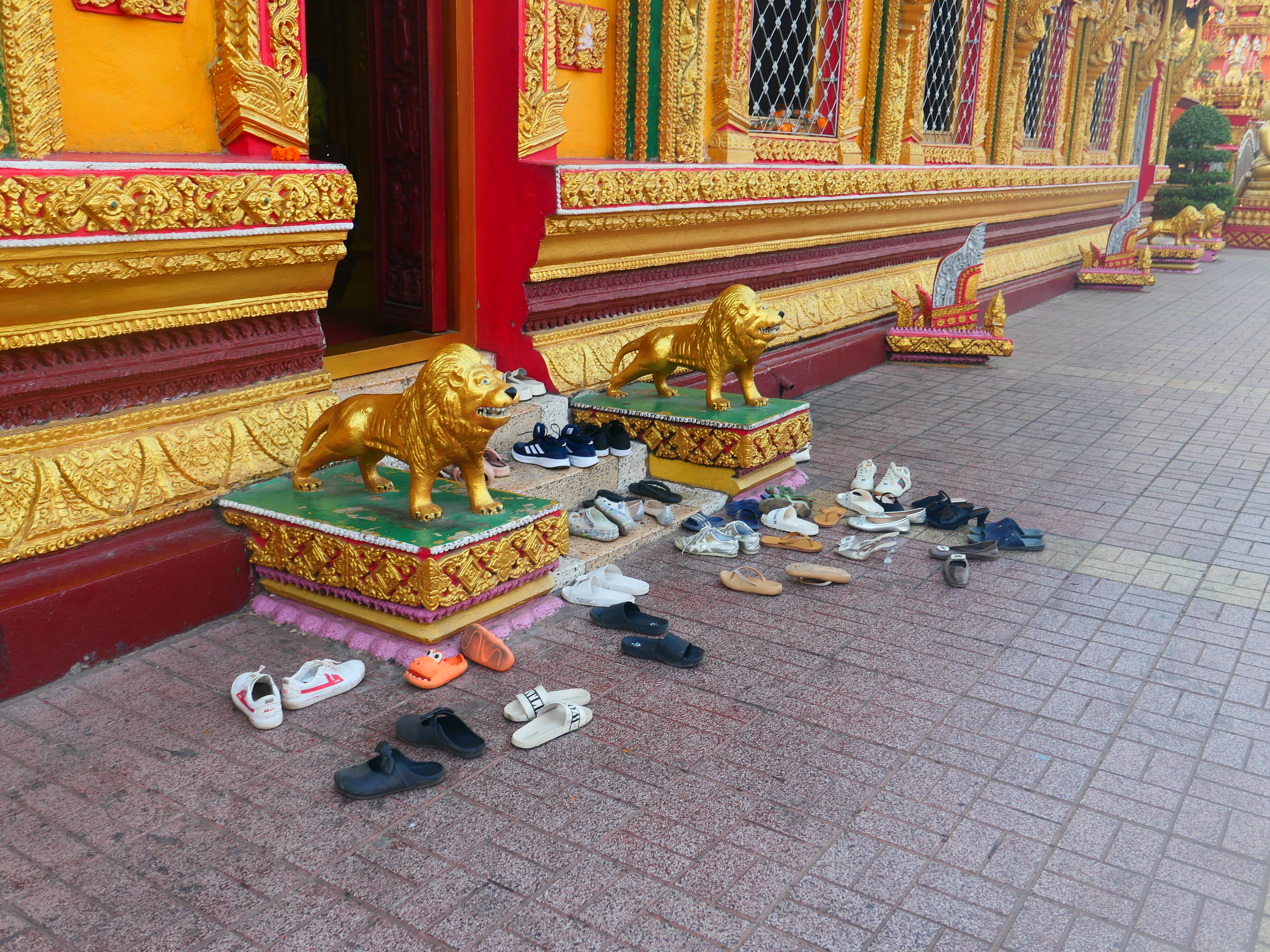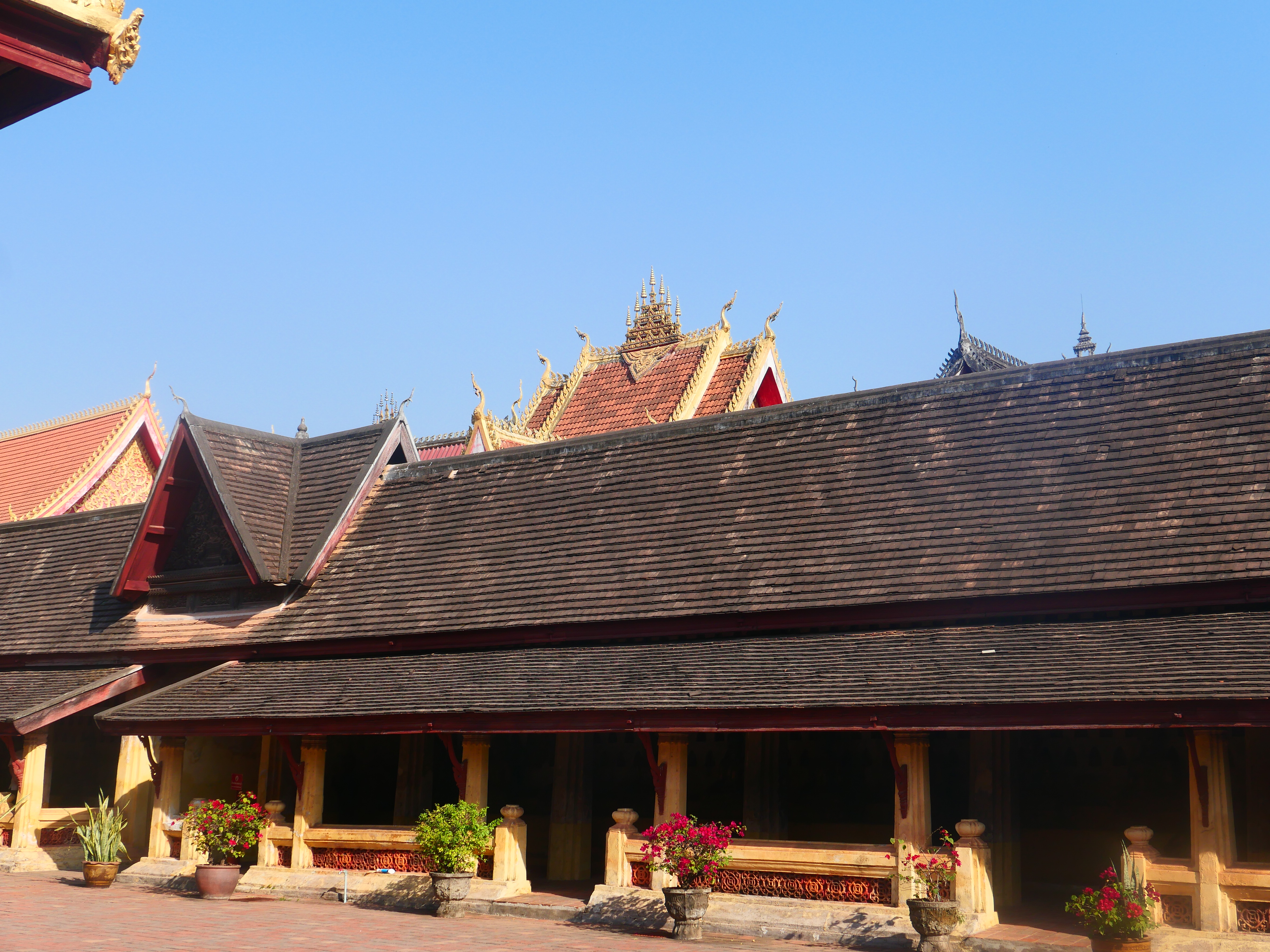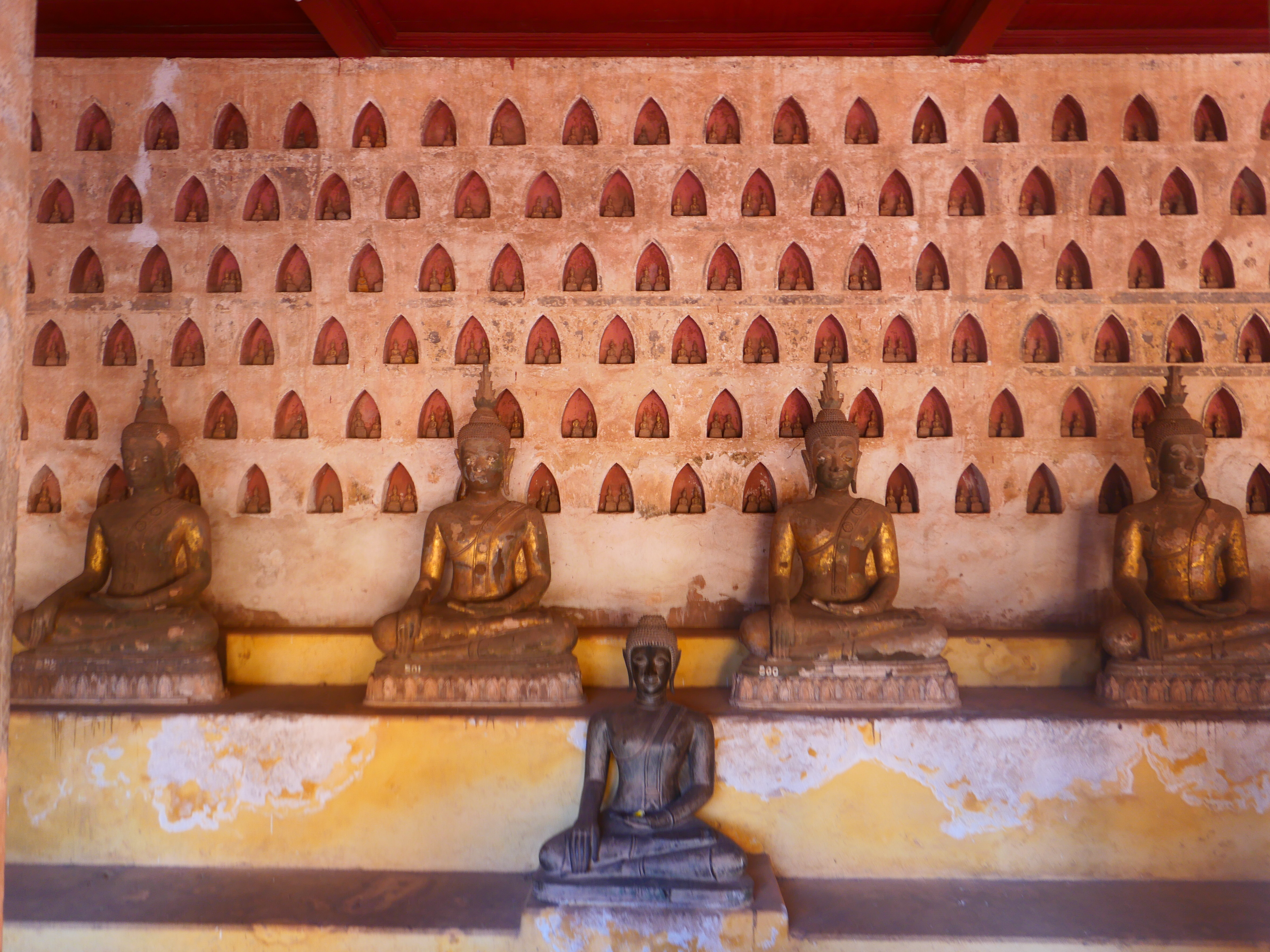Le Wat Sisaket ouvre ses portes sur un autre monde. Derrière les murs de latérite, le silence est partout sous les galeries. Des milliers de Bouddhas veillent dans l’ombre, serrés dans leurs niches, regards ouverts sur un temps plus vaste que celui des hommes, souriant terriblement. Les murs soutiennent à peine les siècles – effritements, écaillements, stigmates d’invasions et de restaurations successives. Sous les piliers de bois sculpté, la lumière tamisée passe à peine. À l’intérieur, le temple semble une respiration retenue ; l’encens brûle plus lentement qu’ailleurs. Des fleurs de frangipanier jonchent les dalles.