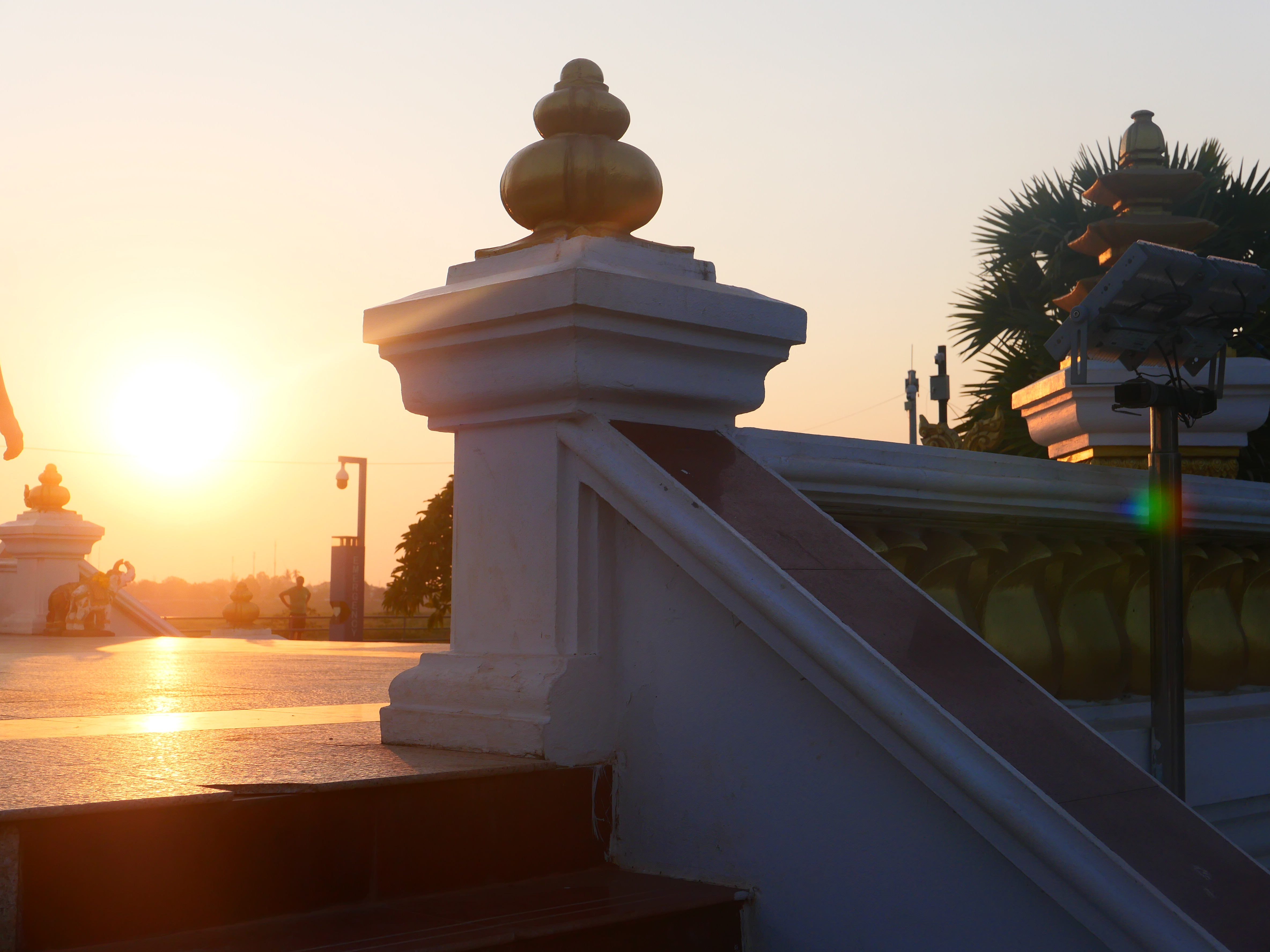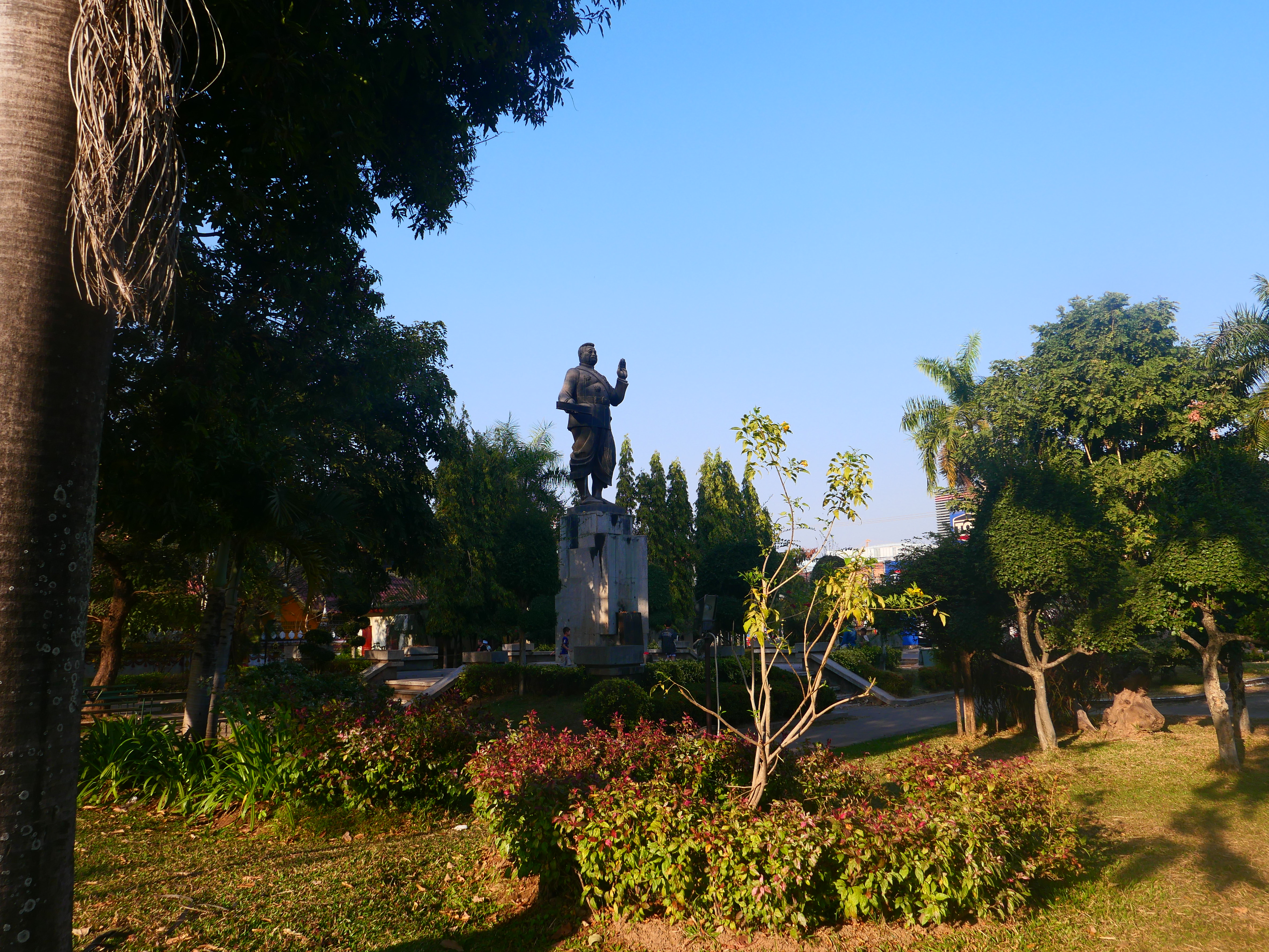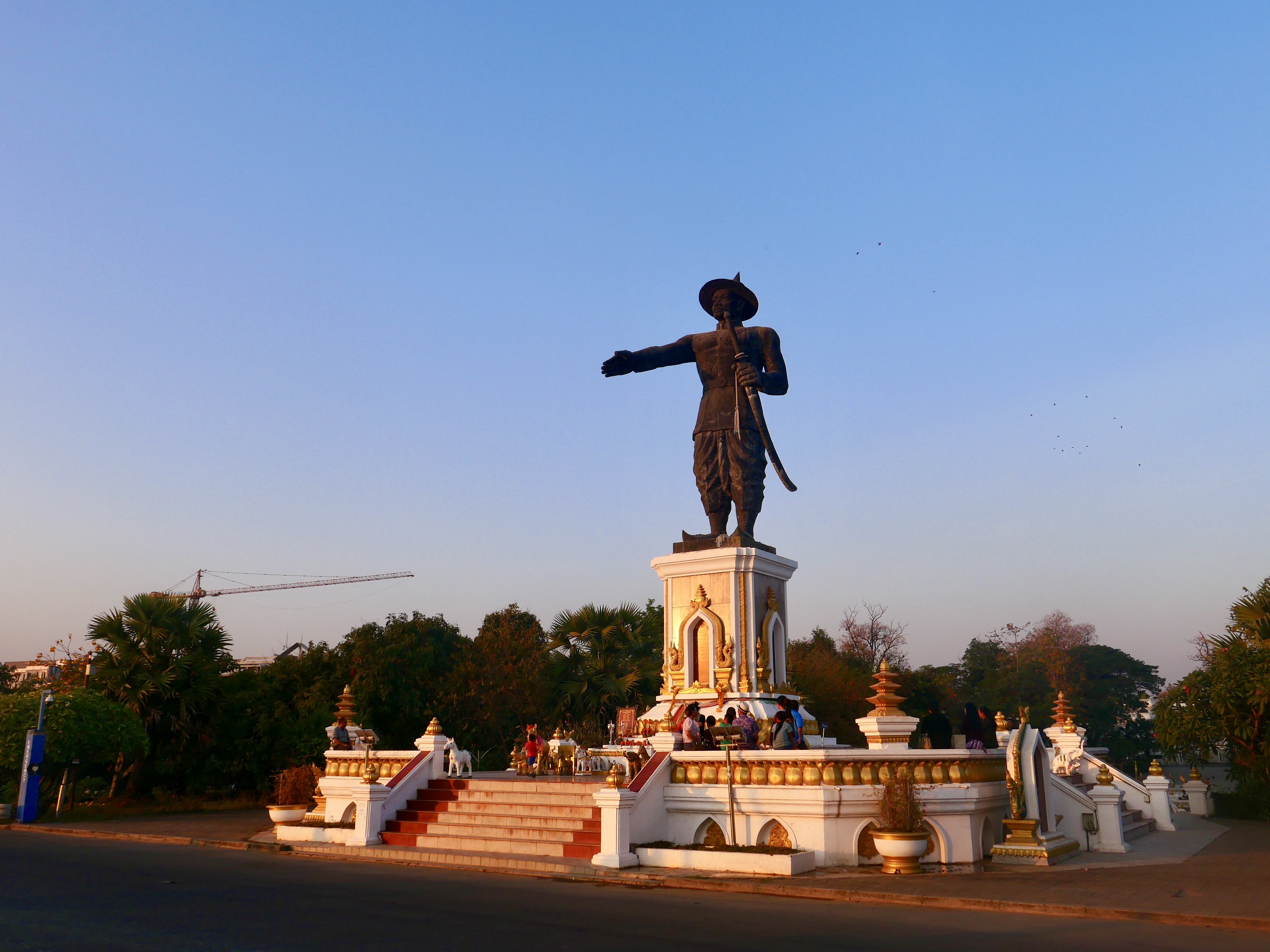Le soir, la ville se dissout dans le couchant. Le Mékong semble absent. Il est là malgré tout, immense, tout près, invisible – de l’autre côté d’un terrain vague qui éloigne davantage la Thaïlande pourtant à portée de fronde. Sur les bords du fleuve, la statue du roi Chao Anouvong domine, qui tend le bras en défi vers la rive opposée. Autour, le parc bruisse de voix étouffées ; on installe les étals pour le marché du soir. Le fleuve reste cette frontière incertaine entre deux mondes qui s’ignorent et se regardent à la dérobée. On marche sans savoir où finissent les terres, où commence l’eau et on finit par rentrer.