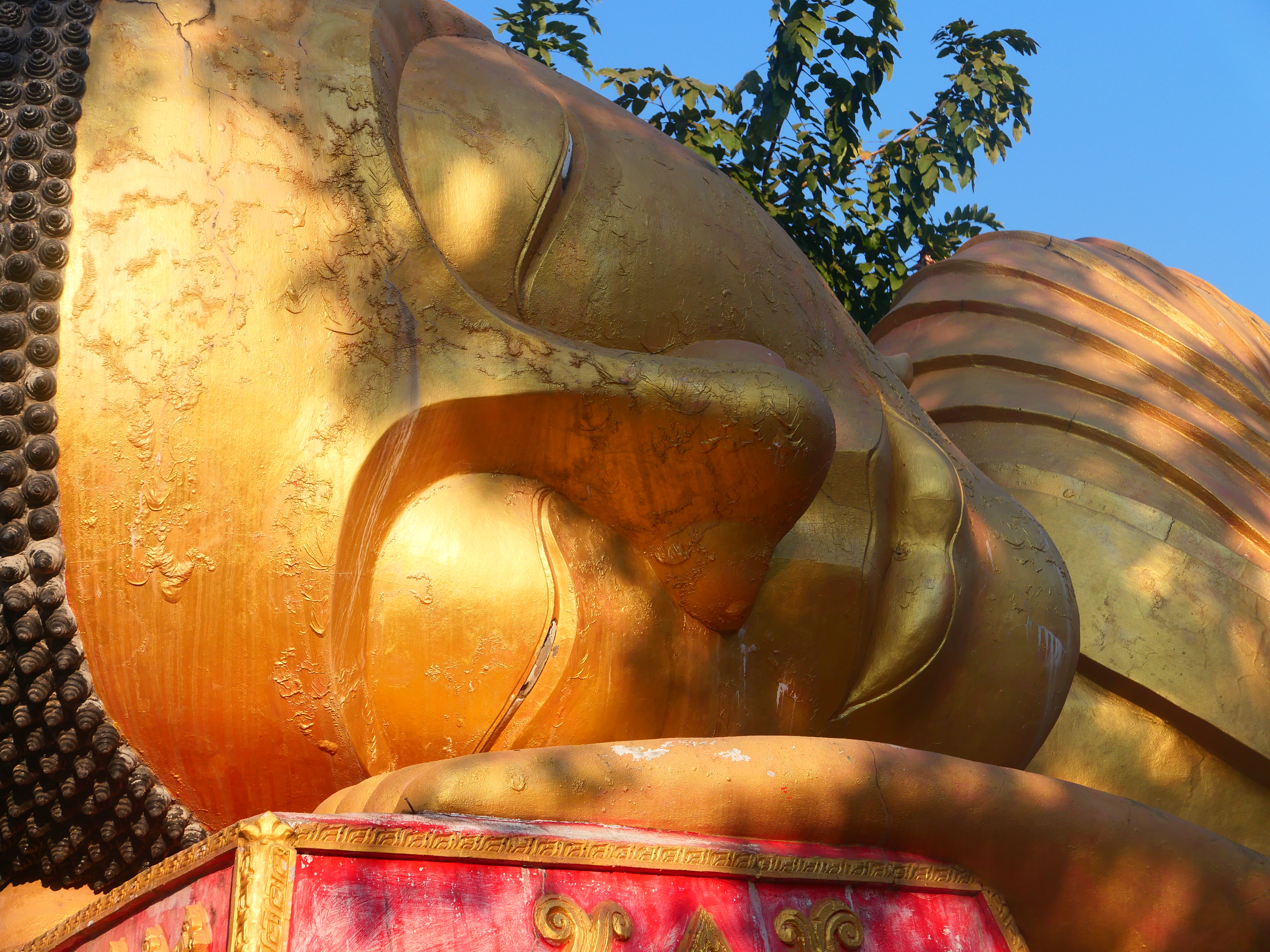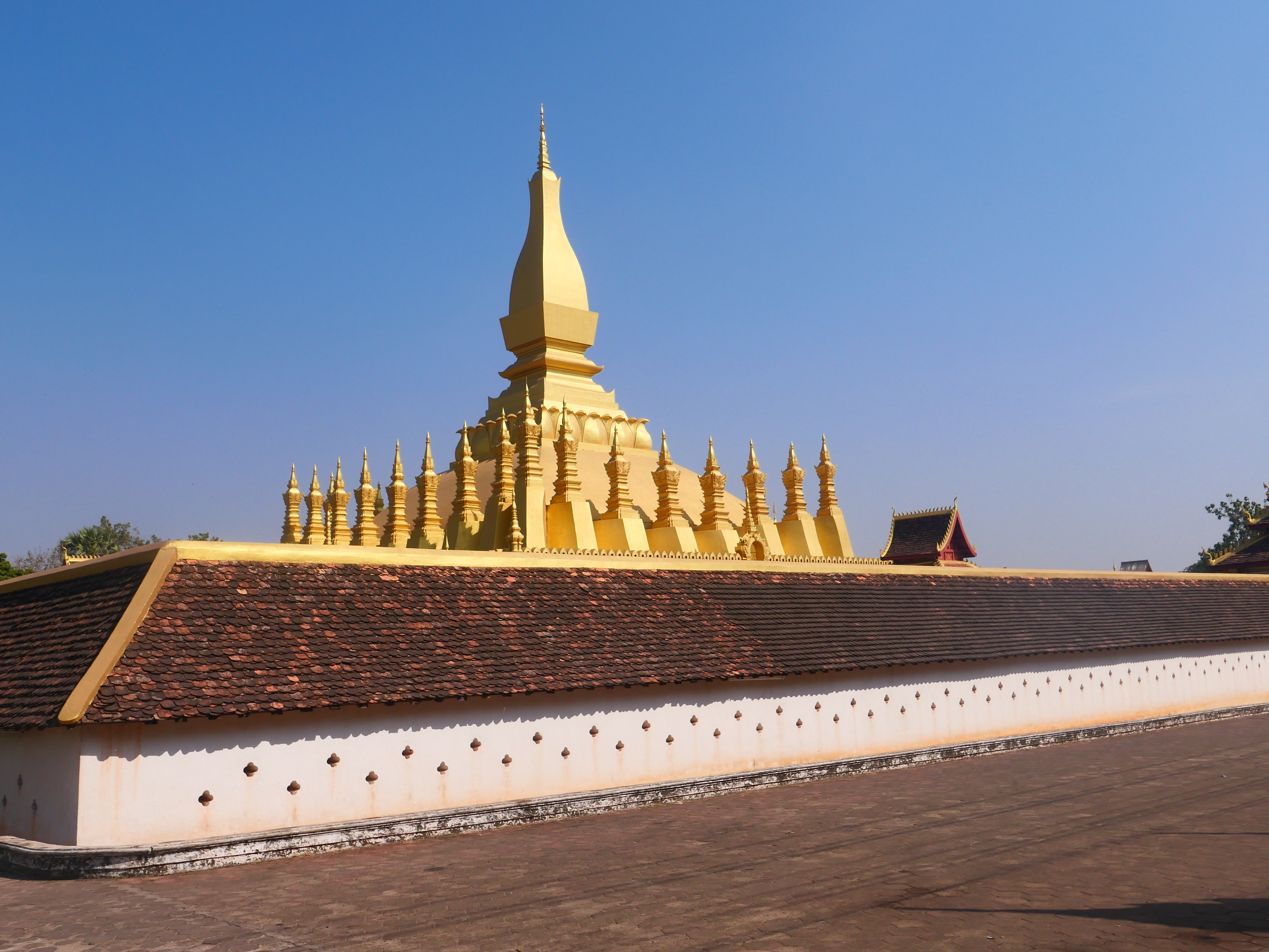 Le lendemain, le Pha That Luang flambe sous le ciel impitoyablement tranché et sans ombre. L’or s’enflamme dans la lumière, brûle plus qu’il ne resplendit. L’enceinte est fermée. On ne fera que tourner autour du sanctuaire. Ce qu’on voit aujourd’hui, on le sait bien, n’est qu’une tentative de retenir un passé qui s’était déjà effondré, un reflet reconstruit. Autour du stupa, des statues brisées s’effacent. Un enfant pleure. Son sanglot se mêle aux appels à la prière. Tout ce confond dans l’air épais.
