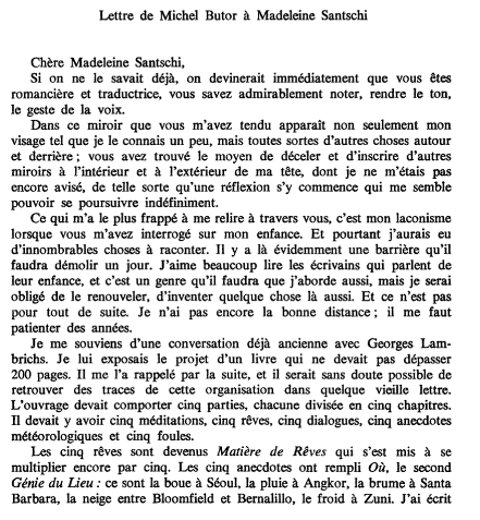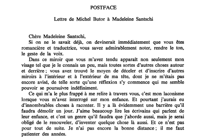 Au lieu d’une page de la Modification qu’on nous servira inévitablement [1] , relire donc plutôt cette lettre à Madeleine Santschi. Au nom des cent ans, et de la marée qu’on ne cessera pas d’affronter.