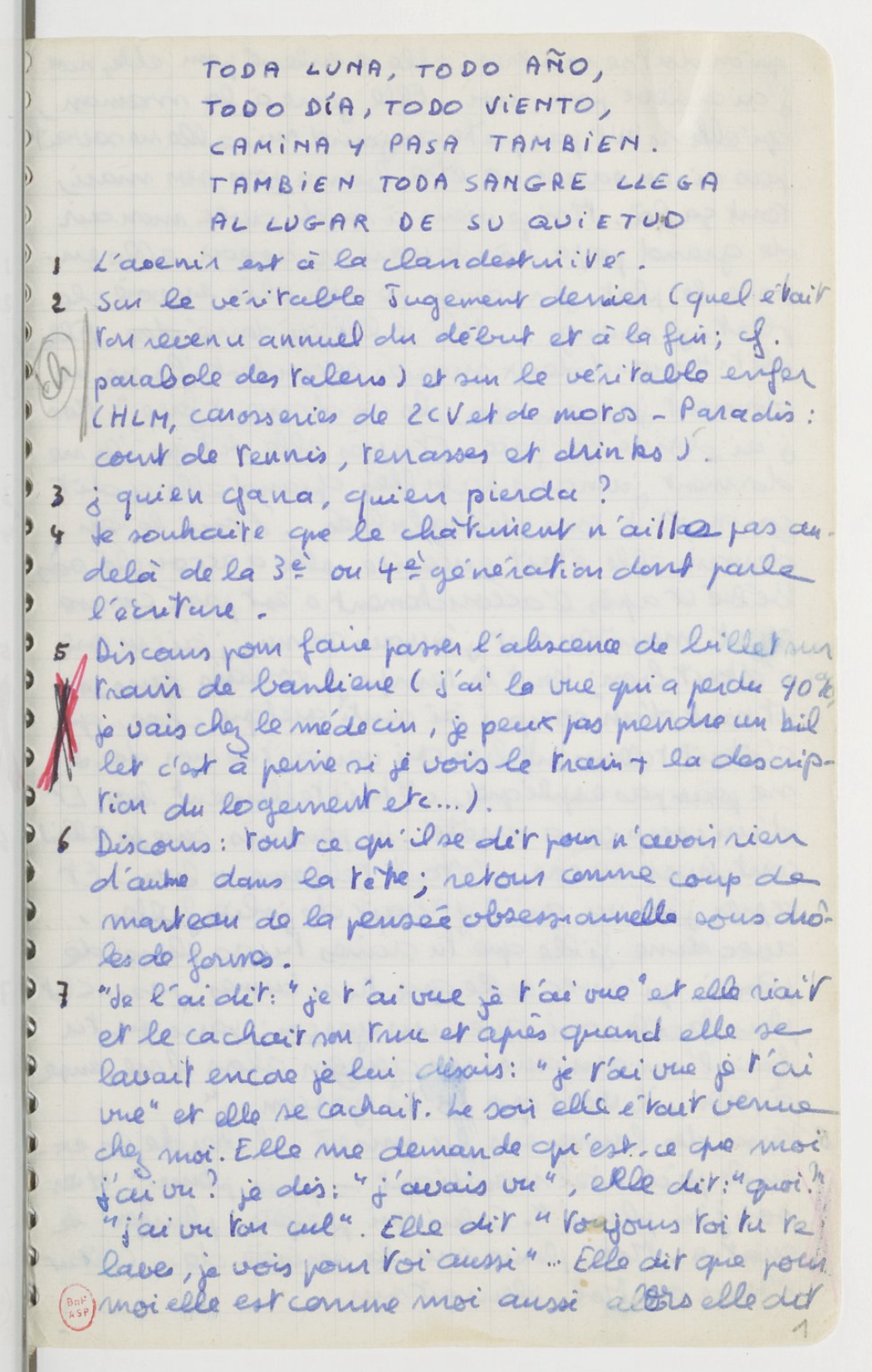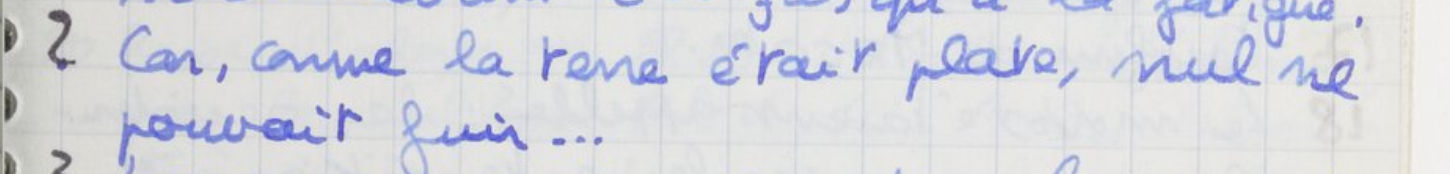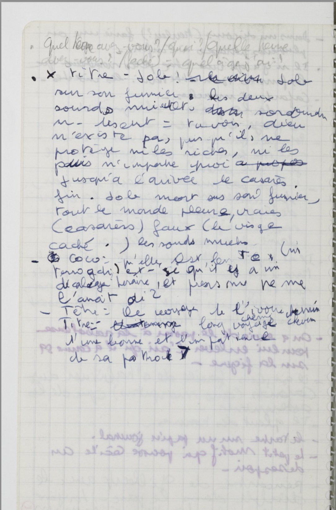 Dans les réserves de la BNF, on trouve un mince carnet, REF. 17731-40 : cent pages rédigées presque d’un bout à l’autre d’une écriture serrée, rapide et qu’on dirait pourtant concertée : le plus souvent écrites au crayon bleu, certaines corrigées au noir, et parfois, dans l’urgence griffonnées au crayon papier — celui qui sert à Koltès pour la rédaction des premiers états de ses pièces. Des notes, oui, à la volée, comme on tâche de fixer le vertige de ce qui passe.