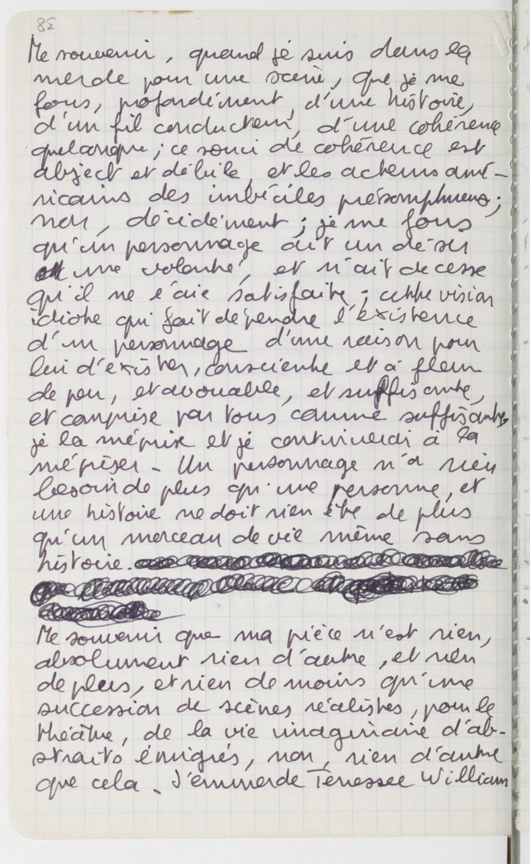 Ces notes existent pourtant, même si rares, comme des éclats d’un art poétique qui semble plutôt des rappels à l’ordre qu’il s’agit d’affirmer, pour soi-seul, et comme on se fixe un cap. Ainsi de cette note sur la conduite de la pièce et de ses rapports à l’histoire qui vient creuser et densifier ce qu’on savait par ailleurs de sa conception de l’intrigue. Oui, le récit l’intéresse comme l’intéressent ceux qui le travaillent de l’intérieur, et s’en méfient, préfèrent en rester maître. « Seulement envie de raconter bien », avait-il confié dans un entretien, « un bout de notre monde et qui appartienne à tous » : non pas raconter une histoire, donc. Car l’histoire quand on s’y coule ne permet plus qu’on la peuple de la vie et la hante, qu’on l’habite de l’intérieur, pour devenir une simple structure, ou pire, une convention purement littéraire. [15]