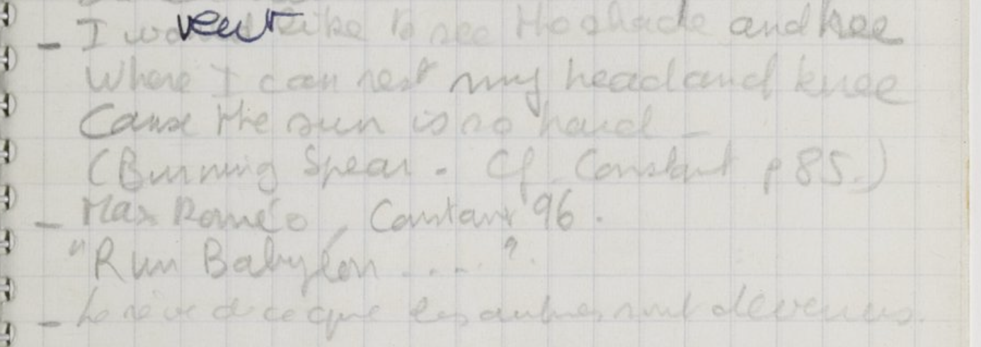 C’est cette phrase de la chanson qui servira d’exergue à Quai Ouest. Ici, Koltès indique sa source : « Constant », c’est Denis Constant, auteur du livre Aux sources du reggae paru en 1982 aux éditions parenthèses. Constant cite approximativement les paroles de Burning Spear (dans la chanson Resting Place on entend : « I would like to see / The broad shaded tree / Just I can rest my head underneath / ’Cause the sun is so hot »…) et c’est pourtant la citation de Constant que Koltès reportera en ouverture de Quai Ouest.