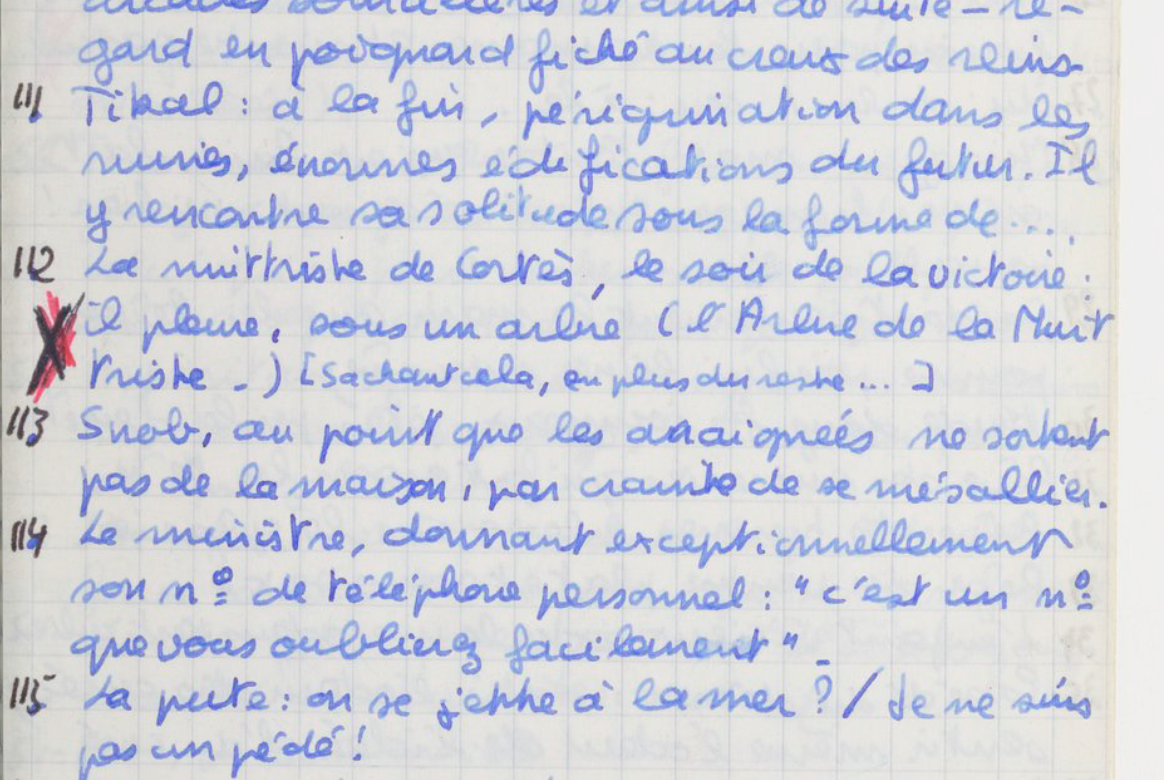 Autre exemple, autre piste qu’on pourrait suivre le long d’un autre fil d’Ariane. Le Carnet se poursuit en oubliant peu à peu semble-t-il le rêve de Tikal. Quand on lit l’œuvre publiée, nulle trace en effet. Et pourtant : le Carnet nous donne à voir la transformation de ce rêve. Car la Nuit Triste avait insisté. Ce ne fut d’abord qu’un titre (de pièce ? de roman ?)