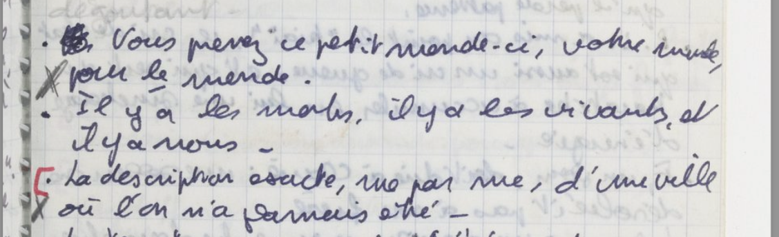 Mais le Carnet rouge se réduit-il à n’être que cette marge de l’œuvre ? Une note après l’autre, l’évidence de se tenir devant une œuvre en tant que telle aussi s’affermit. On peut certes reconnaître ici et là combien le carnet a nourri les textes destinés à être joués et publiés, mais ces notes peuvent se lire indépendamment de ceux-là, et loin de seulement offrir une vue sur la cuisine d’un auteur, donnent à lire de puissants « événements de langage ».