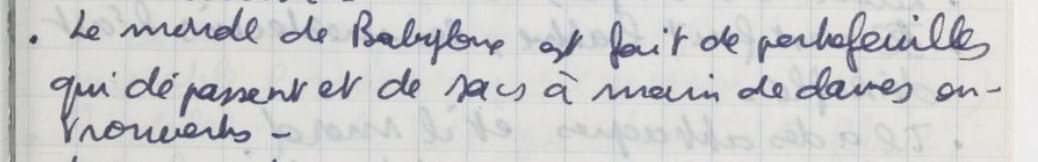 Reste que Babylone prend suffisamment de place pour devenir davantage qu’une référence mythique, mystique. Ce sera la ville où se déroulera ce roman qui n’aura jamais de nom, et ne connaitra qu’un prologue : son frère François, quand il en retrouvera les pages ce printemps endeuillé de 1989, le nommera évidemment, avec ce même goût baroque, Prologue :
