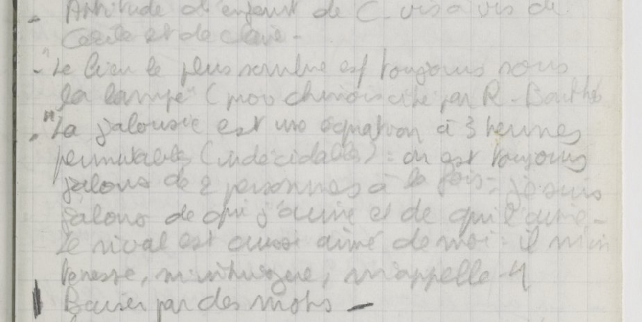 C’est dans Fragments d’un discours amoureux, et toutes les notes déposées autour de cette citation de Barthes dans le Carnet rouge semblent tourner autour de ce proverbe enveloppant la part obscure du désir, la jalousie et son secret. Par exemple ceci : « Baiser par des mots », surlignée sur le côté par une barre verticale. Le texte de Barthes est paru en 1977, et il serait utile de lire désormais les rapports au désir et son négoce travaillé par Koltès sous cette lumière neuve d’une lecture assez serrée avec le grand œuvre de Barthes — et Proust en trait d’union.