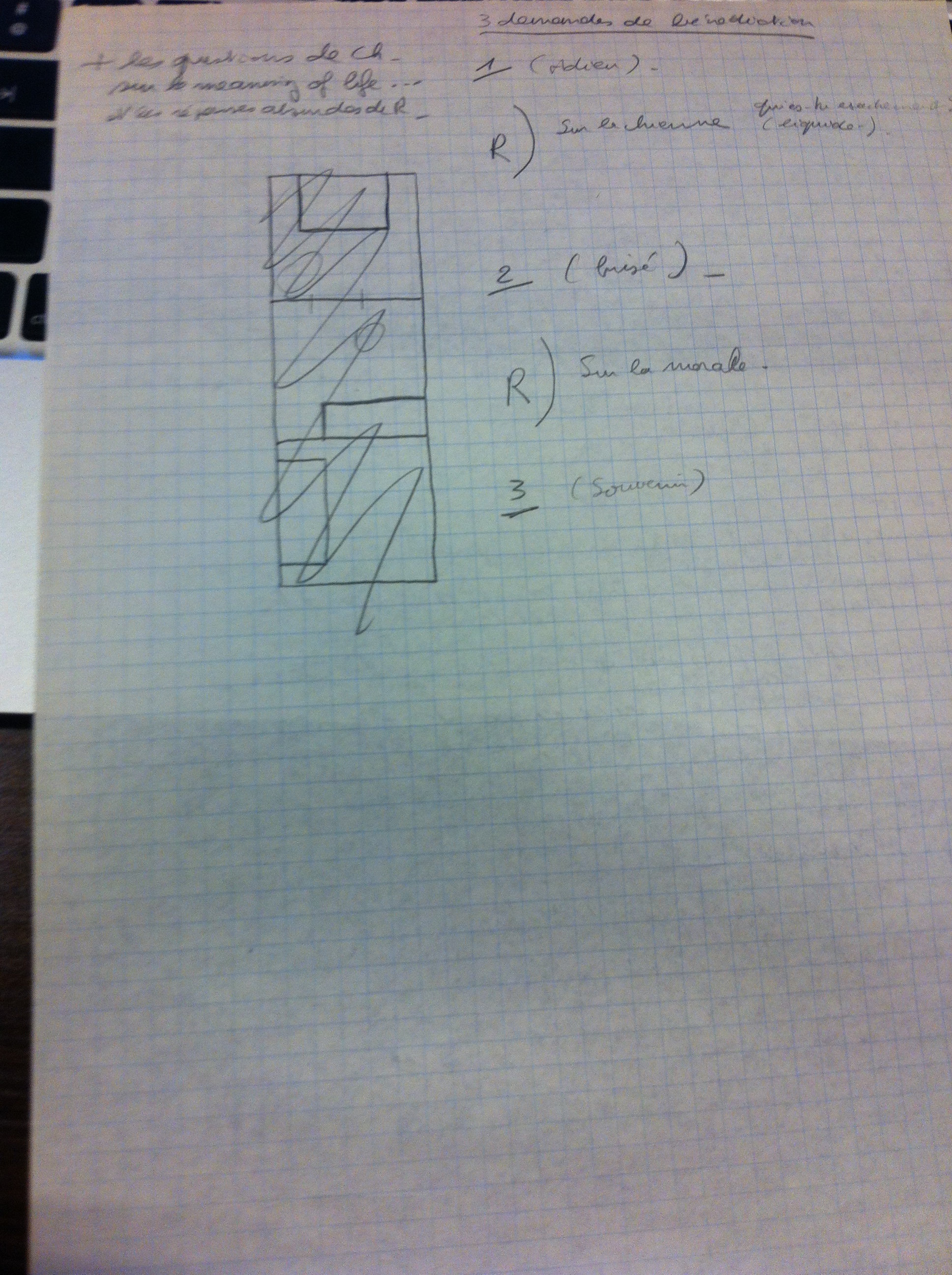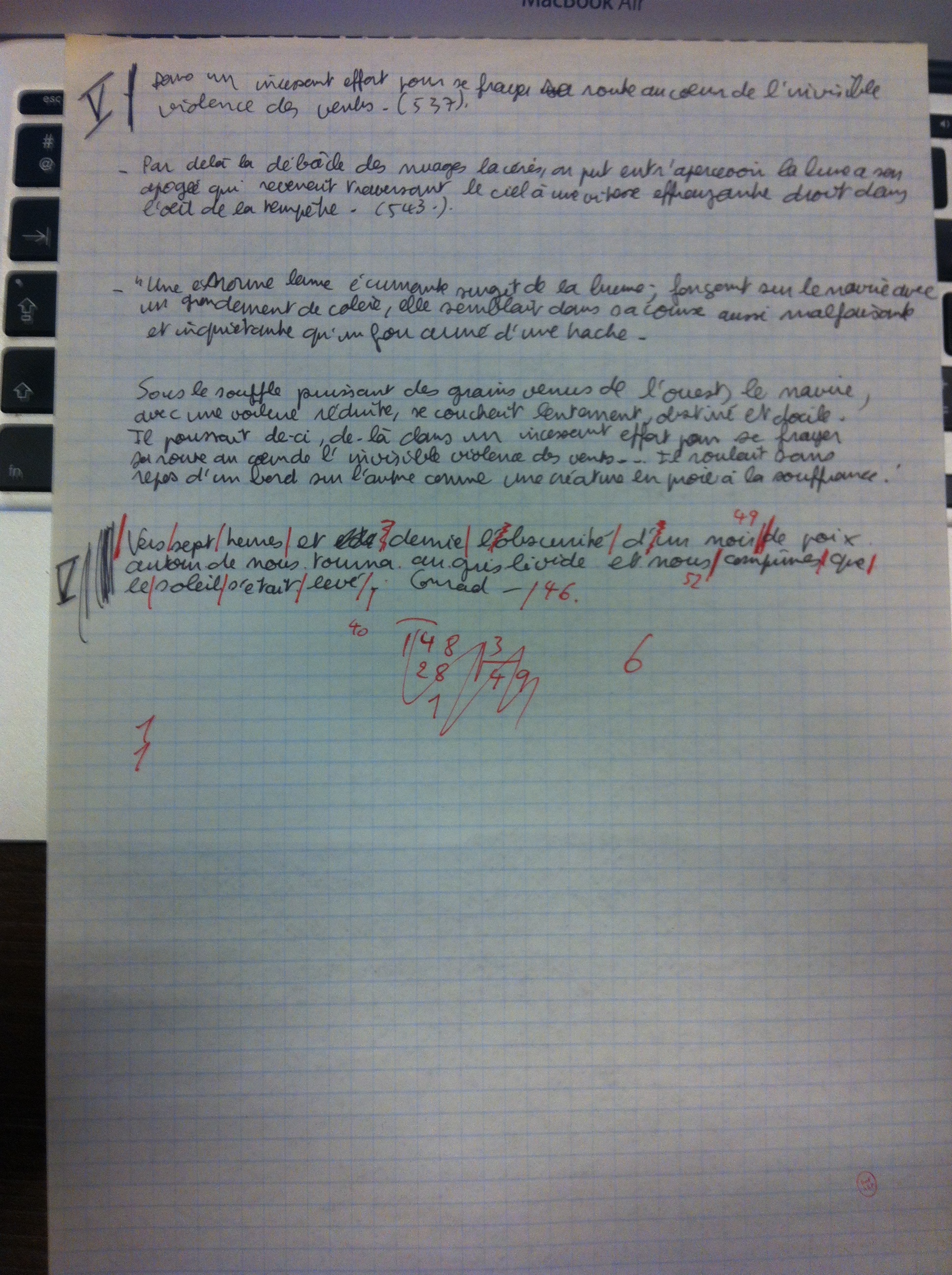 C’est cependant entraîné par l’exigence mathématique de la pièce précédente qu’il se lance, et c’est pourquoi il n’y a pas de retour régressif à un amont, comme vers celui des premières pièces, mentales et oniriques, défaites de toute structure et appuyées sur leur seule puissance de profération.