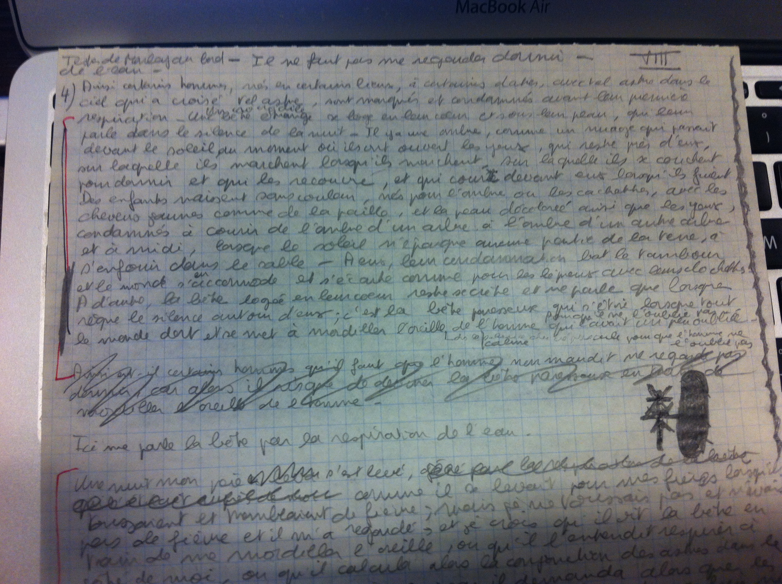 Seulement, l’écueil est infranchissable : vivant au présent des expériences avec la pensée de l’écrire, ensuite, plus tard, dans le repos de la chambre, on ne peut être ni au présent de l’expérience, ni à celui de l’écriture — mais déchirer, ou pour mieux dire : devant un impossible qui est non pas la butée de l’écriture, mais sa condition de l’écriture.