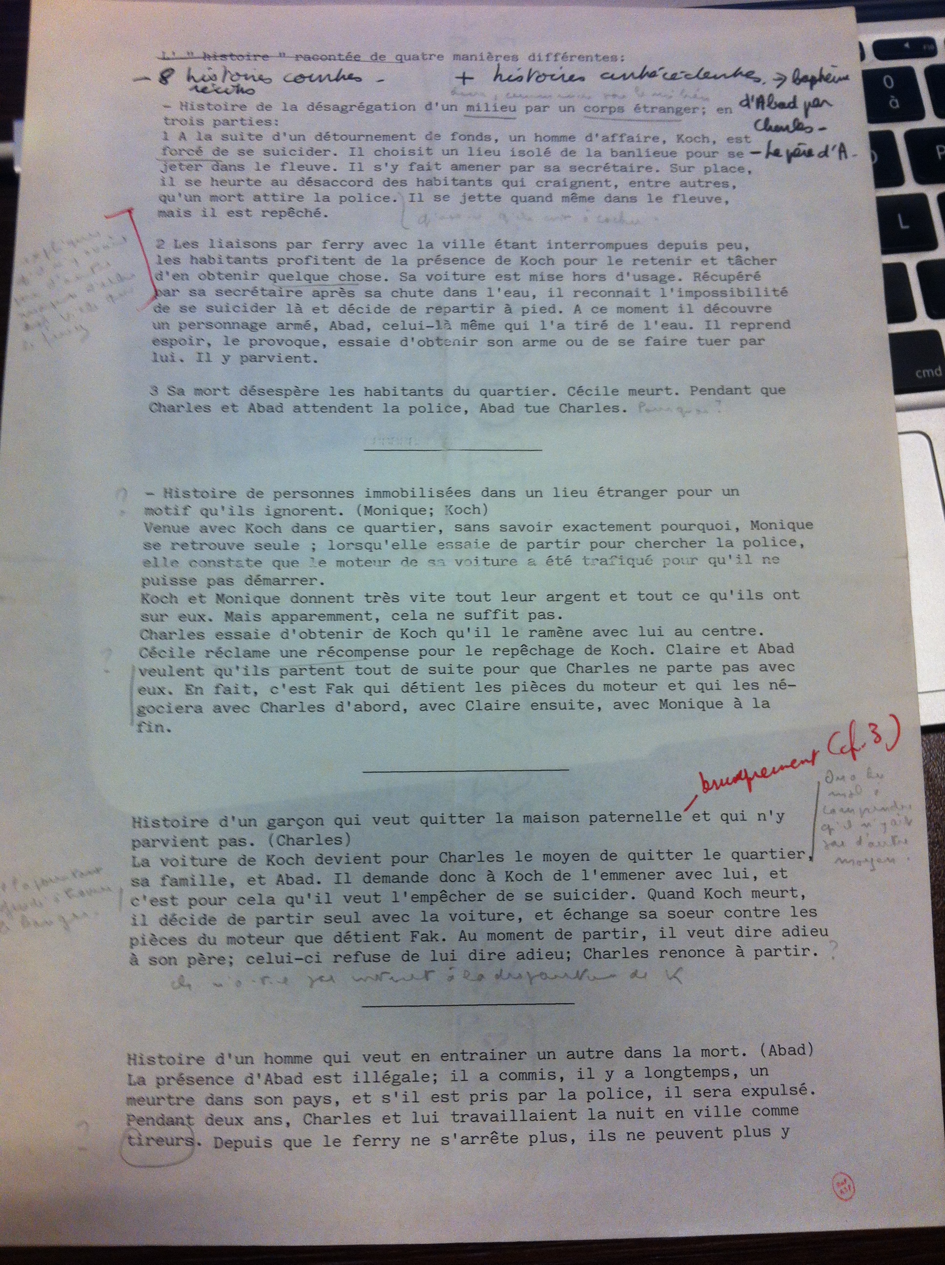 Je ne voulais plus affronter les problèmes du théâtre — les impératifs techniques. J’avais l’impression de me perdre un peu. J’avais besoin de retrouver ce qui touche à l’écriture, voir où j’en suis. J’ai voulu entrer directement dans le thème que j’essaie à chaque fois d’aborder, et qui se noie. Quand on raconte une histoire, quand on écrit des relations amoureuses, on évite le sujet, le principal ; c’est-à-dire que les rapports entre les gens, les coupures entre eux, ne relèvent jamais du sentiment, ni du désir, ni de ces choses-là. Pour être sommaire, le monde pourrait se diviser entre qui sont complices et ceux qui se détestent sans aucun motif objectif. Et, naturellement, j’ai envie de parler des gens qui se détestent [16].