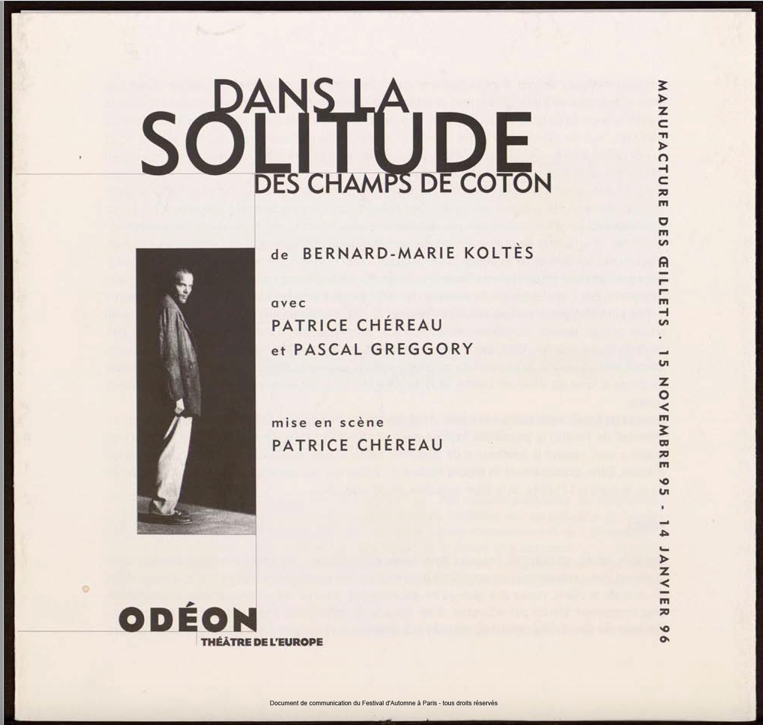 Les monologues étaient dans Quai Ouest rejetés entre parenthèses, et non destinés à être lus, comme une concession explicite faite à Chéreau. Mais Koltès, lorsqu’il compose Dans la solitude des champs de coton, s’affirme plus sûr de sa langue, et surtout, certain que cette voie, formellement ultra-élaborée, est une impasse. La preuve : il y perdait son plaisir.