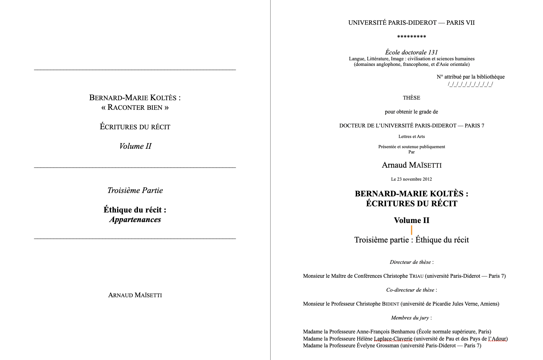 Accueil > BERNARD-MARIE KOLTÈS | « RACONTER BIEN » > KOLTÈS | ARTICLES & NOTES > Koltès | Écritures du récit [Thèse de doctorat ] > Bernard-Marie Koltès | Éthiques du récit
