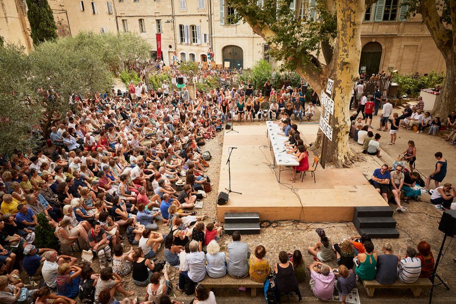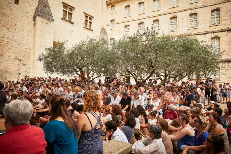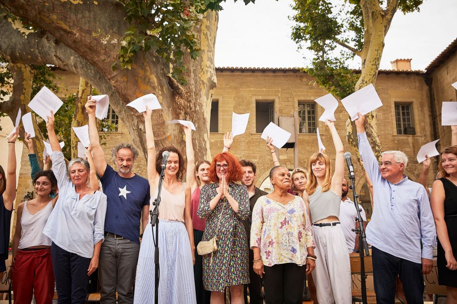 À midi, les jardins de Ceccano sont le décor du feuilleton théâtral de cette 71e édition. Après La République de Platon / Badiou il y a deux ans [1], et les Chroniques de l’histoire du Festival par la Piccola Familial l’an dernier, ce sont cette année des textes d’émancipation que jeunes acteurs et amateurs font entendre devant une large foule, attentive et fervente. On aura tout est un spectacle qui vibre d’une singulière énergie, d’une écoute dense et sensible. Le spectacle – ou la cérémonie théâtrale en jeu – conçu par Anne-Laure Liégois fait entendre des textes choisis par Christiane Taubira : chaque jour, un thème est traversé et nourri par les grandes écritures, les langues puissantes – on entend Hugo et Césaire, Senghor, Chamoiseau, Darwich, Jaurès ou Barbusse, les auteurs du panthéon personnel de l’ancienne ministre de la Justice, mais qui sont aussi ceux d’un certain horizon politique. Lequel ? Celui qui lie les hommes ensemble, fait le pari de l’émancipation au nom d’hier et pour demain. Dès lors, ce qui se joue tient autant dans le travail, puissant et délicat, de l’adresse, que dans l’écoute, dense et tenue : une expérience commune, qui prend le risque du commun, choisit l’audace de l’émotion comme politique, et puisque rien n’est jamais acquis ni donnée, fait de cette traversée un recommencement de chaque jour.