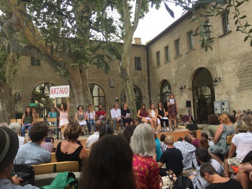 Le 21 juillet, séquence autour de la guerre. Discours de Jaurès, de Barbusse : la paix est évidemment l’horizon commun de ce territoire. Mais quand surgit le texte de Delbo sur les convois vers les Camps ; celui de Genet sur les cadavres de Sabra et Chatila, celui d’Artaud – qu’on recopie ici, pleinement, pour trouer ce texte comme il troua l’air de ce midi, au Jardin de Ceccano :