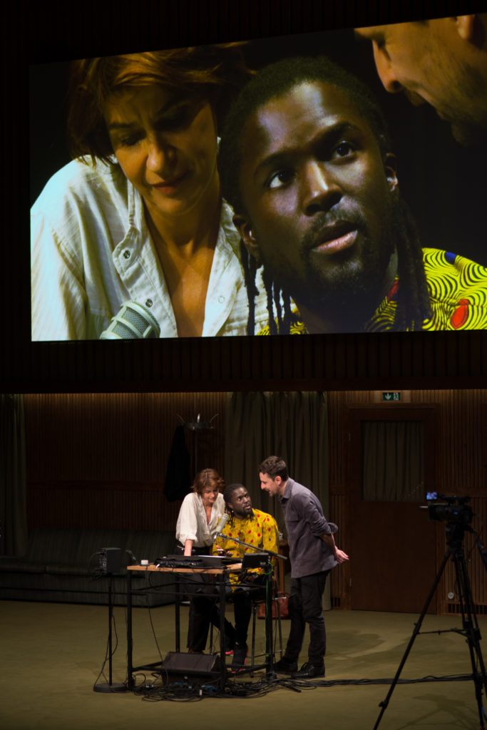 Ostermeier choisit ainsi de poser une fiction sur le récit d’Eribon. C’est donc l’histoire d’un cinéaste qui a réalisé un film adapté de l’œuvre (avec le sociologue lui-même comme protagoniste), et qui travaille au montage et à la voix off. Le plateau de théâtre sera justement cette salle d’enregistrement où une actrice, Irène Jacob va poser sa voix — lisant le texte d’Eribon — sur les images projetées en direct. Le réalisateur du film Cédric Eeckhout, assisté du preneur de son Blade Mc Alimbaye, est en cabine. Théâtralité à l’épure, où la pauvreté s’exhibe en choix esthétique — qui se heurte pourtant à l’extrême affectation de la voix de la comédienne, à la joliesse de seconde main du film, à l’artificialité désuète d’une scénographie qui n’est qu’un décor (« attention à la moquette » sera le running-gag censé jouer avec/sur la fausseté de la scénographie, mais qui ne fait qu’enchérir sur sa préciosité, la vanité théâtrale à préserver). Le film déroule le récit d’Eribon, jouant la surimpression scolaire avec lui : chaque plan illustre ce qu’on entend, et chaque parole appuie ce que l’on voit.