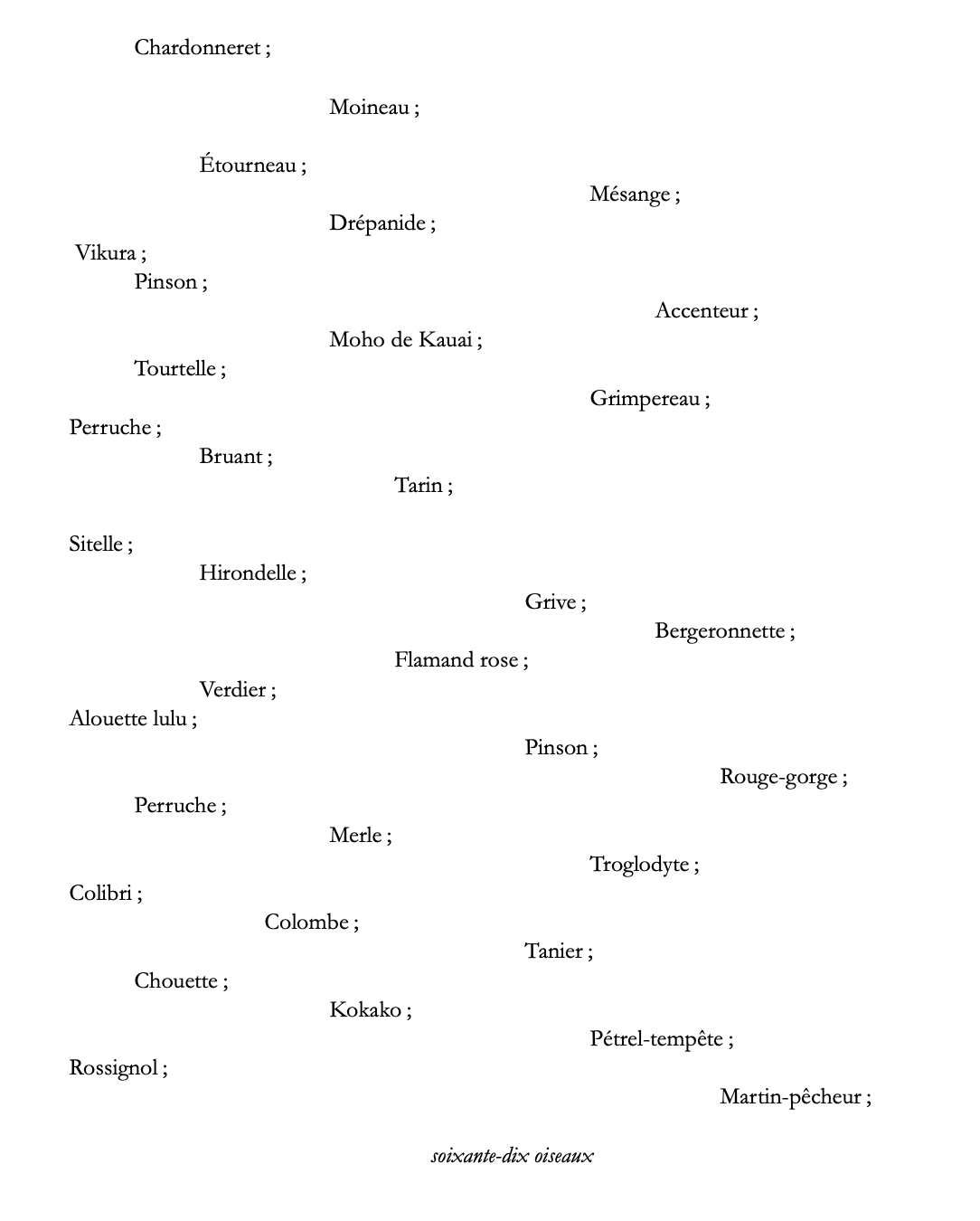 Il faudrait continuer à l’infini, ajouter des Jaseurs Boréals, d’autres oiseaux imaginaires, réels là-bas où s’imaginent les oiseaux d’ici comme si ce n’était qu’un rêve, mais les rêves ont une fin : il n’y a que soixante-dix oiseaux.