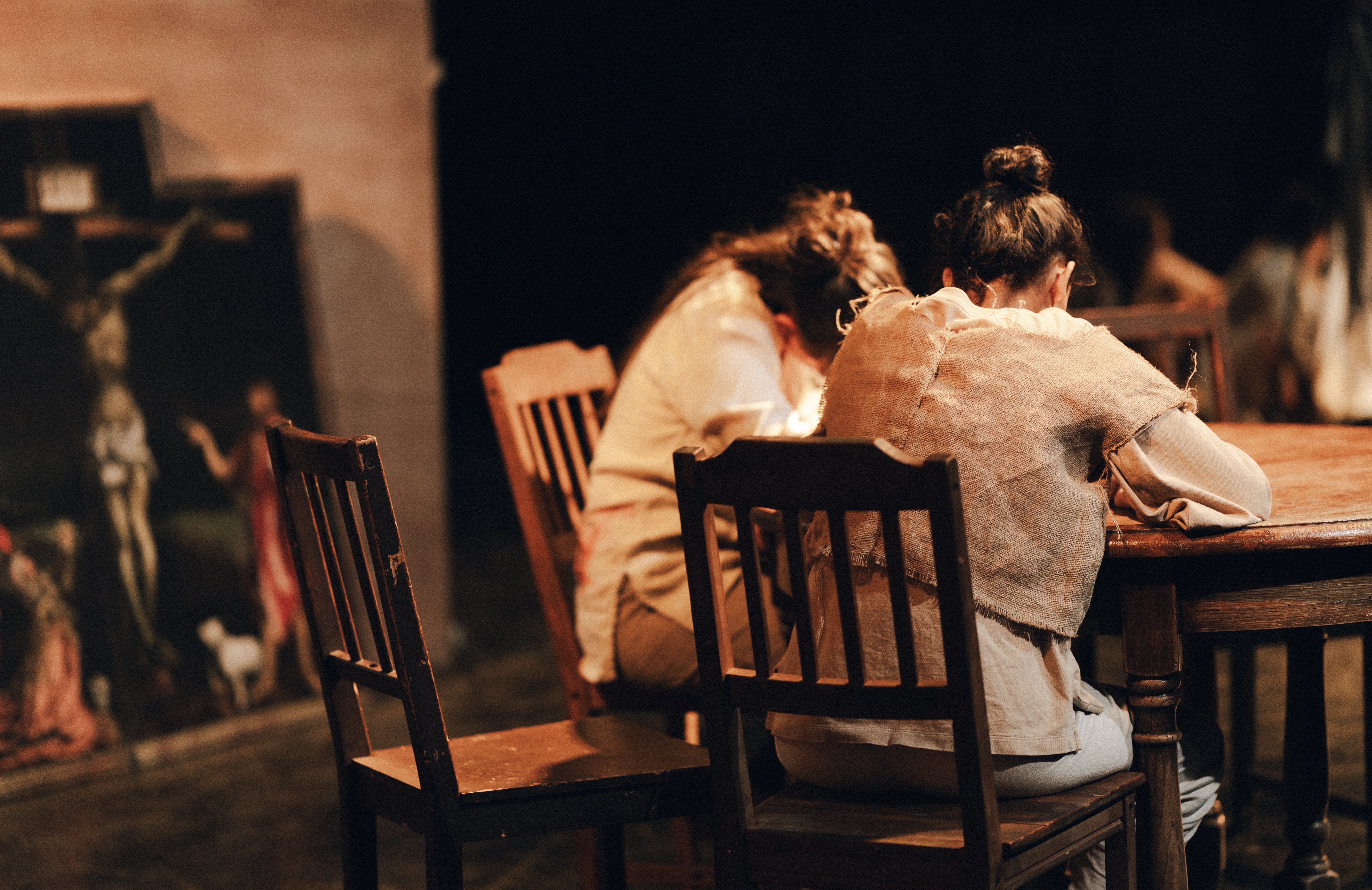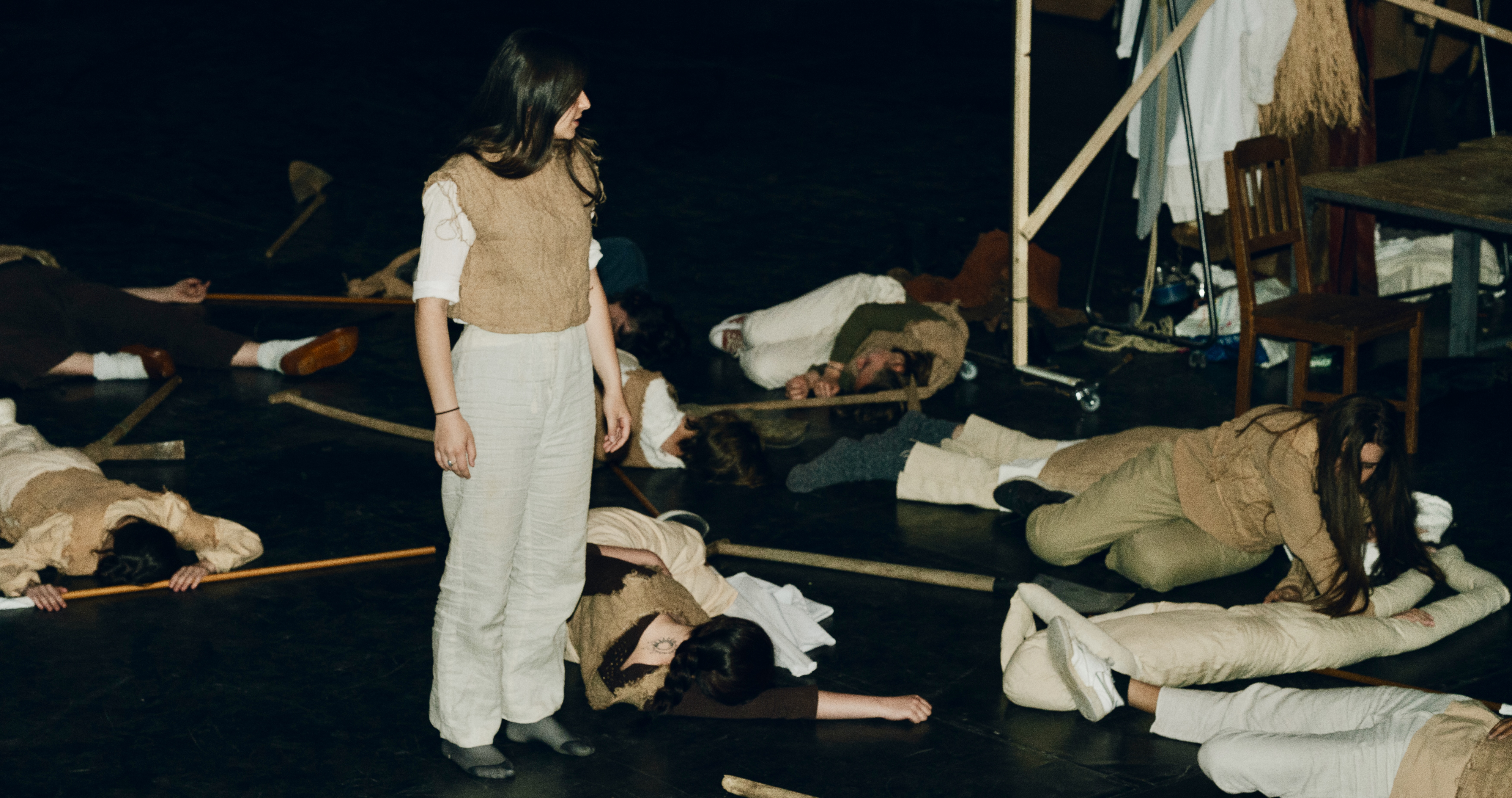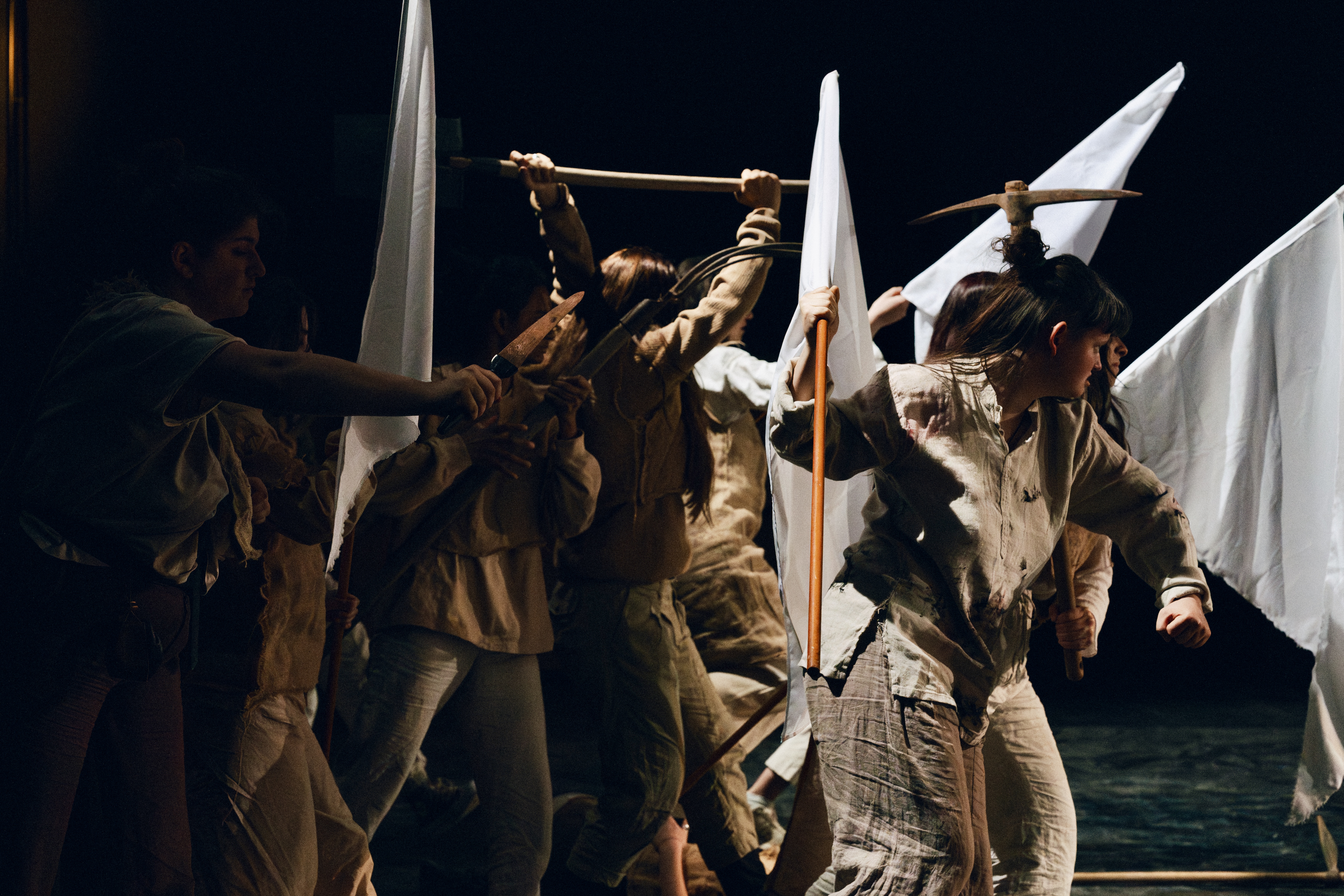 Le drame des paysans vient percuter les paroles vengeresses de la Bible ou de Pasolini, de Genet ou de Dostoievski — et c’est peut-être l’inverse —, paroles qui sont traversées par la scène secouée de spasmes de la geste révolutionnaire paysanne, jetée jusqu’à nous comme en défi. Par-dessus, comme en travers de la gorge, les tréteaux bouffonnent la joie d’être vivant, l’insolence de renverser l’Histoire en histoires à jouer pour défier la mort.