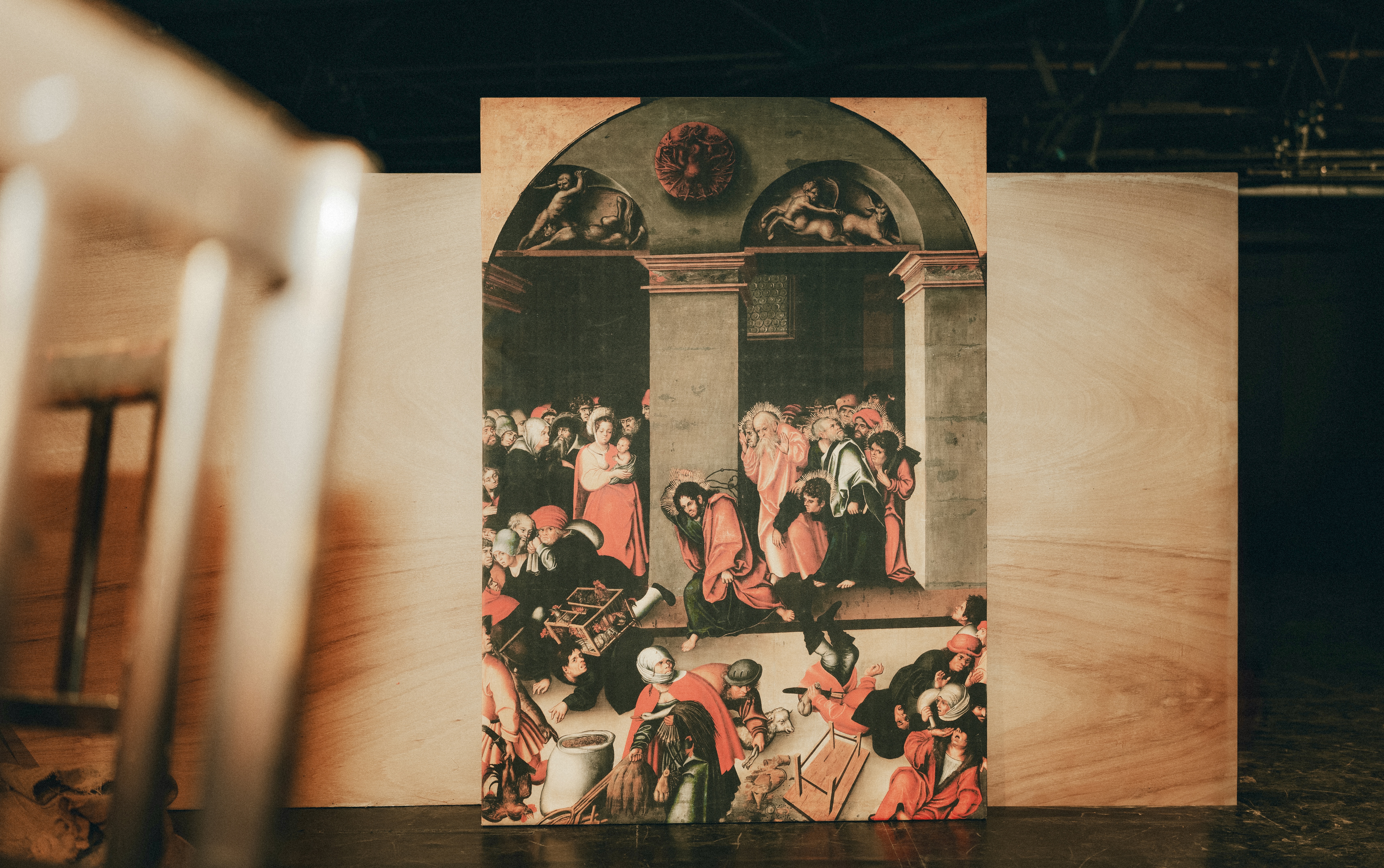 Parce que tout est à tous — pensée scandaleuse —, des hommes et des femmes, paysans, paysannes dans l’Allemagne fangeuse de l’an 1525, comme sorties halluciné·es du Moyen-âge, se soulèvent. Contre les Ducs, les Papes et tous les Princes, ils se soulèvent et soulèvent à eux et elles la vieille poussière des injustices. Un prêtre est parmi elles, eux : c’est Thomas Müntzer. Il est l’un de celles et ceux qui savent dire “Vous ne pouvez pas servir dieu et les riches !”, qui savent rêver la révolution, souffler ce rêve aux persécuté•es, et dont la tête est toujours tranchée pour cela — déclarent la guerre, aux puissants de leur monde, aux puissants de ce monde. Nous racontons cette histoire, que l’Histoire ne raconte pas. Celle d’une Renaissance qui s’éprouve aussi dans les corps en peine, les cris et les colères, sur les toiles qui la disent soudain, et pour toujours : celle d’un temps qui n’est pas accompli, reste encore à venir, et ne perd rien pour attendre. Alors, parce que Tout est à tous, et que cela n’a pas changé, des acteurs et des actrices d’aujourd’hui tentent, de là où ils et elles sont, dans ces habits qu’ils et elles ont découpés, dans leurs colères et leurs peines fabriquées à mains nues, de dire la joie de ces luttes, et qu’elles en valaient la peine, même si la peine est grande. Puisse le désir de retrouver les traces de cette colère, aussi lointaine soit-elle, embrasser encore la nôtre.