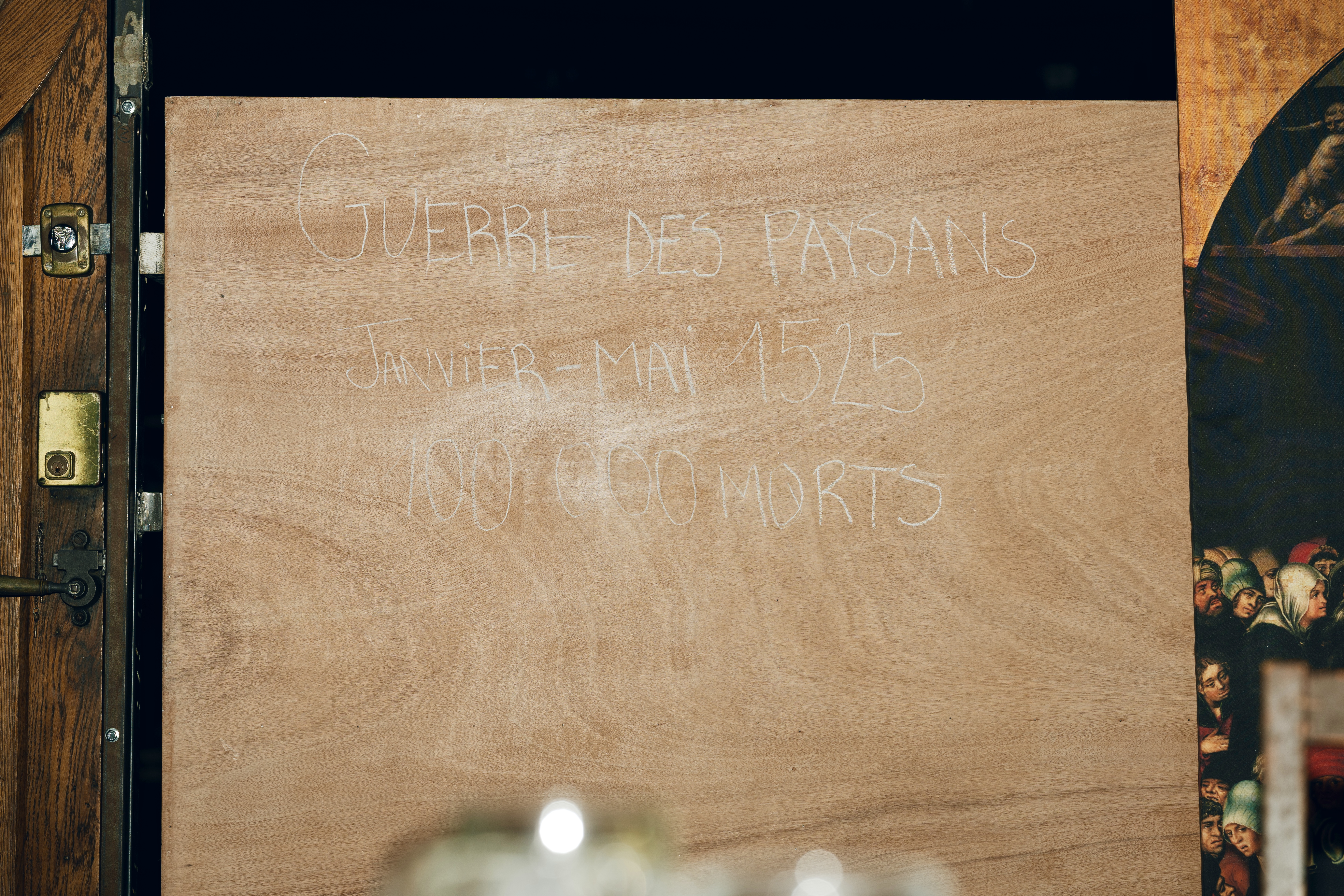Commencer par écouter l’Histoire. Relire d’abord les sermons de Müntzer, les lettres furieuses de Luther, les documents paysans qu’a exhumé Maurice Pianzola. Chercher non à reconstituer l’Histoire, mais à prendre de nos nouvelles. Constater que les nouvelles ne sont pas bonnes. Et puis, puiser dans les textes d’Ernst Bloch, de Walter Benjamin et de de l’historiographie théologique de la Révolution les perspectives à la fois mélancoliques et messianiques propres à faire du passé une matière vivante, toujours vibrante, qui appellent. Et s’en défaire. Arracher à la gangue du savoir la poussière oublieuse : leur trouver des adresses. Lever un lieu : une taverne, où se deale l’art et la mort et se rejoue incessamment les contradictions où la communauté s’affronte à ses désirs, où elle les accomplit aussi. Trouver dans la brume moyenâgeuse des pioches et des pelles capables d’en percer la surface. Voir surgir, depuis cette brume, la Renaissance. Écrire mot à mot cette conquête du sujet. Regarder longuement des toiles : celles qu’ont commis Grünewald, Cranagh, ou Holbein, tant d’autres où pour la première fois le Dieu glorieux avait la peau croutée des corps laborieux, le visage de peine, de la terre sous les ongles. Dresser depuis ce regard le champs de force dans lequel les corps sauront s’arracher eux même pour s’appartenir, appartenir à la commune appartenance d’une humanité égale en dignité, en droits, et en désirs. Recommencer.