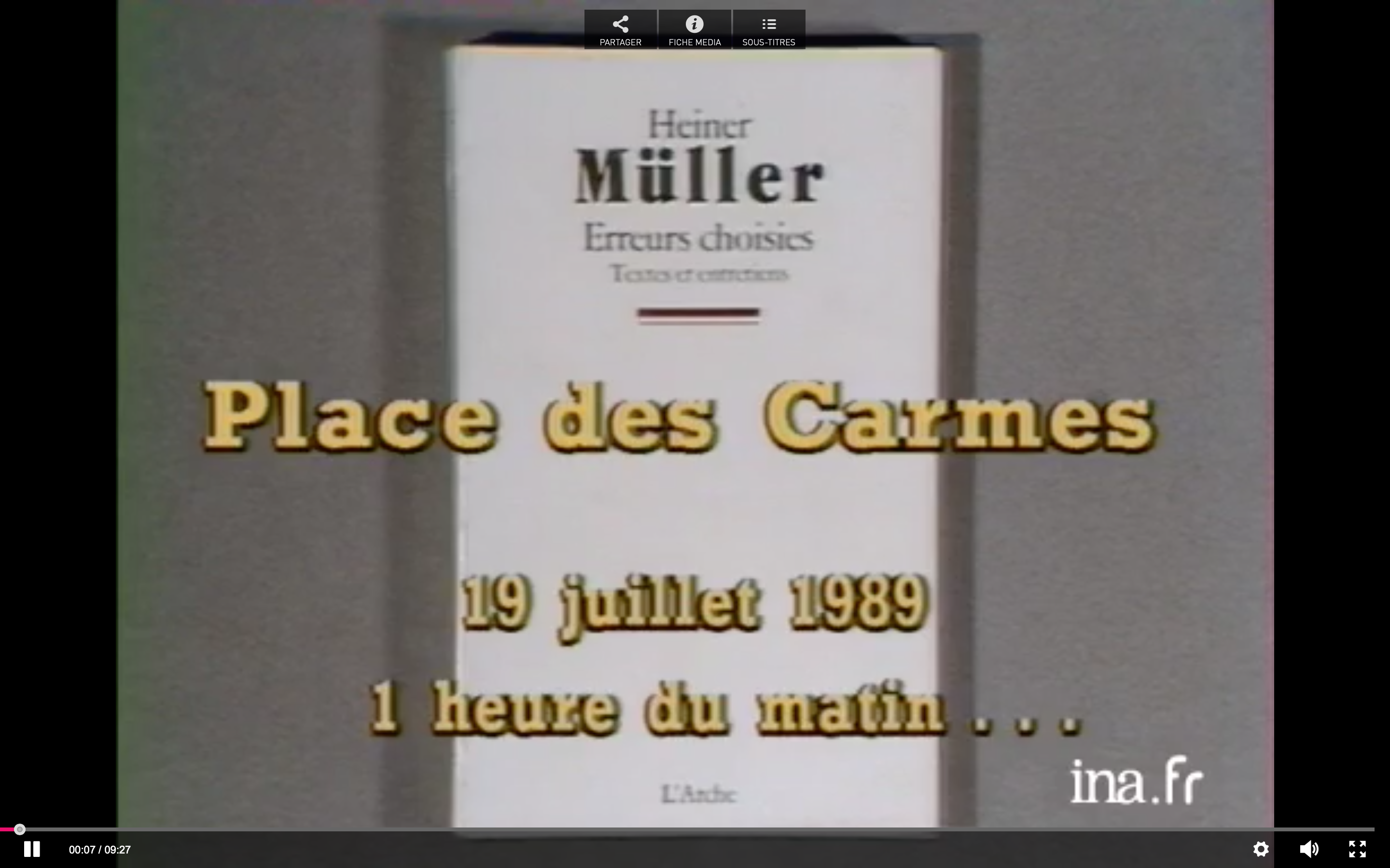 Le 31 juillet 1989, vers la fin du Festival d’Avignon, alors que Matthias Langhoff monte au Cloître des Carmes Un champ de bataille potentiel, spectacle composé de deux pièces ayant pour thème la Révolution française : La Mission d’Heiner Müller et Au perroquet vert d’Arthur Schnitzler, le poète allemand s’entretient à la télévision française. Michel Bataillon traduit. Nous sommes quelques mois avant la chute du Mur de Berlin.