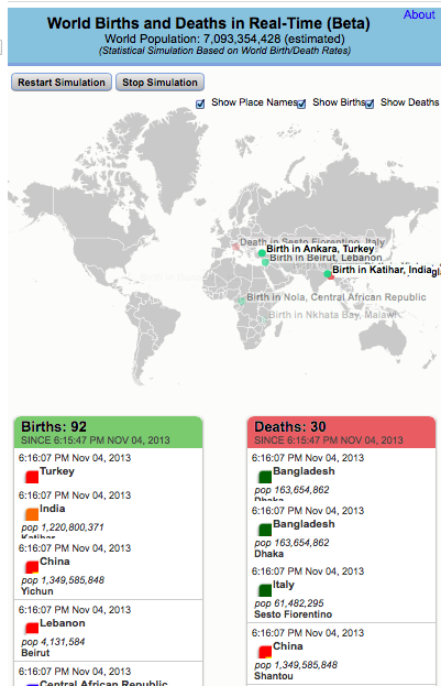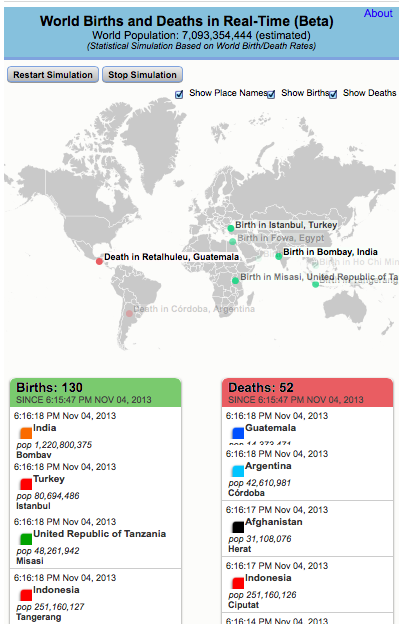 Un américain, mathématicien, savant, a réalisé l’an dernier une carte des États-Unis en modélisant une simulation des naissances et des morts, simple établissement statistique, j’imagine que ce n’est pas le plus dur : suffit de calculer le nombre total de naissances et de morts par an, et de le ramener à son quota par jour, heure, minute, seconde, et on fait jouer un algorithme aléatoire pour faire défiler les chiffres sur une carte. C’est là que le vertige prend naissance, évidemment : sur la carte.