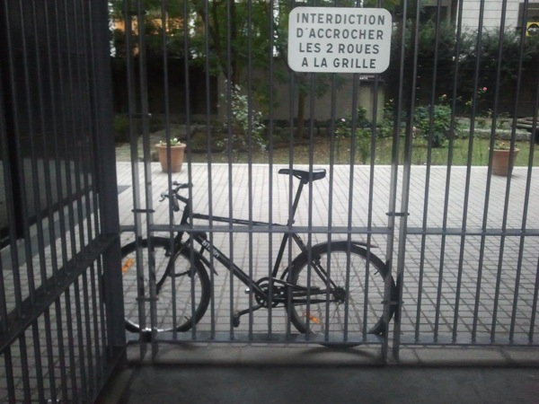 Interdictions de la ville : énoncées pour le seul plaisir de les contourner, peut-être. Sur la route des Grands Moulins, ce duo posé sur l’interdiction, l’un à côté de l’autre, et pour la seule beauté du geste, on dirait – seulement parce que le panneau l’interdit, à cet endroit précis. Non, l’interdiction n’aura pas été apposée dans la journée, précisément pour eux : mais c’est comme si l’interdiction avait appelé son défi. Image qui déborde son cadre – sous le signe qui l’interdit, le geste qui souligne sa vacuité ; là où on désigne l’impossibilité du monde, c’est là même qu’on le crée, joyeusement : c’est là peut-être seulement où sa fabrication est seule possible ? En passant, avec le sourire de celui qui assiste à ces contre-lois qui dérèglent sans le renverser l’ordre tranquille du monde, je pense à l’enjambement, moi qui n’ai jamais fais de l’illicite une valeur suffisante. Je pense à l’enjambement, qui franchit mais établit un autre équilibre, une autre loi, propre à son rythme interne. Tout contre la grille, des lois s’inventent à l’envers de la loi énoncée du dehors. Tandis que sur ma gauche, pendant cette seconde de rêverie inutile qui fit presque ma journée, coule la Seine.