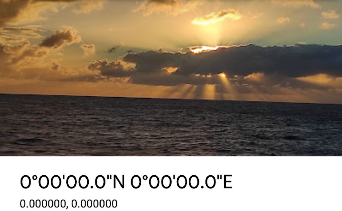 La position zéro latitude, zéro longitude renvoie donc à la fameuse île Nulle, îlot de données plutôt que sous-continent à la dérive : île théorique basée sur le système géodésique mondiale de 1984 — WGS84 —, système de référence utilisé pour modéliser la Terre et devenu la norme en matière de défense pour le système de positionnement global, ce fameux GPS qui nous indique le sens de la vie dans nos circulations.