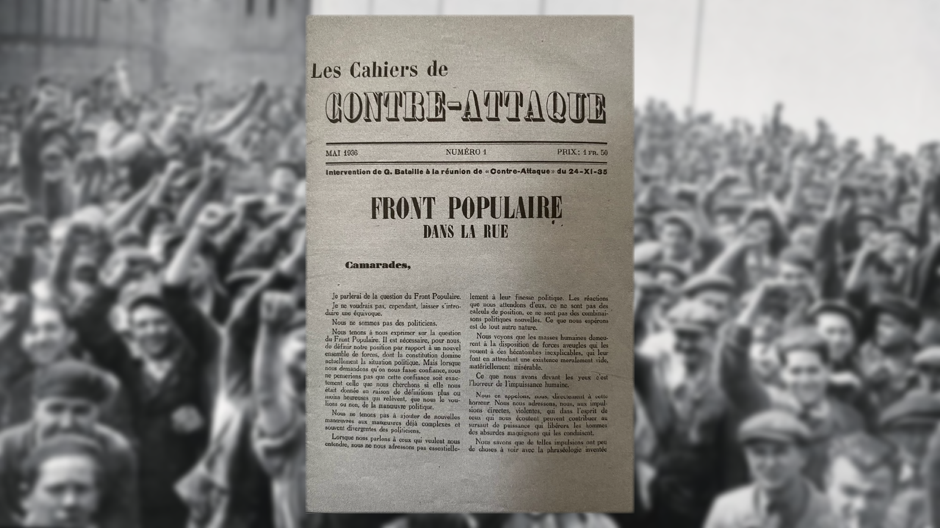 Intervention de Georges Bataille le 24 novembre 1935, au sein du groupe Contre-Attaque né en octobre 1935, et issu de l’Union de lutte des intellectuels révolutionnaires, auquel prennent part, outre Georges Bataille, André Breton, et d’autres surréalistes comme Paul Eluard ou Benjamin Péret. Le groupe est « fondé en vue de contribuer à un développement brusque de l’offensive révolutionnaire ».