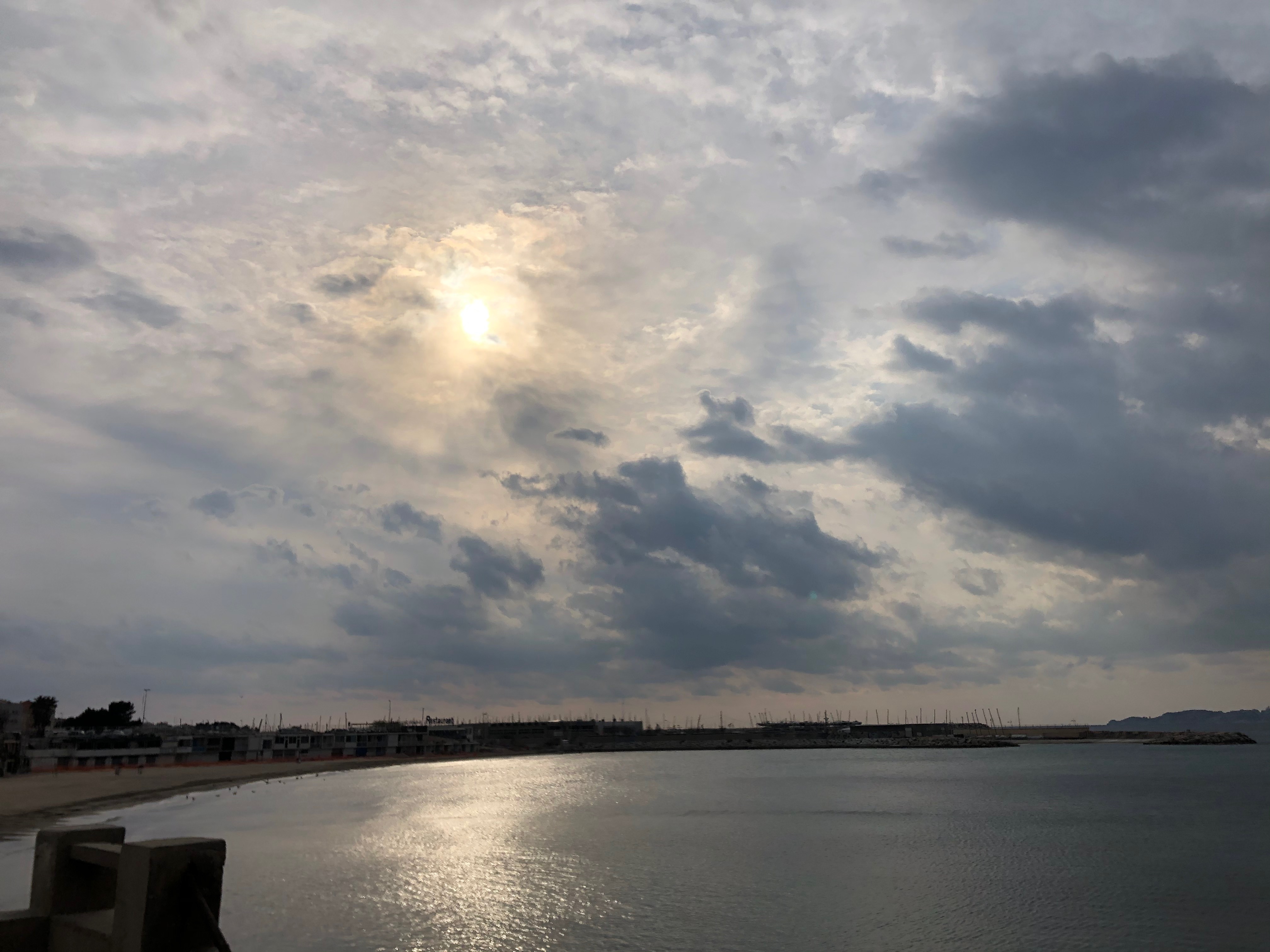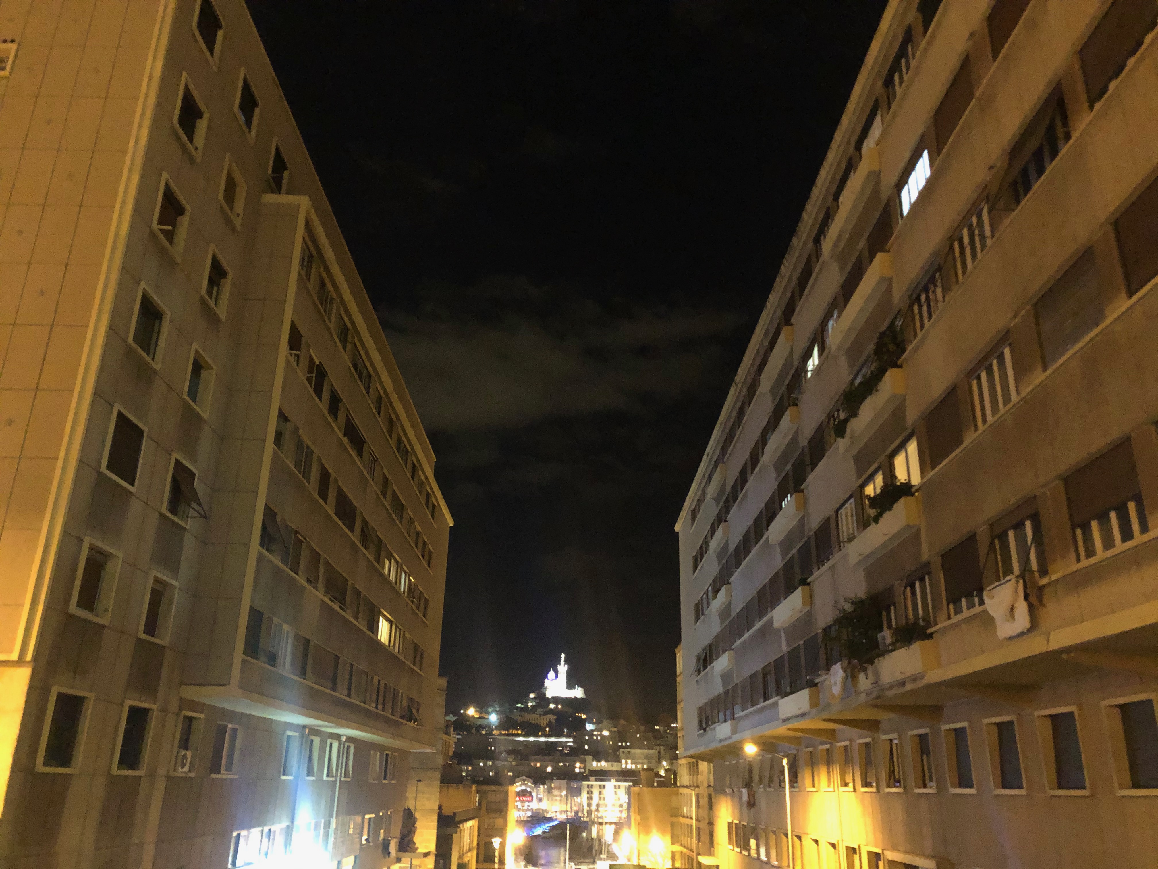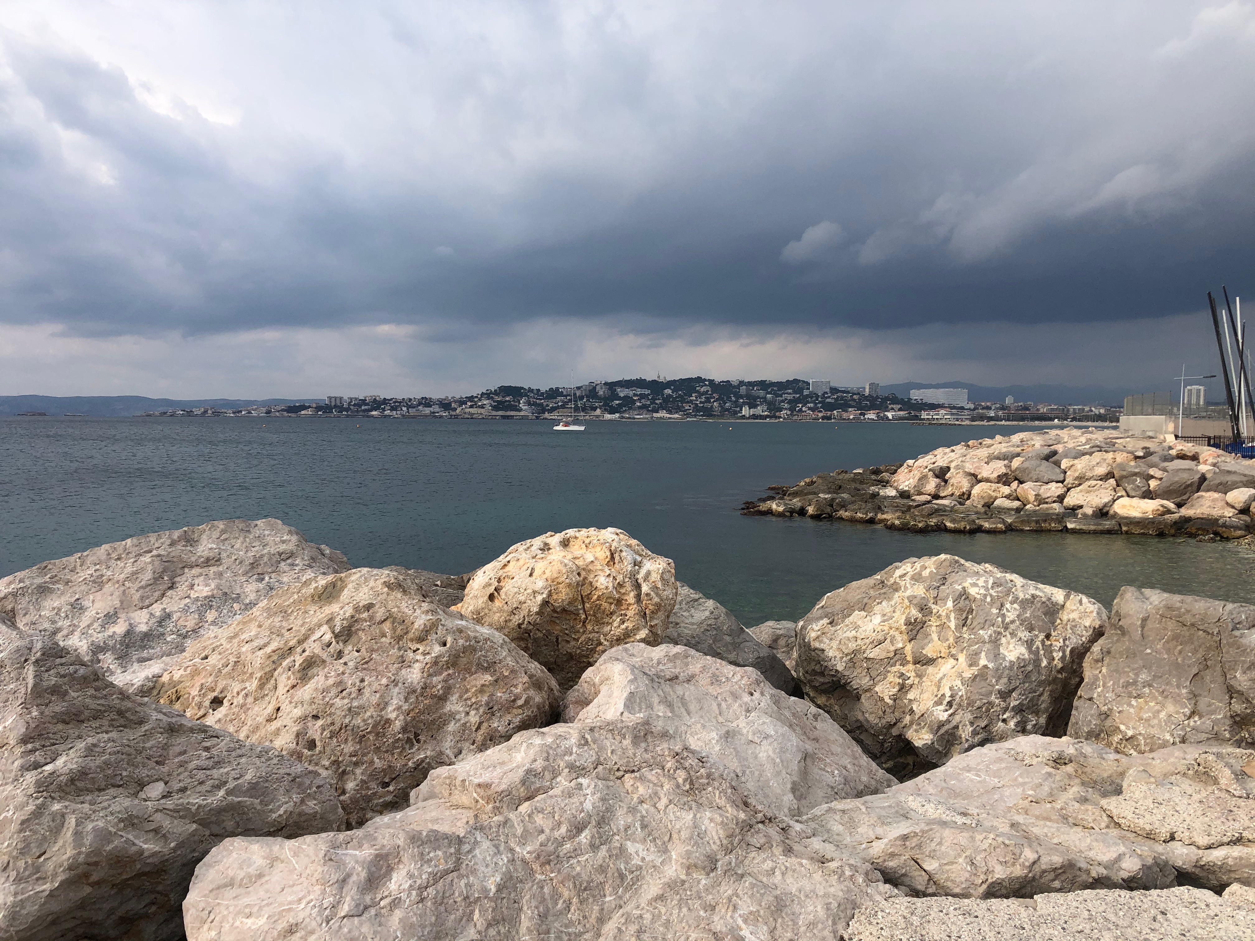 Mon bref déplacement à proximité du domicile m’emmène malgré tout assez loin, dans ce parking qui donne sur le large. Depuis hier, un bateau a jeté l’ancre, ici. On voit l’horizon. Il n’est pas tant désirable. Ce qui l’est, et davantage, c’est la lumière sur la ville, et comme elle change dans le temps plein des pluies à venir.