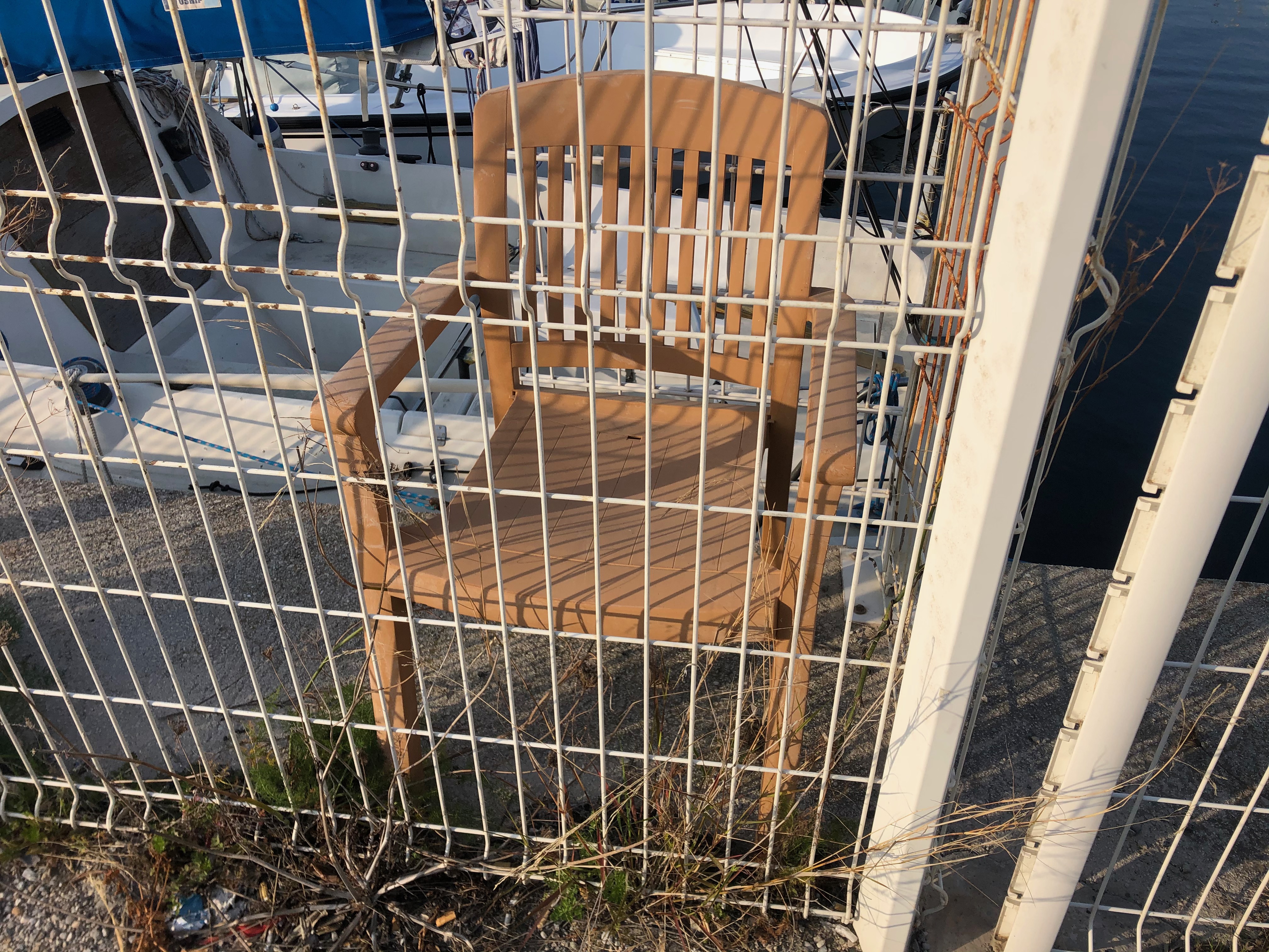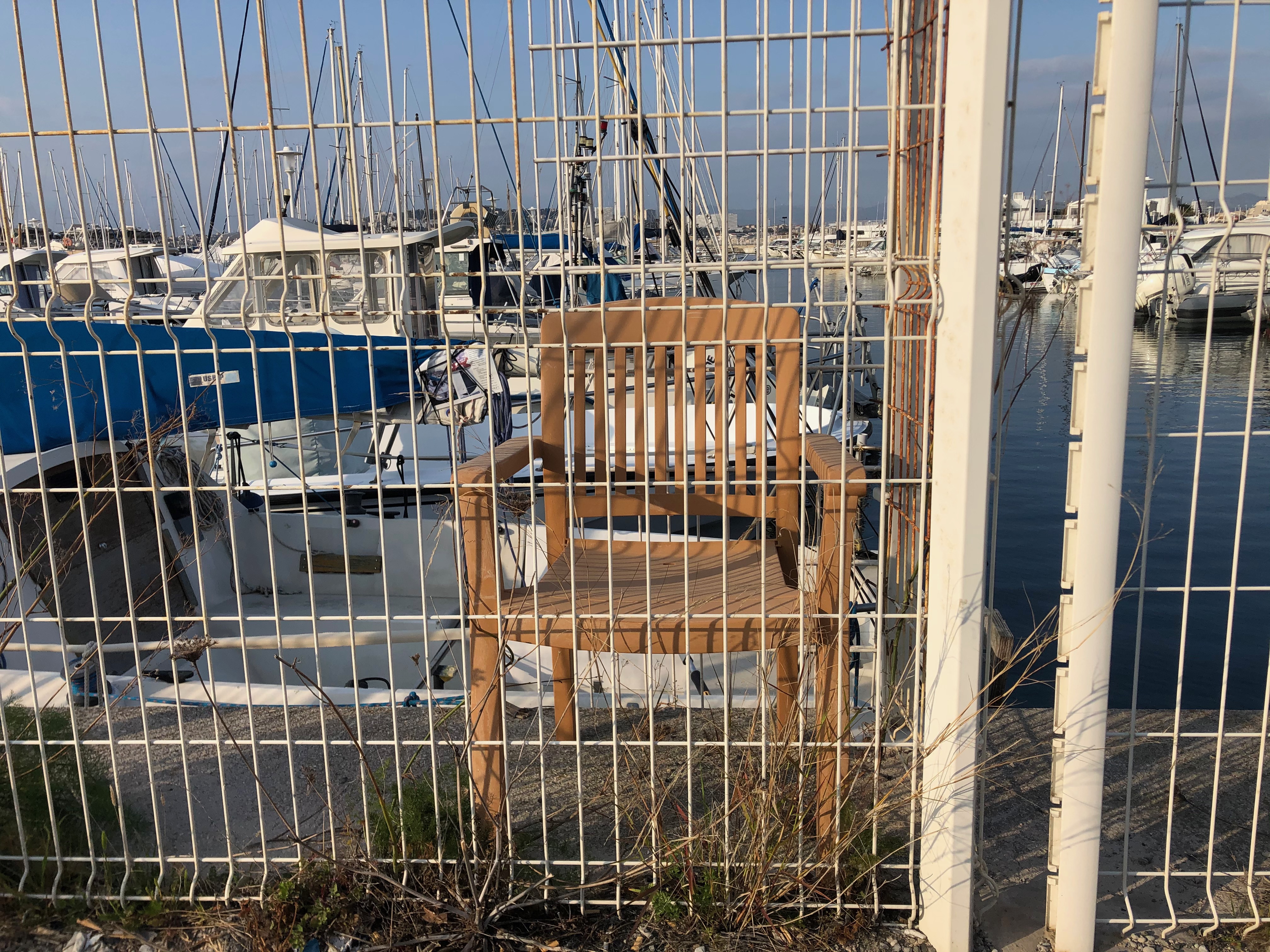 La place qu’on occupe : dans le port déserté au sud de la ville, très loin du dernier parking où ne s’aventurent pas encore les patrouilles, cette chaise. Le mystère, c’est la grille qui l’entoure. Peut-être que le repos existe partout où il se donne. Mais là ? Le mystère, c’est aussi qu’elle est dos tourné à la mer, vue imprenable sur les hangars. Le mystère, c’est d’être face à elle, aujourd’hui, et de penser à Florence, à Bergame.