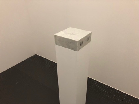 À l’étage, cette œuvre. Un bloc de marbre, qu’on peut ouvrir comme un livre. Dans chacune des parois, un vide a été creusé. Lorsque le bloc est fermé, il contient ainsi en son centre un vide d’un centimètre carré. Par une nuit sans lune, Chrbel-Joseph H. Boutros a transporté son bloc de marbre au cœur d’une forêt. Il l’a ouvert pour que la nuit s’y dépose. Puis refermé : un centimètre carré de cette nuit a donc été capturée.