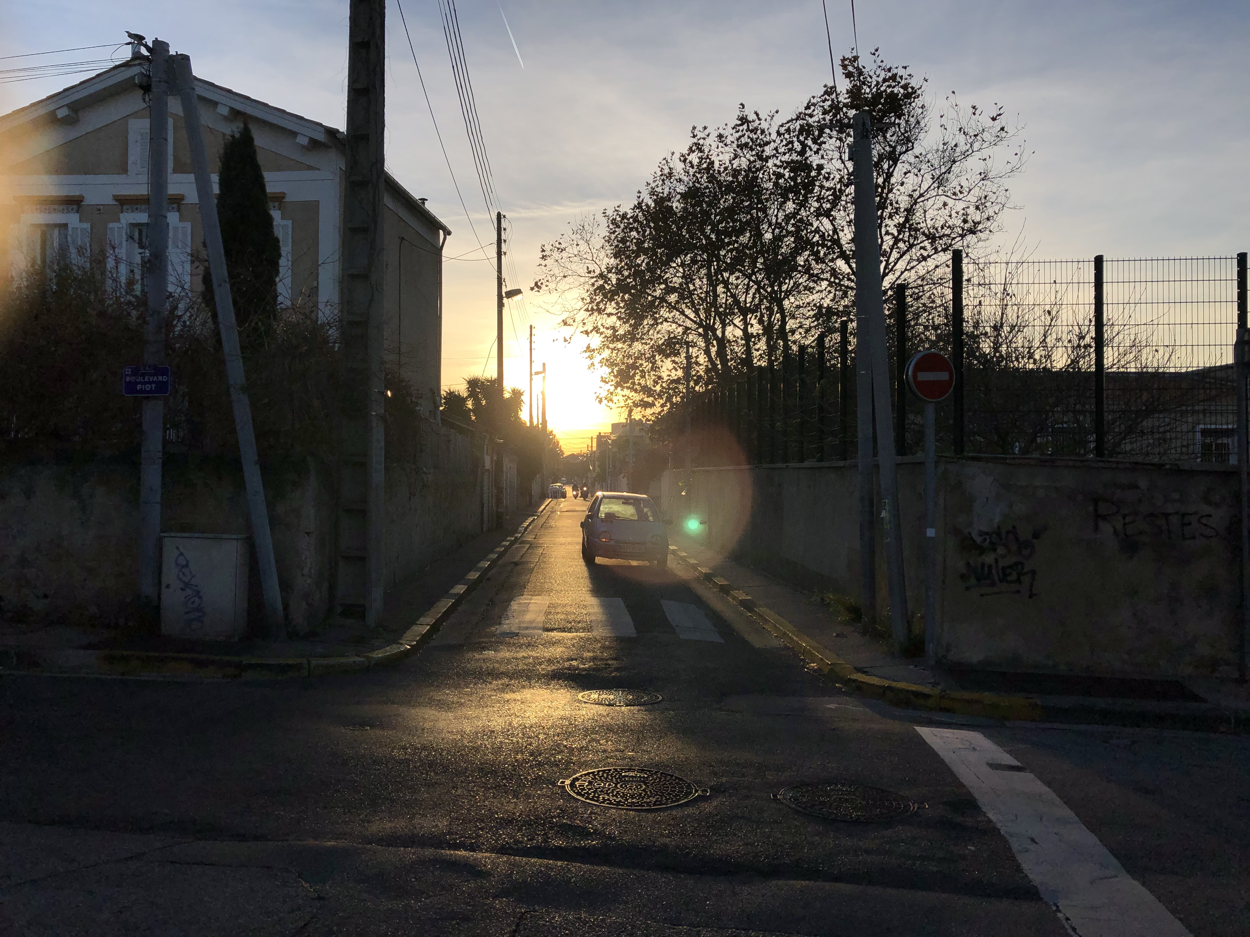 En rentrant ce soir-là, le soleil tombe à la vertical de la rue qui s’enfonce depuis chez moi : suis-je d’ici ? Vers où tout cela tombe, s’effondre. S’échappe.