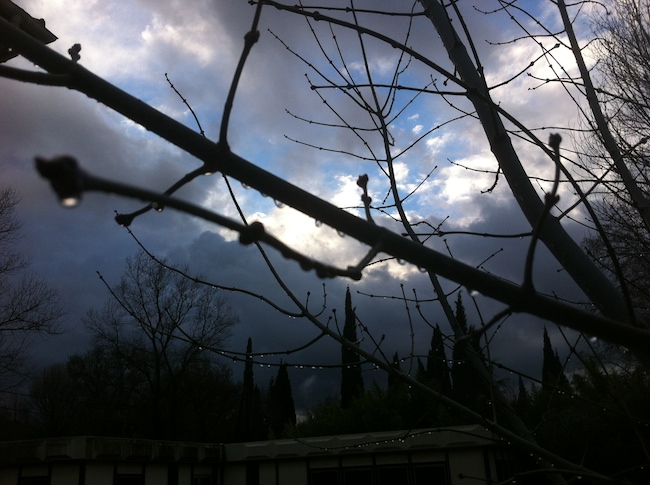 c’est en sortant du café, le ciel ouvert en deux, comme du miracle éparpillé, de l’eau partout sur de la lumière humide.