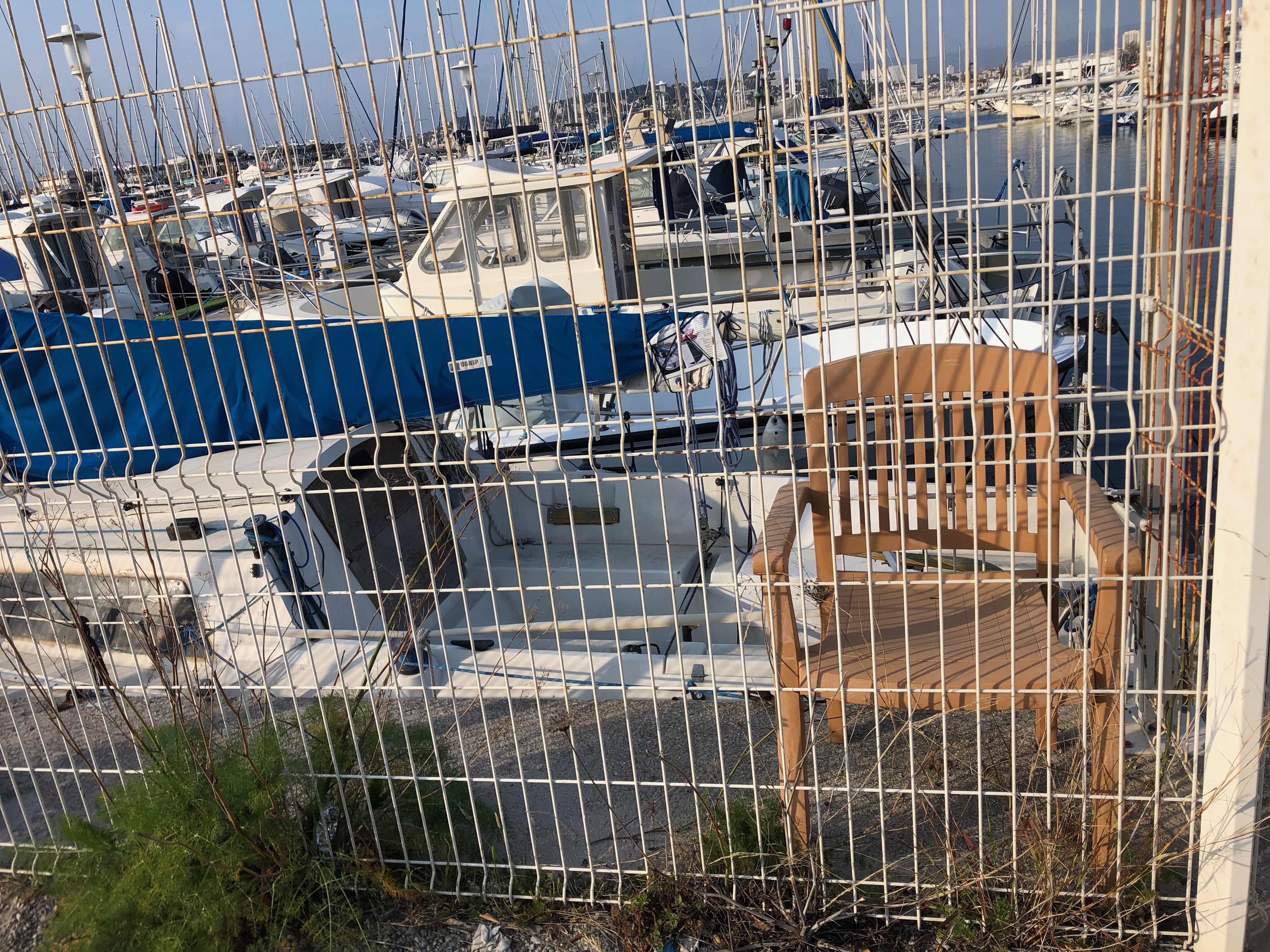 La place qu’on occupe : dans le port déserté au sud de la ville, très loin du dernier parking où ne s’aventurent pas encore les patrouilles, cette chaise. Le mystère, c’est la grille qui l’entoure. Peut-être que le repos existe partout où il se donne. Mais là ? Le mystère, c’est aussi qu’elle est dos tourné à la mer, vue imprenable sur les hangars. Le mystère, c’est d’être face à elle, aujourd’hui, et de penser à Florence, à Bergame.