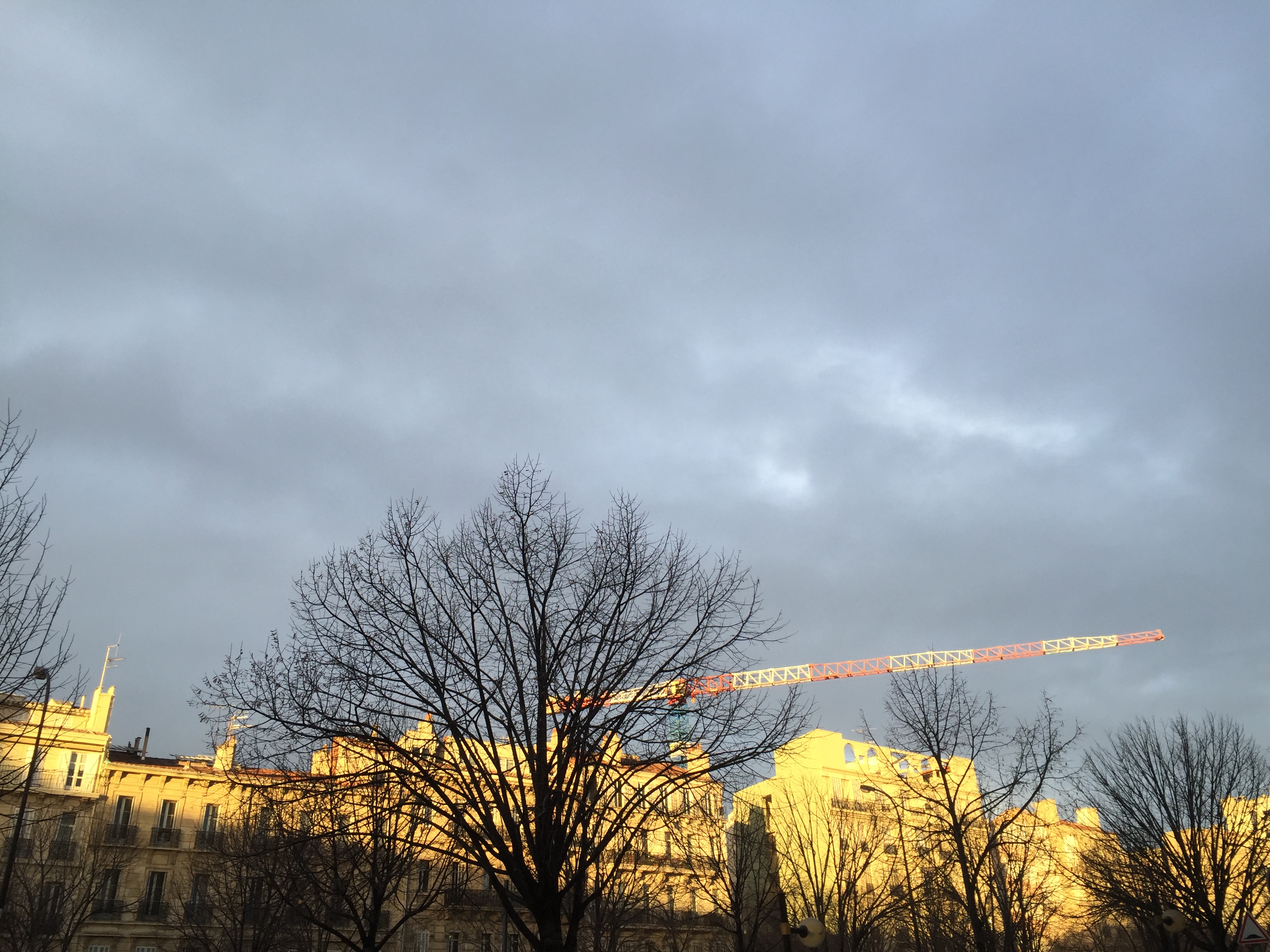 Marseille est une ville impossible. Ils lèvent cette ville comme du ciel. Par pelletées de nuages et en écrivant sur tous les murs des lettres dans le désordre. La mer touche un peu de la montagne, ou est-ce l’inverse ? Il y a des routes qui longent des routes, et plusieurs centres que rien ne relie. Il y a ce type près d’ici, tout près de l’endroit où je prendrai l’image de cette grue par-dessus l’arbre qui retient les dernières feuilles de l’automne, au cœur de l’hiver, ce type qui dort par terre et tous les matins lit le journal en commentant les nouvelles, à haute voix. Il y a cette femme tout à l’heure qui frappait à la porte de l’immeuble juste à côté de lui, qui frappait doucement, doucement, peut-être depuis une demi-heure, peut-être depuis des heures, et quand je suis parti, qui frappait encore, doucement, le regard terrible.