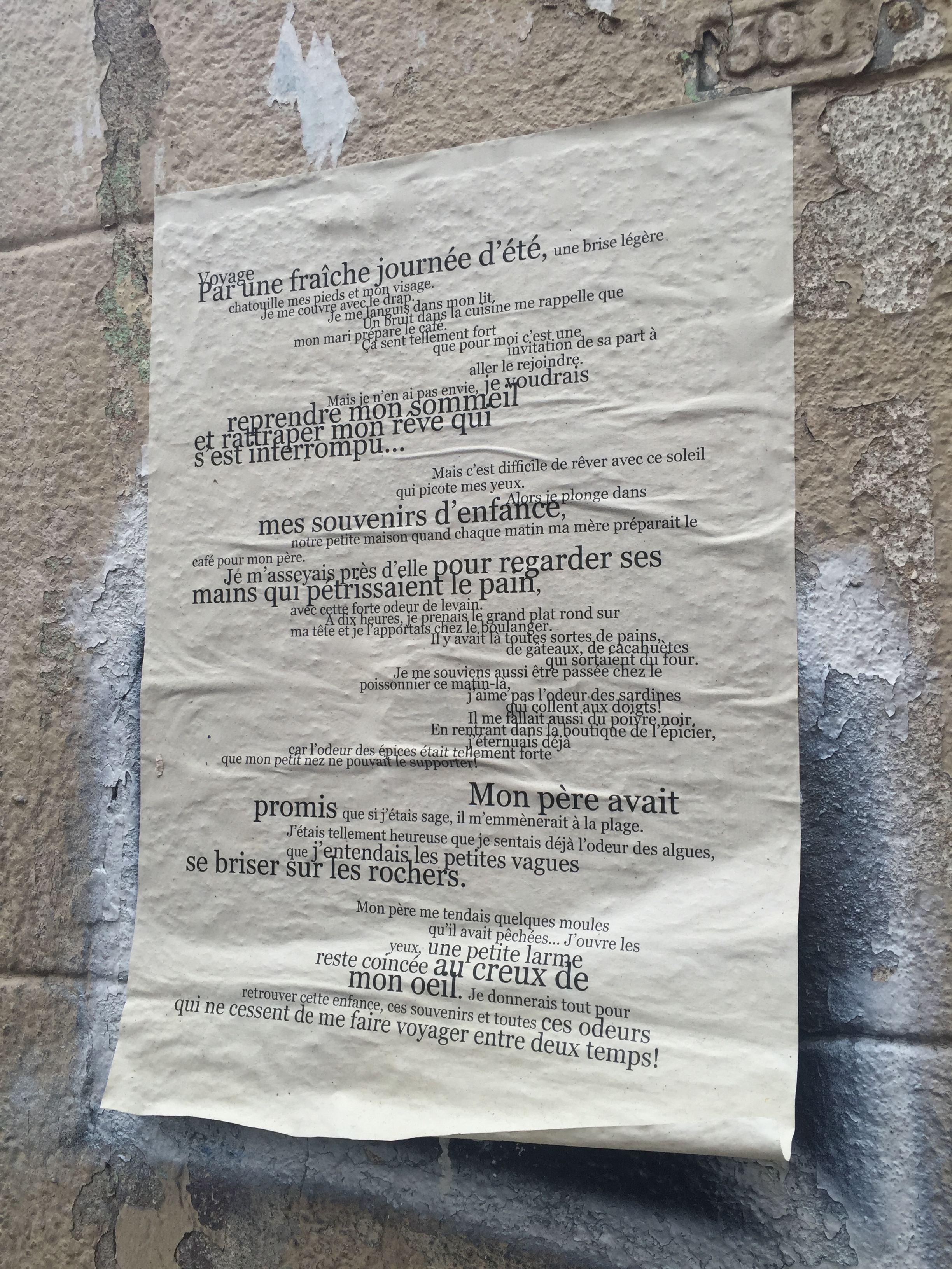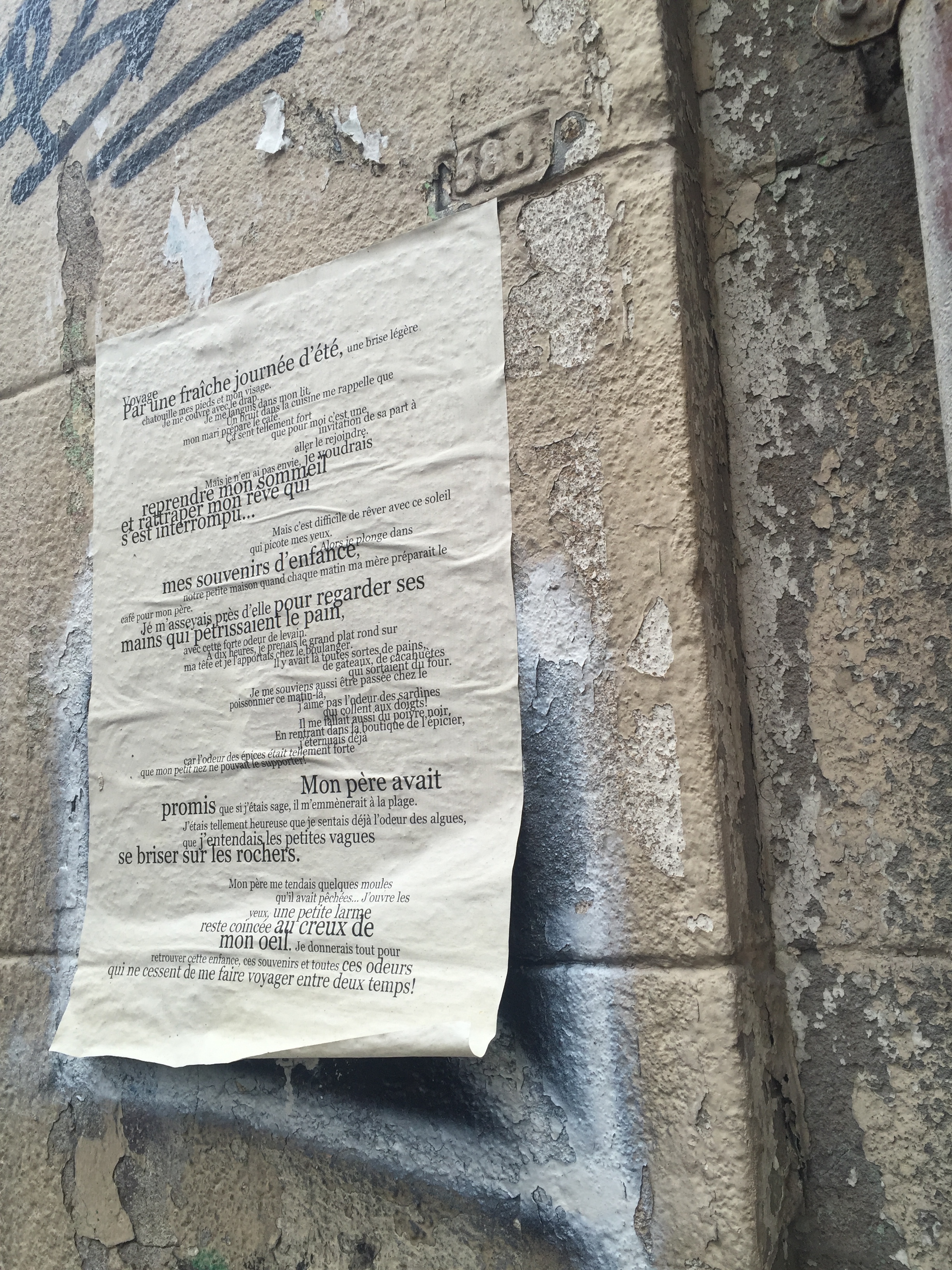 Sur un mur, derrière l’Alcatraz, ces affiches. Je les prends sans les lire : je les lirai sur l’écran. C’est comme cela que je lis le ciel aussi, et le monde. Dans la distance, dans le proche, le différé, le temps repris, réinventé, d’un temps nocturne, le seul possible désormais que le jour je cours après lui.