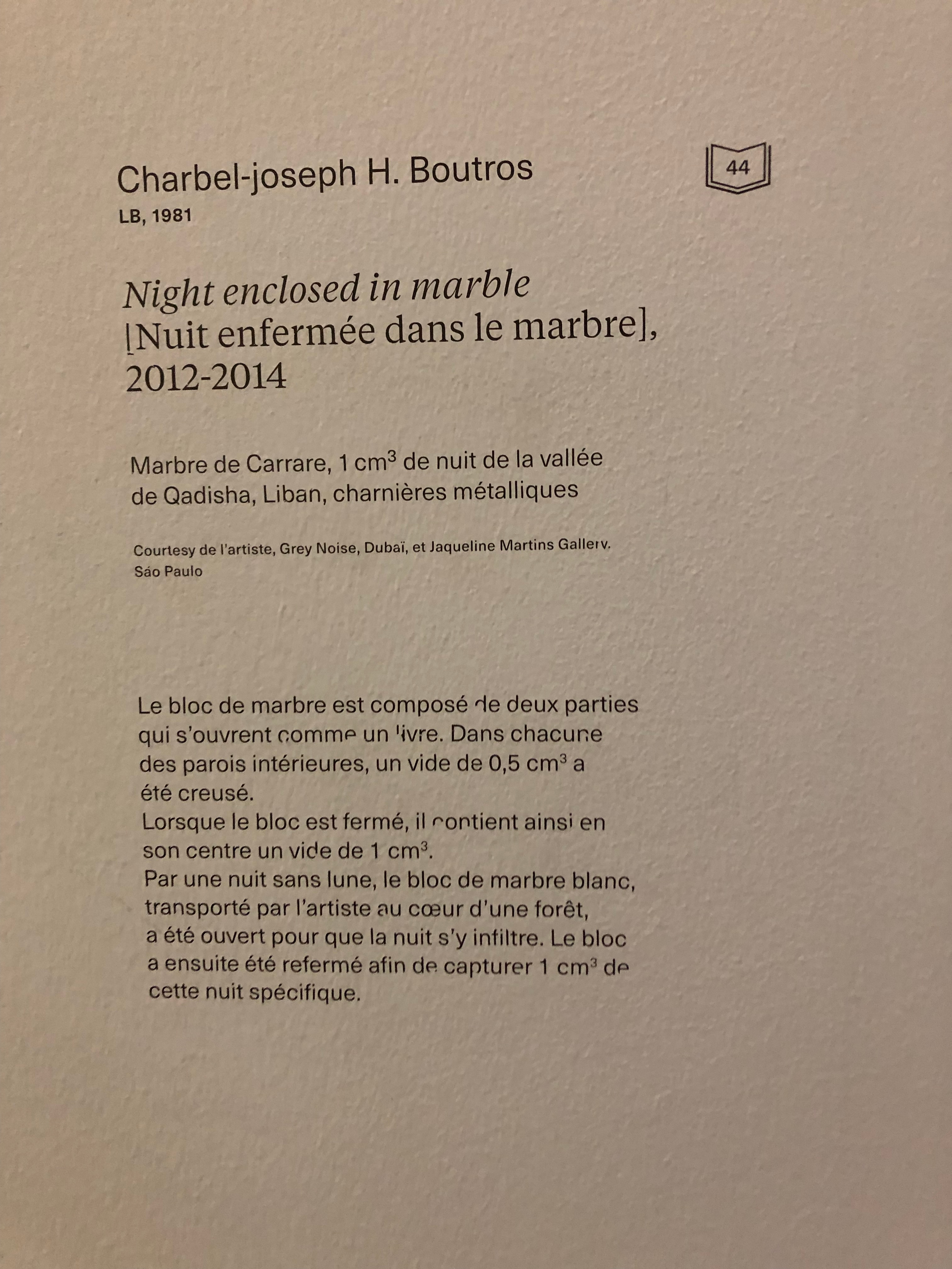 À l’étage, cette œuvre. Un bloc de marbre, qu’on peut ouvrir comme un livre. Dans chacune des parois, un vide a été creusé. Lorsque le bloc est fermé, il contient ainsi en son centre un vide d’un centimètre carré. Par une nuit sans lune, Chrbel-Joseph H. Boutros a transporté son bloc de marbre au cœur d’une forêt. Il l’a ouvert pour que la nuit s’y dépose. Puis refermé : un centimètre carré de cette nuit a donc été capturée.